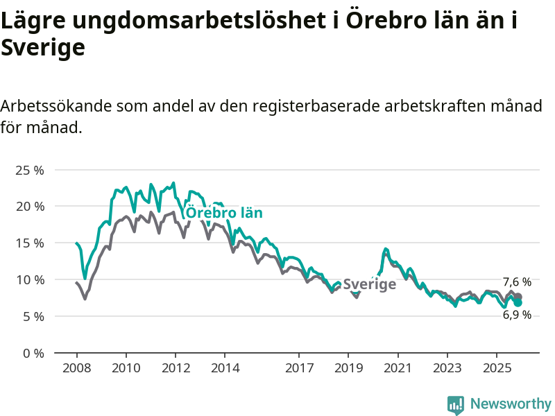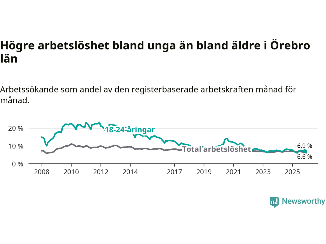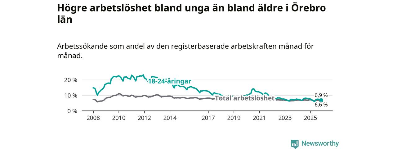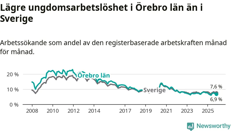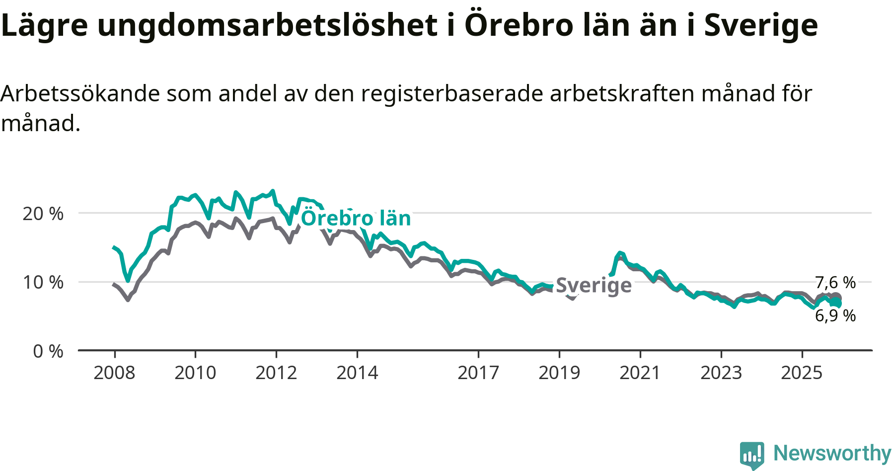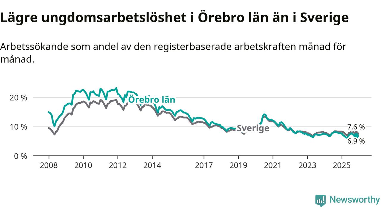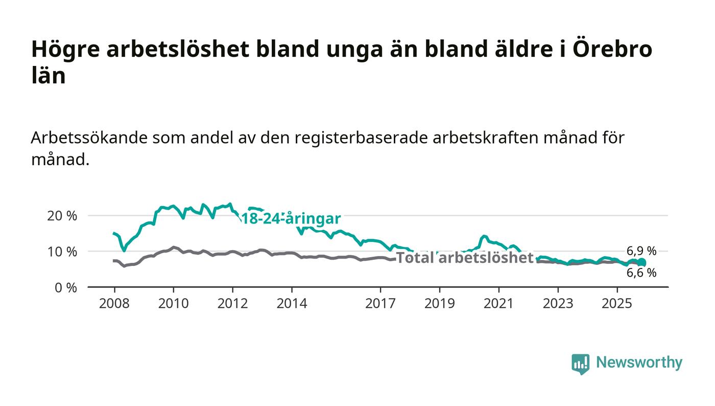 Medan Örebro har ungefär samma total arbetslöshet som Sverige, ligger ungdomsarbetslösheten 0,7 procentenheter lägre i Örebro.