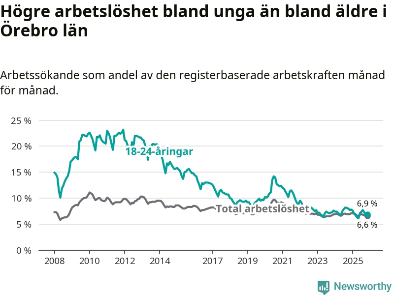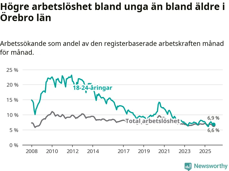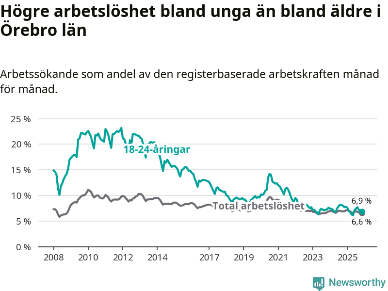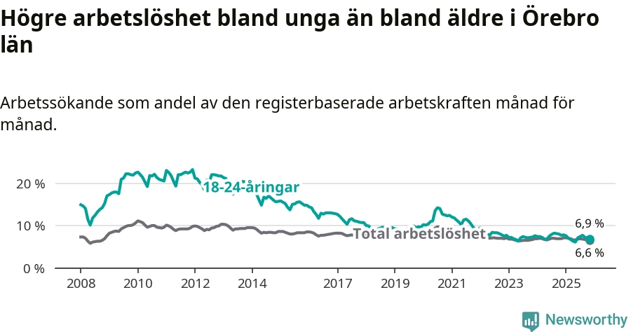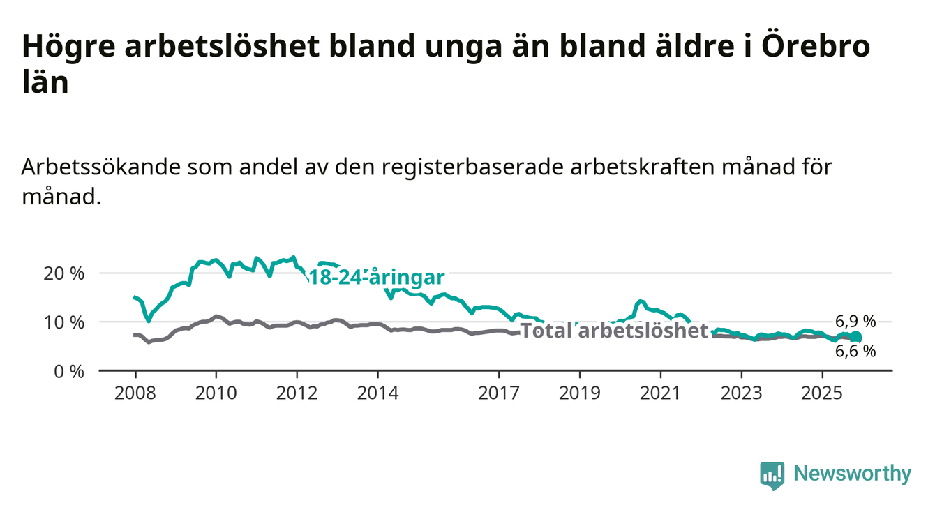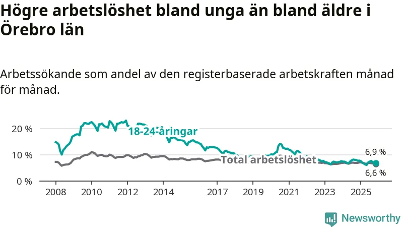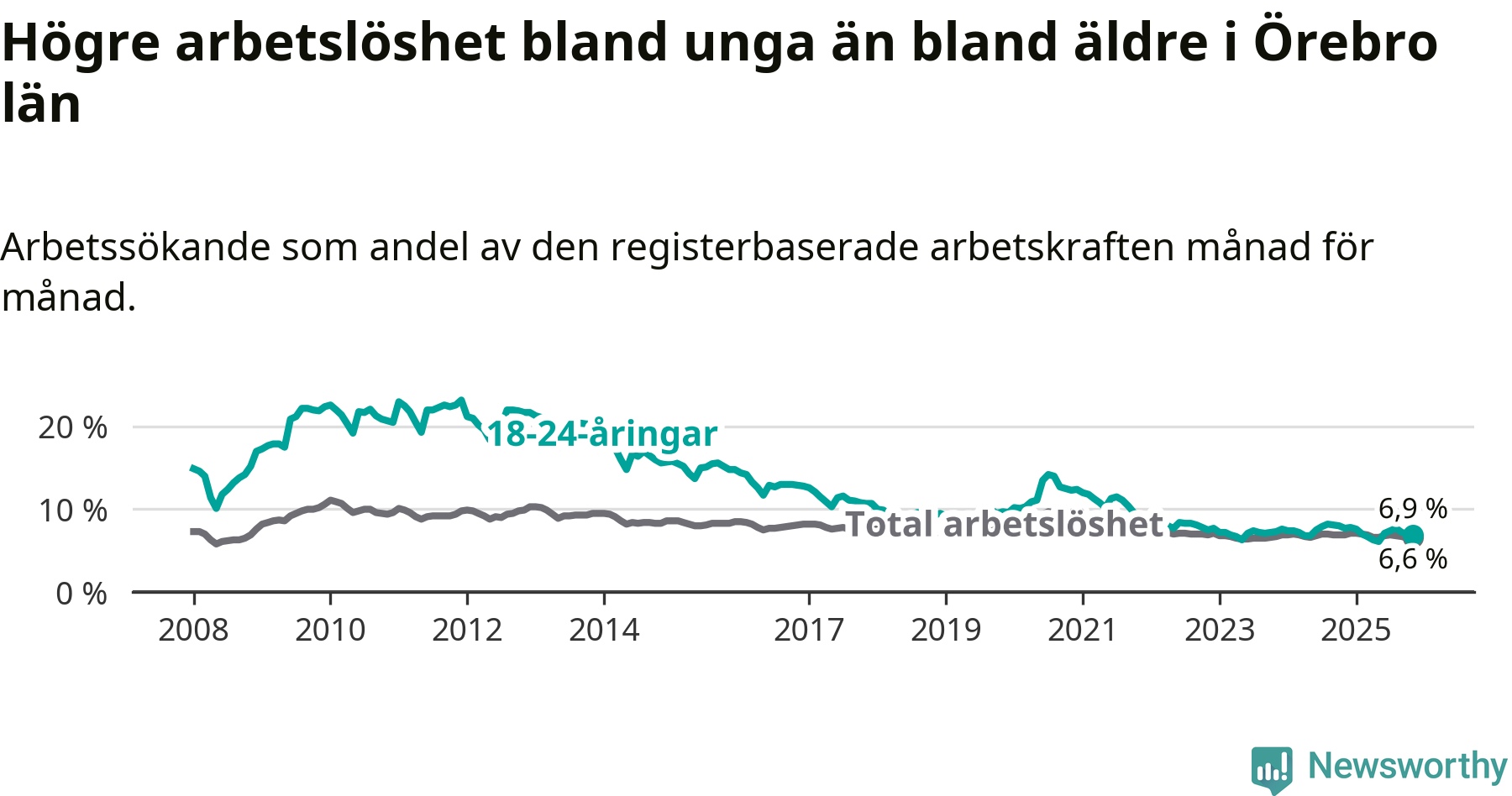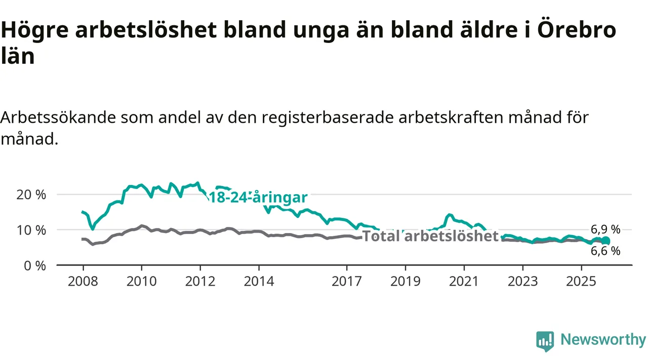 Medan Örebro har ungefär samma total arbetslöshet som Sverige, ligger ungdomsarbetslösheten 0,7 procentenheter lägre i Örebro.