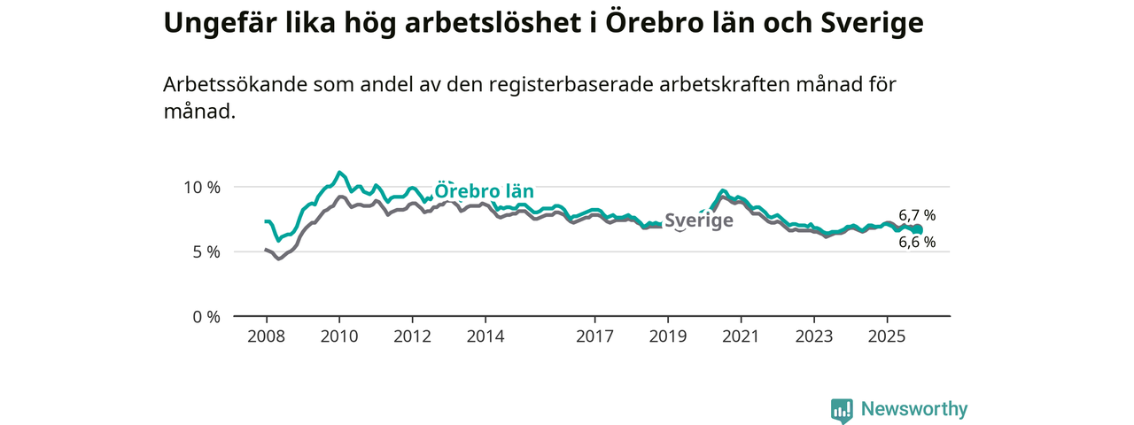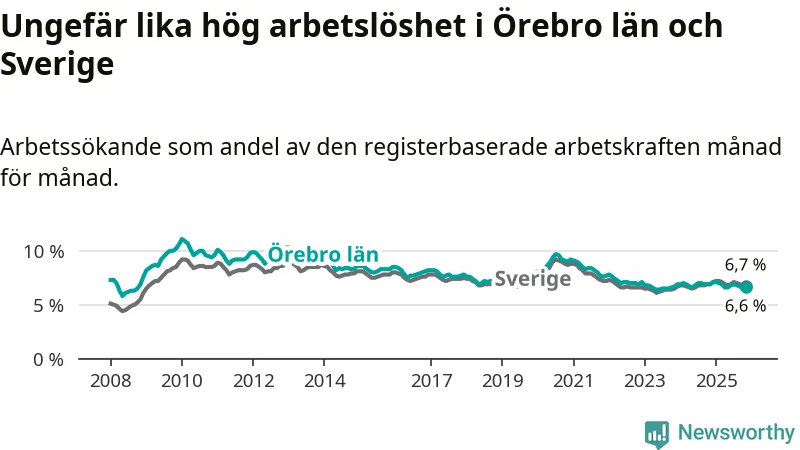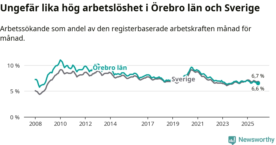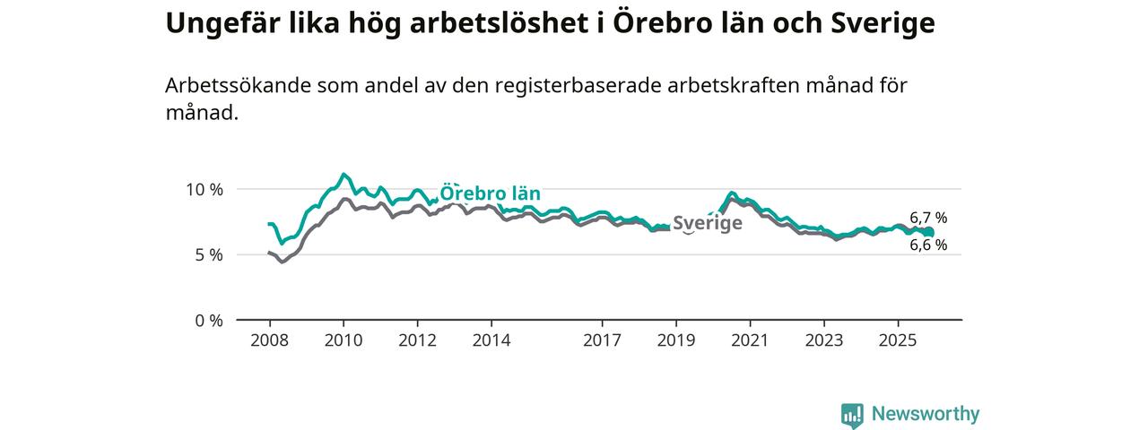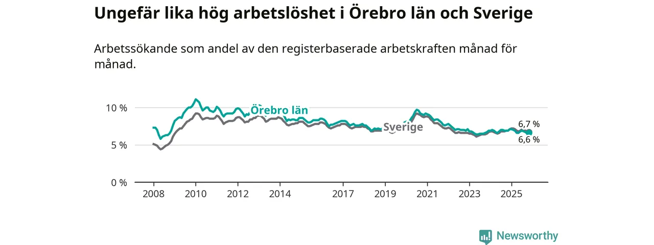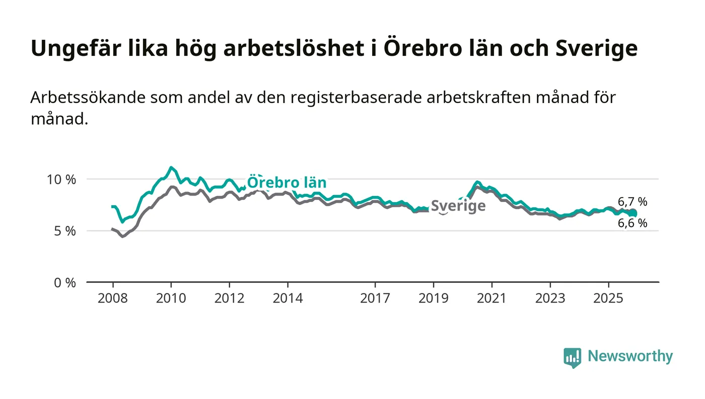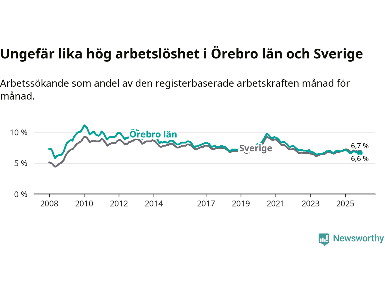 Under november månad rapporterade Örebro län en total arbetslöshet på 6,6 procent. Det är en minskning jämfört med samma tidpunkt i fjol (−0,3 procentenheter). Även i Sverige sjunker arbetslösheten .