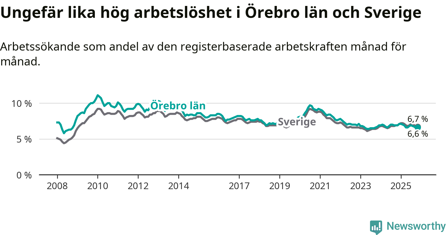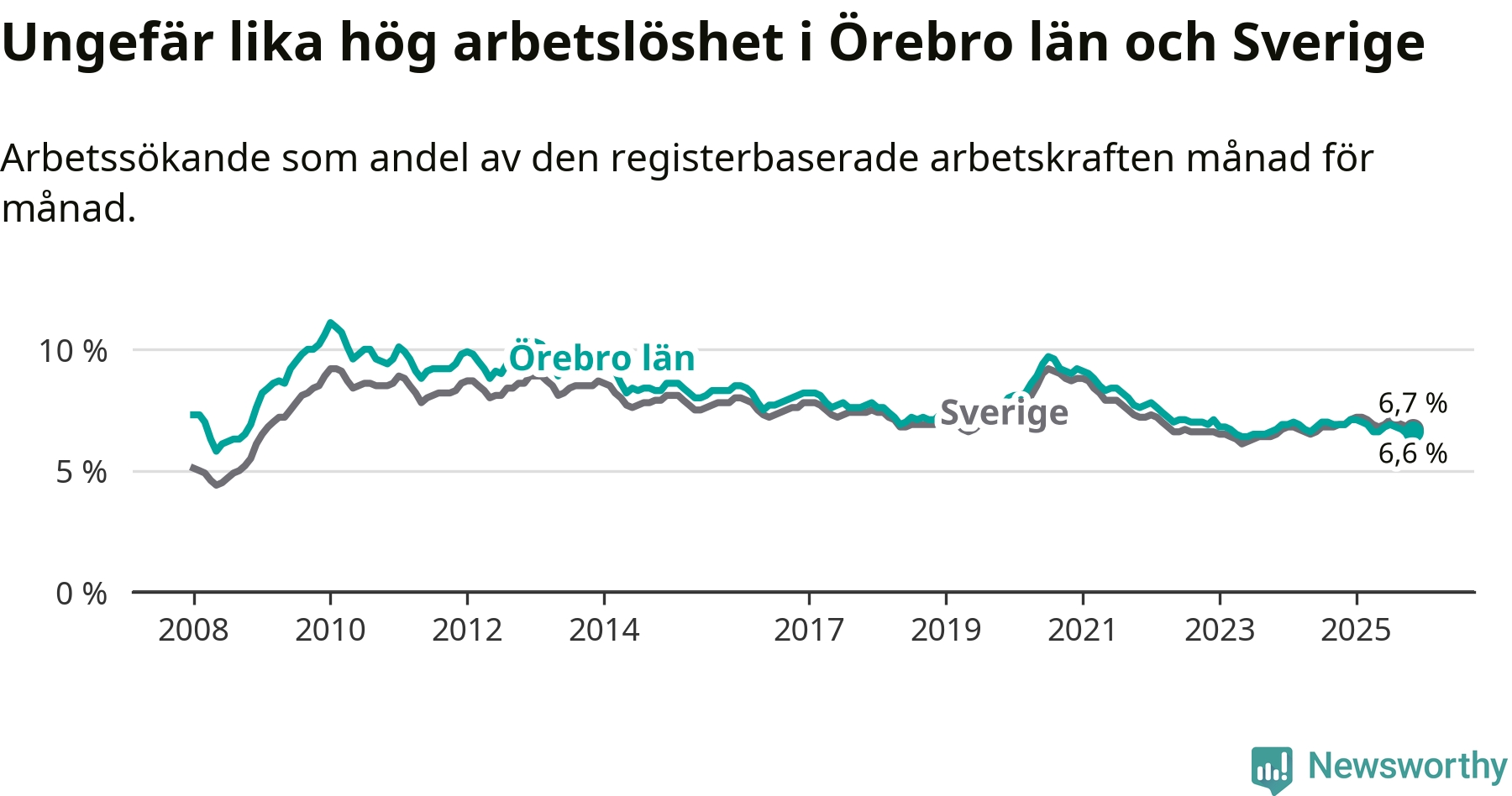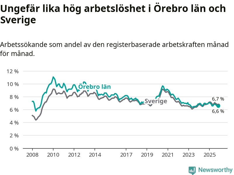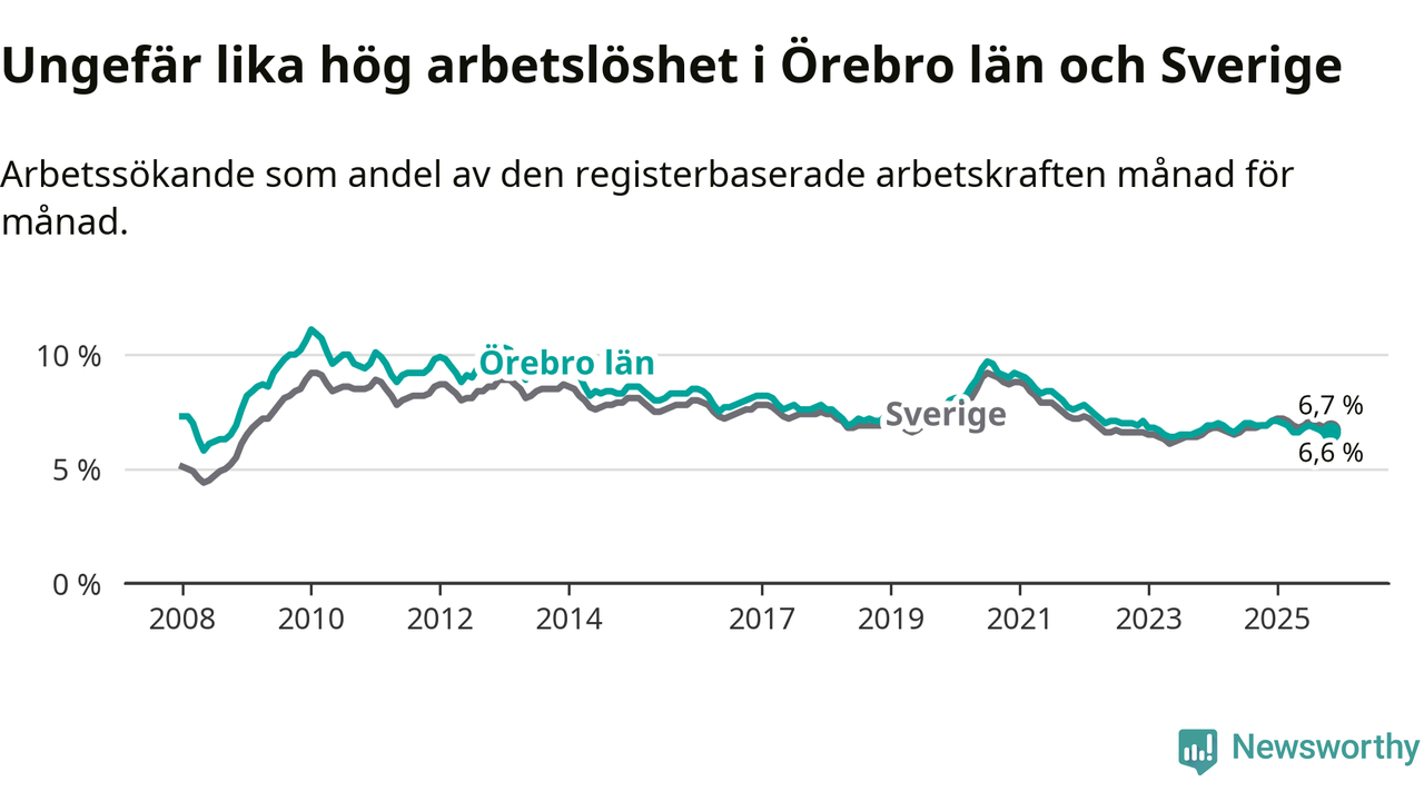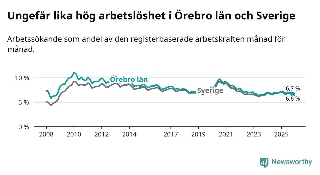 Under november månad rapporterade Örebro län en total arbetslöshet på 6,6 procent. Det är en minskning jämfört med samma tidpunkt i fjol (−0,3 procentenheter). Även i Sverige sjunker arbetslösheten .