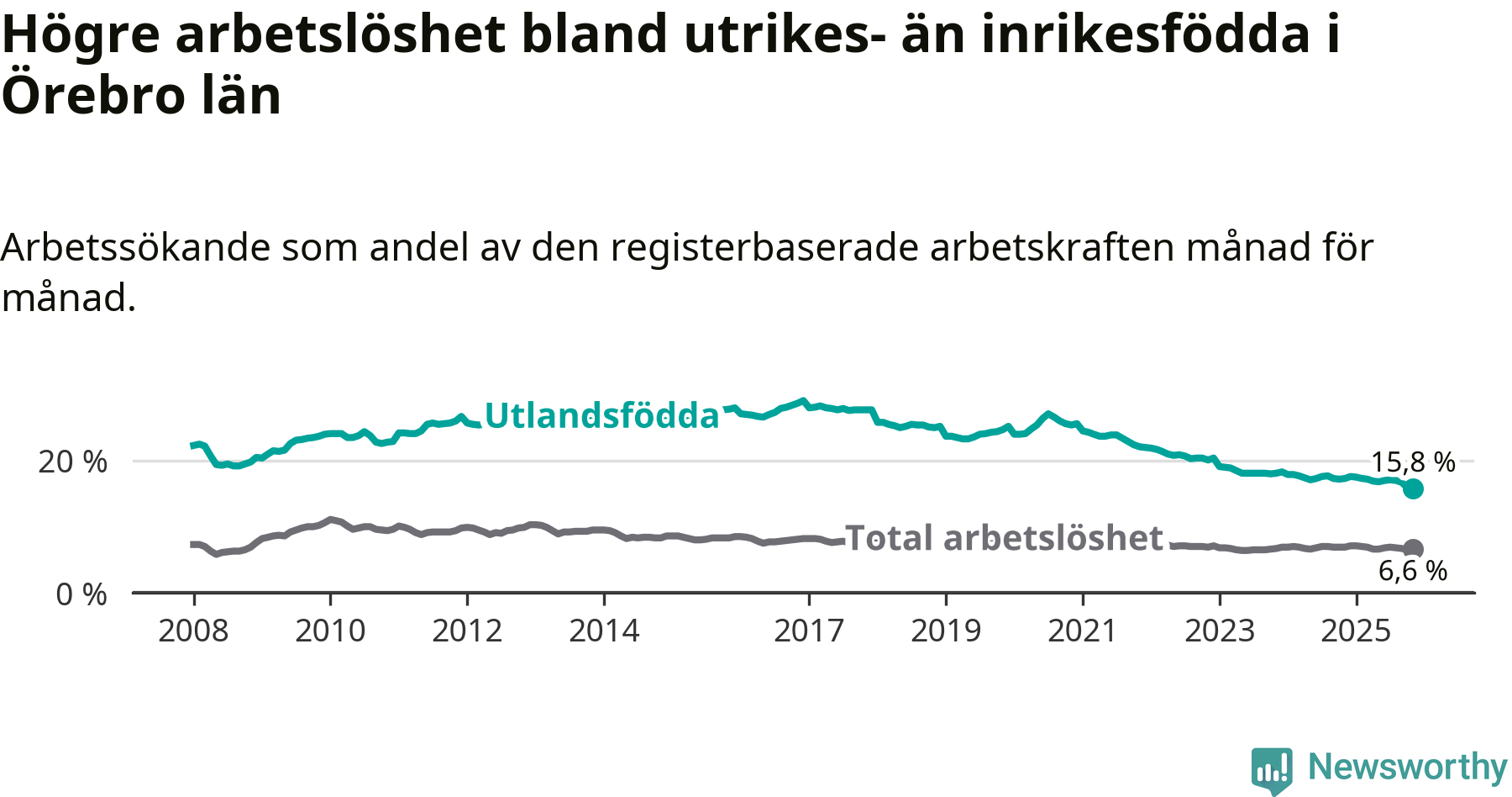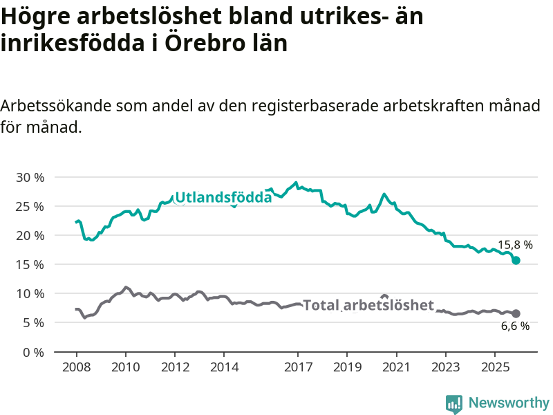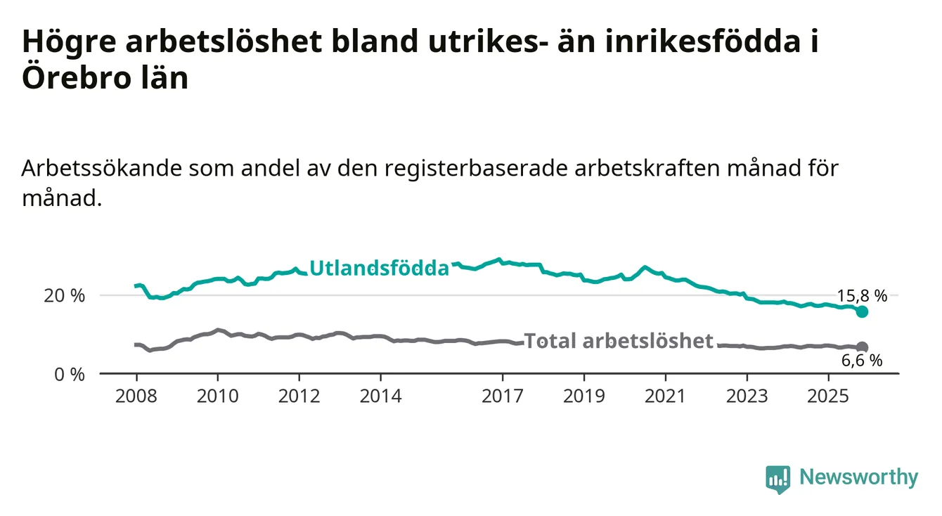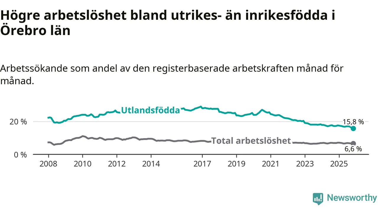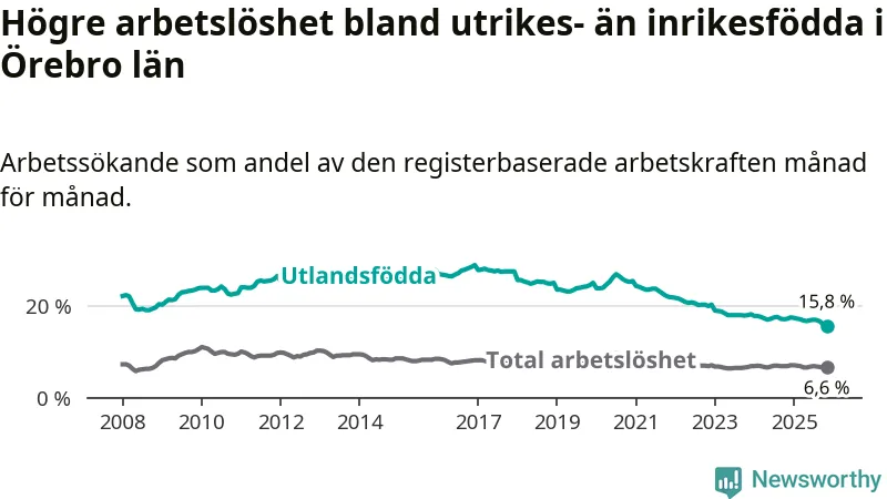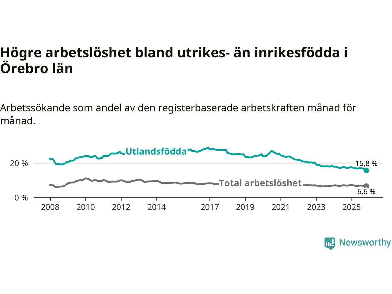 Arbetslösheten bland utlandsfödda var 15,8 procent i Örebro under november månad, motsvarande 5 046 av 31 937 personer. Det är 1,5 procentenheter färre än vid samma tidpunkt i fjol (−429 om man räknar personer). Därmed har de utlandsföddas arbetslöshet varit lägre än vid samma tidpunkt i fjol i över fyra år i sträck. Sedan februari 2021 har arbetslösheten bland utlandsfödda minskat från 24,3 till 15,8 procent. Den nuvarande arbetslöshetsnivån är den lägsta sedan januari 2008.