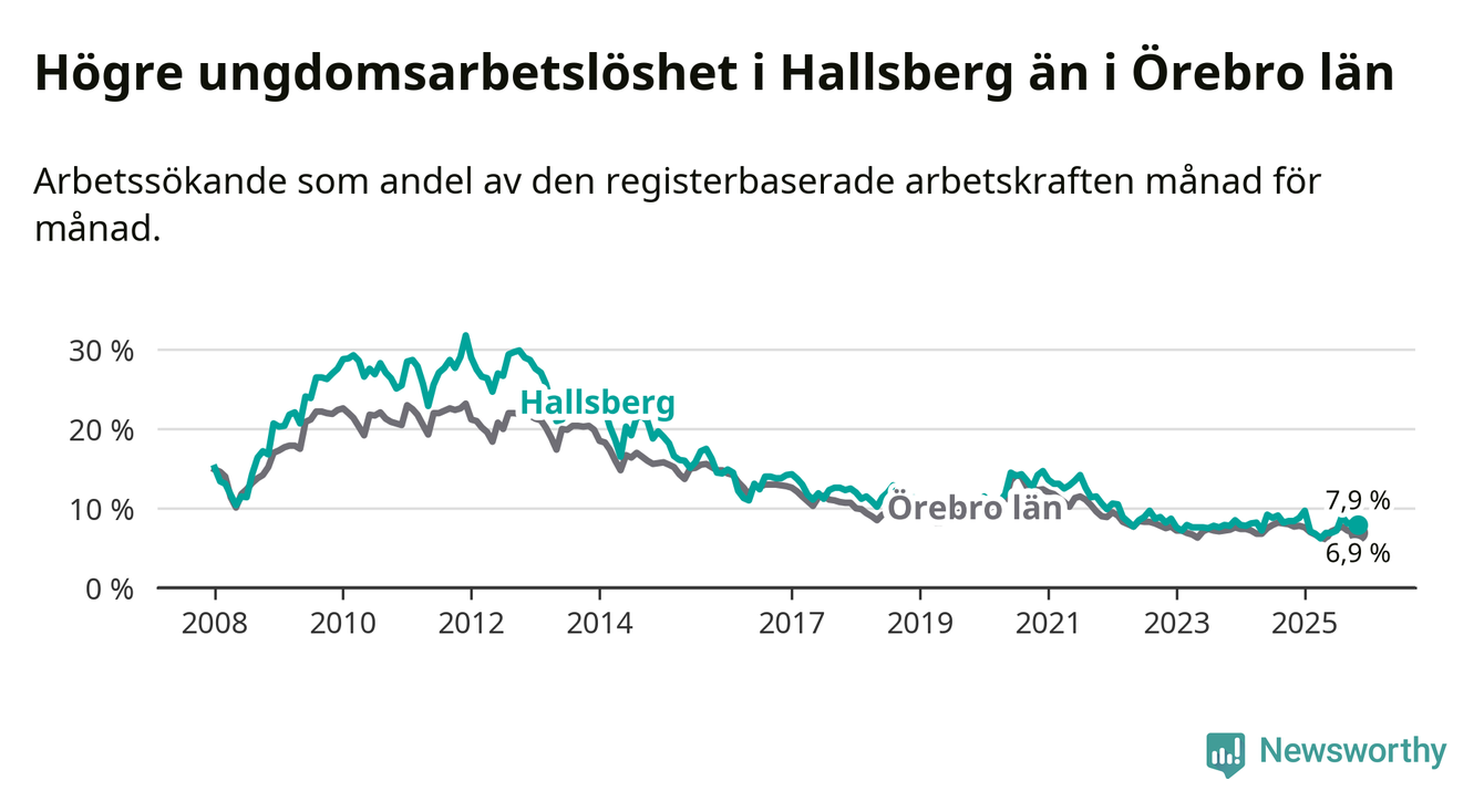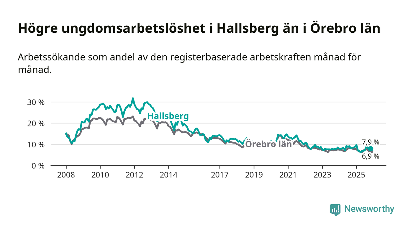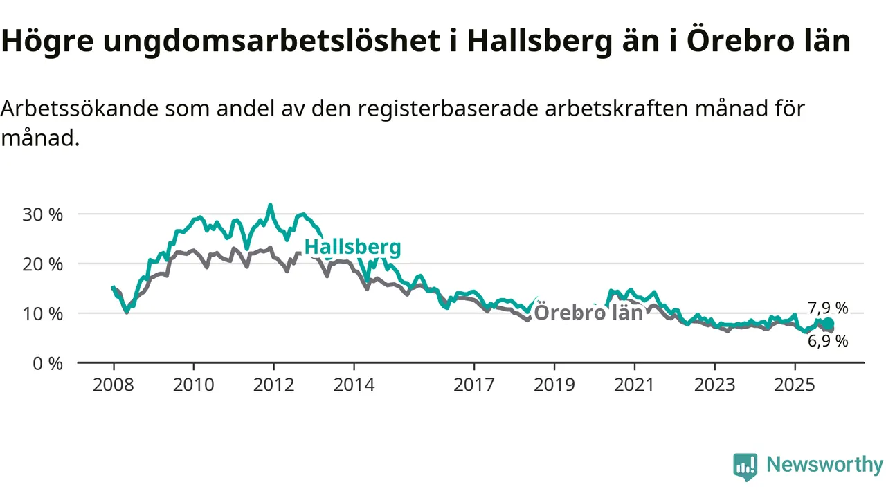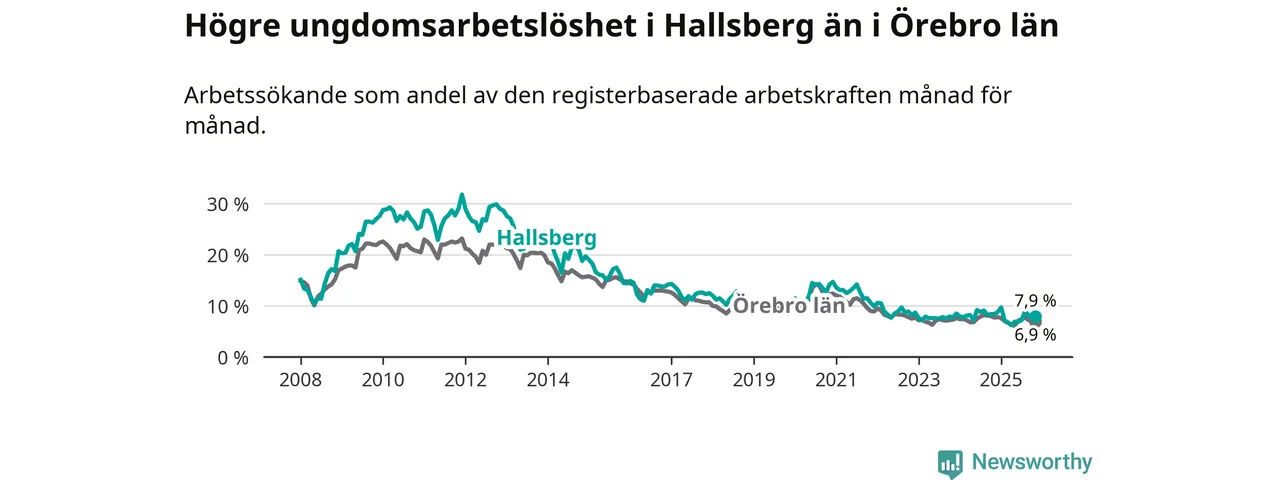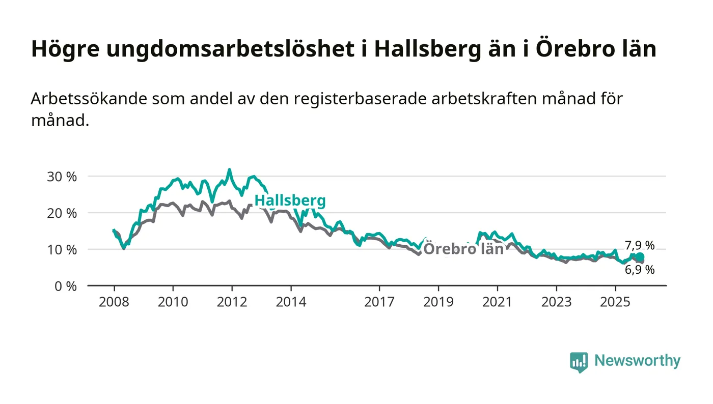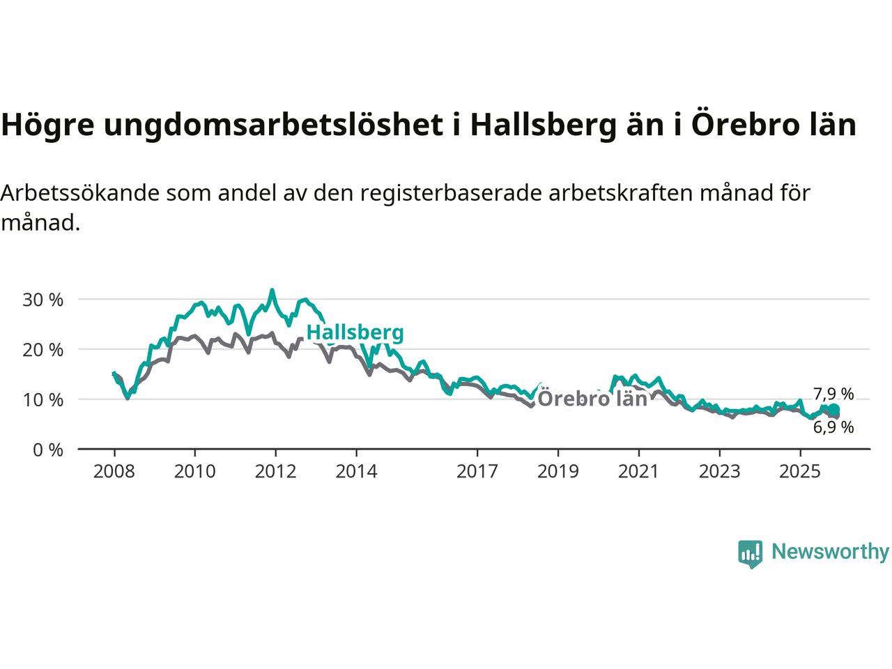 Medan Hallsberg har lägre total arbetslöshet än Örebro, ligger ungdomsarbetslösheten 1,0 procentenheter högre i Hallsberg.