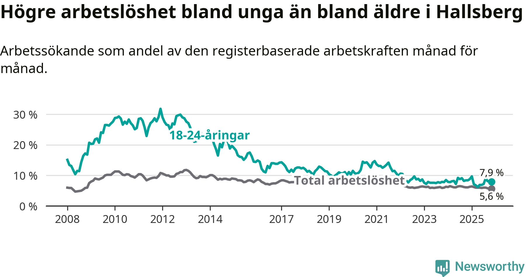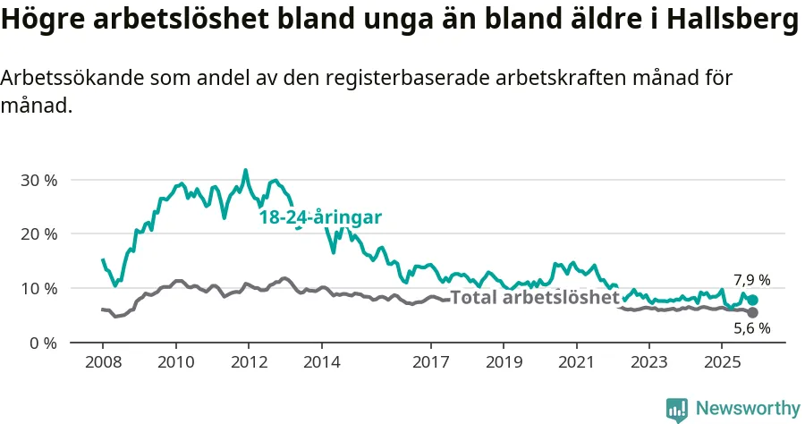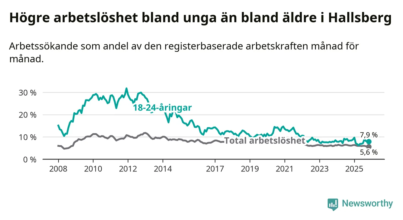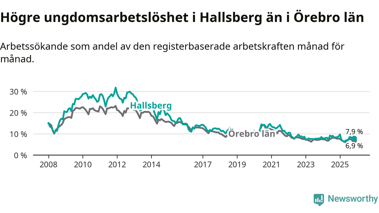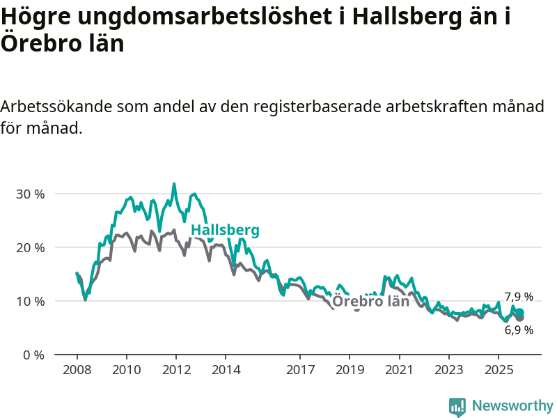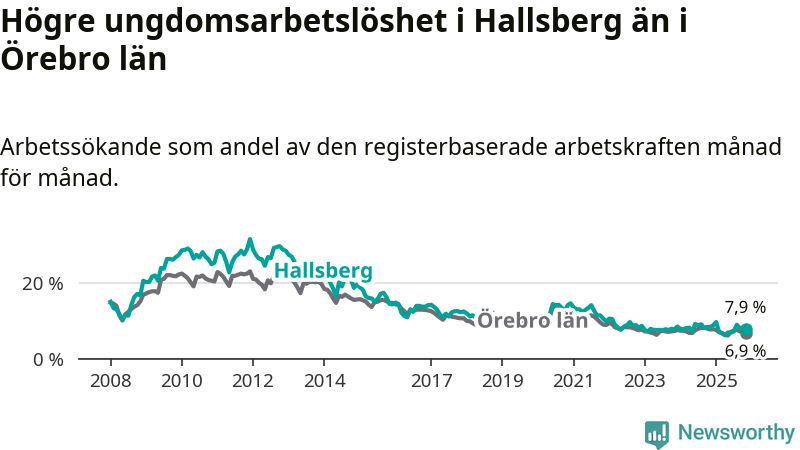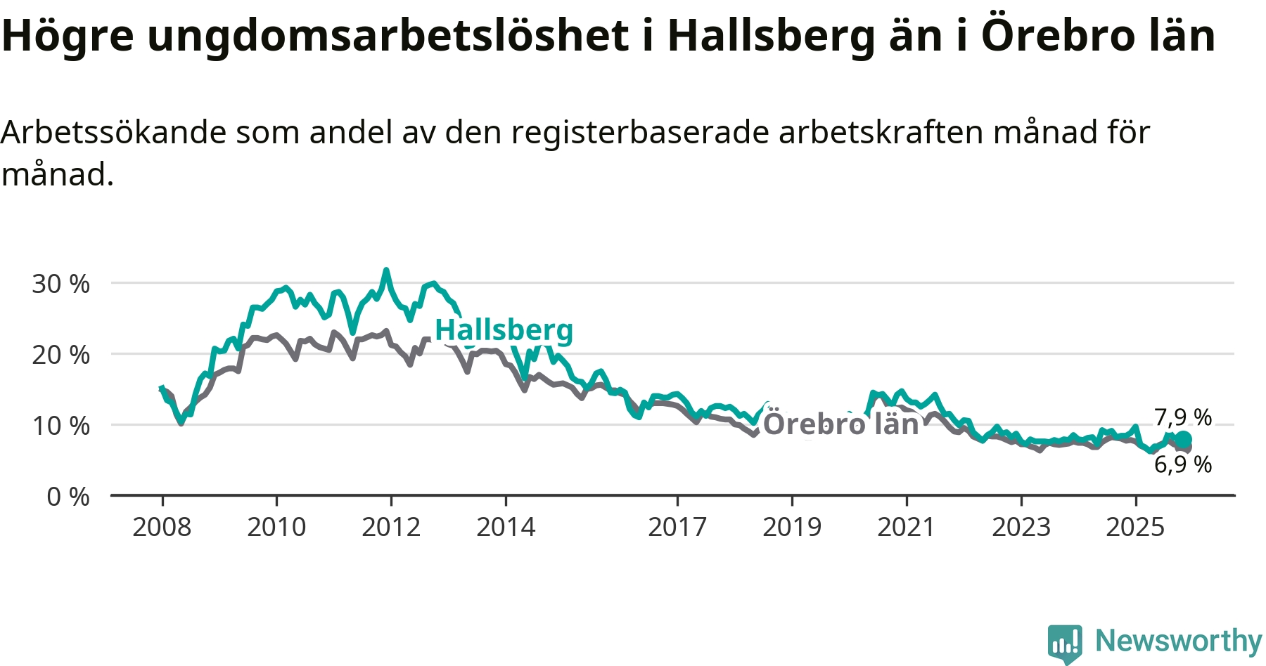 Medan Hallsberg har lägre total arbetslöshet än Örebro, ligger ungdomsarbetslösheten 1,0 procentenheter högre i Hallsberg.