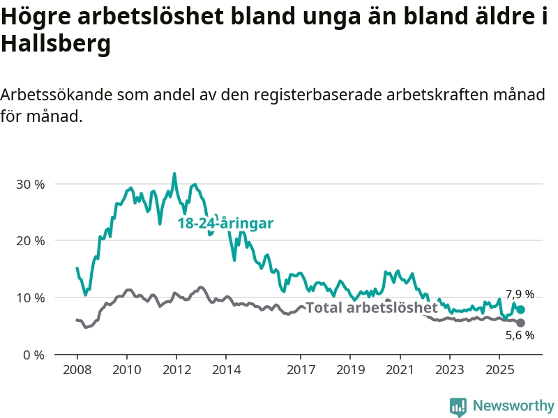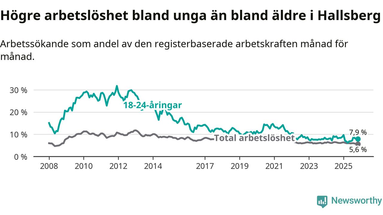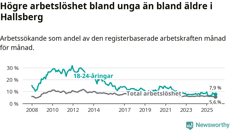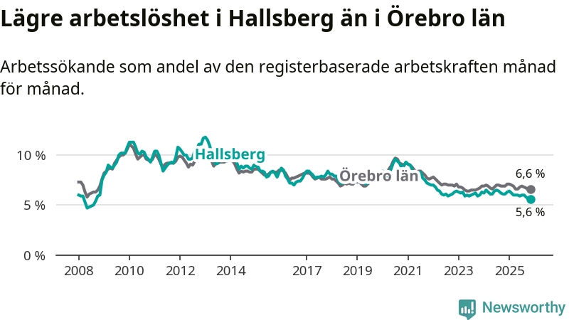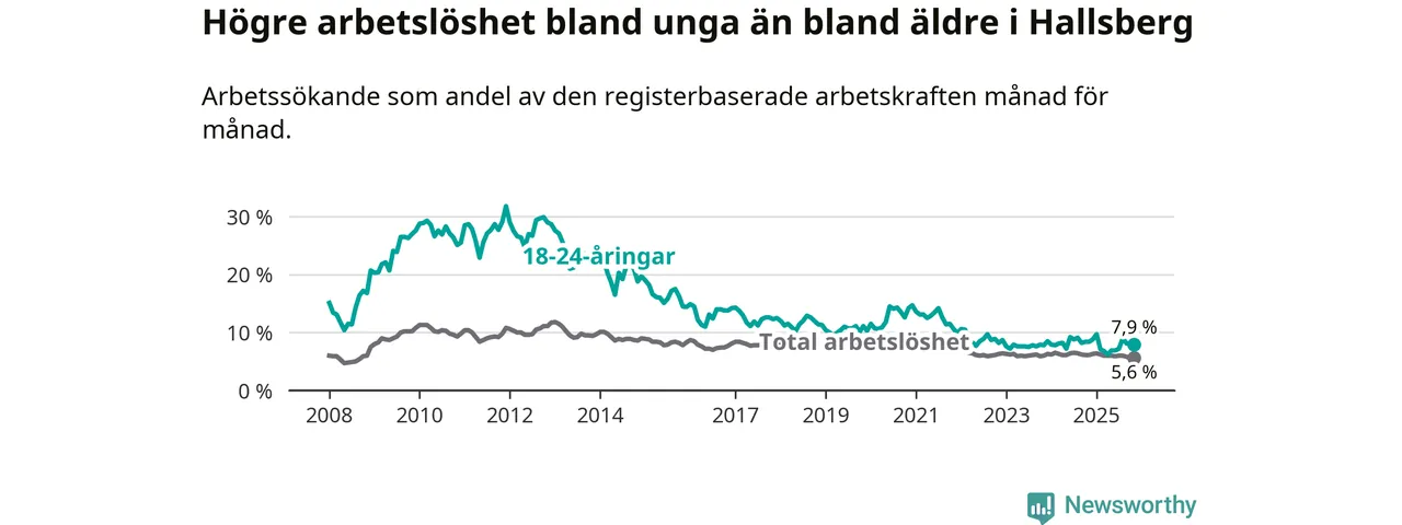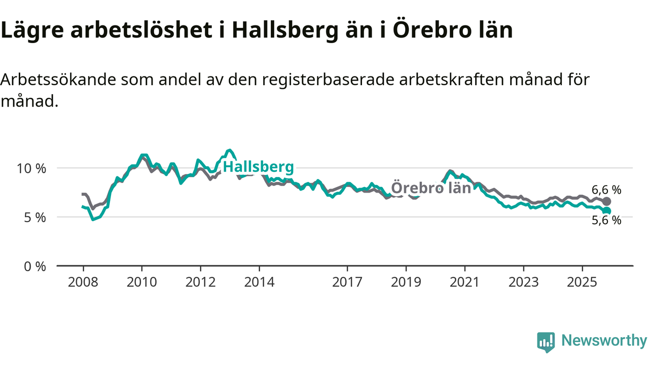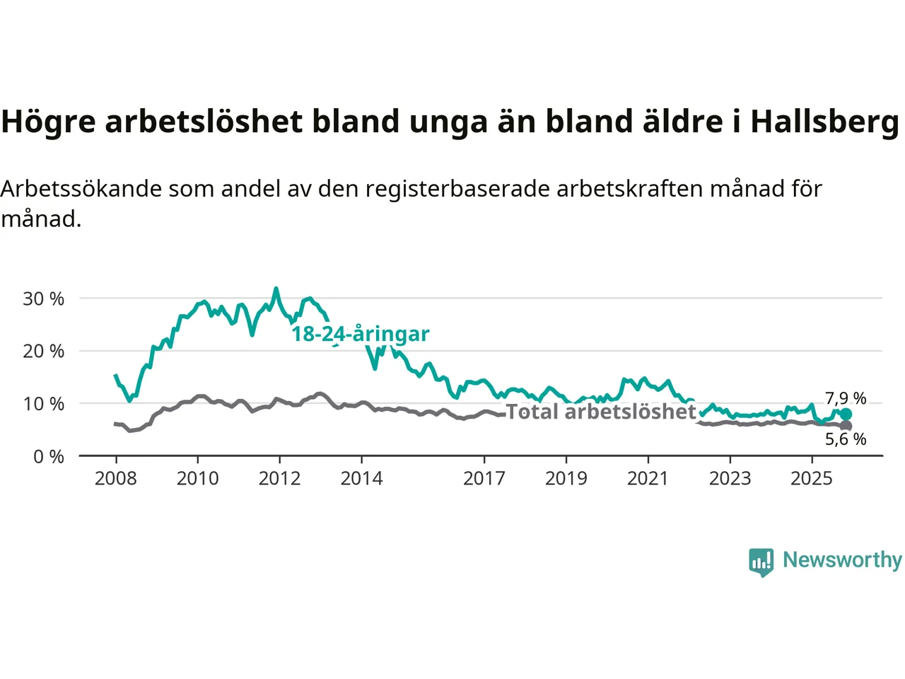 Medan Hallsberg har lägre total arbetslöshet än Örebro, ligger ungdomsarbetslösheten 1,0 procentenheter högre i Hallsberg.
