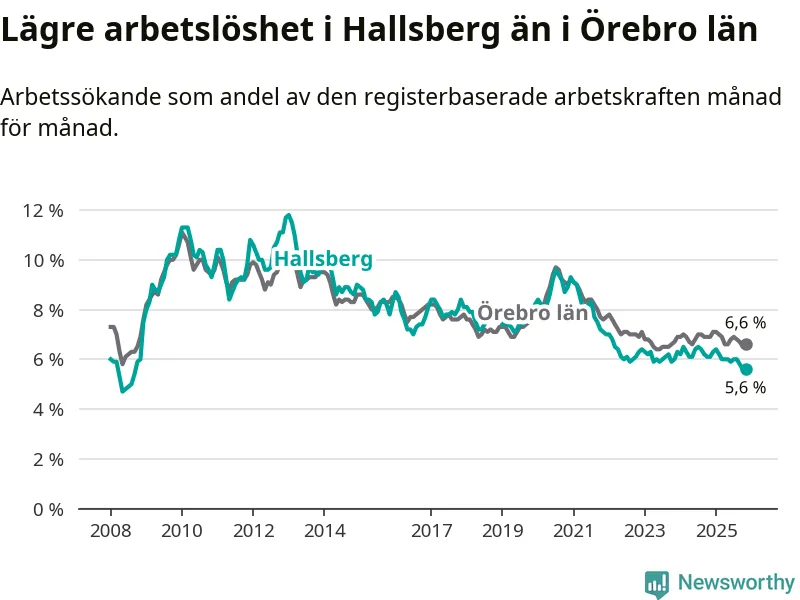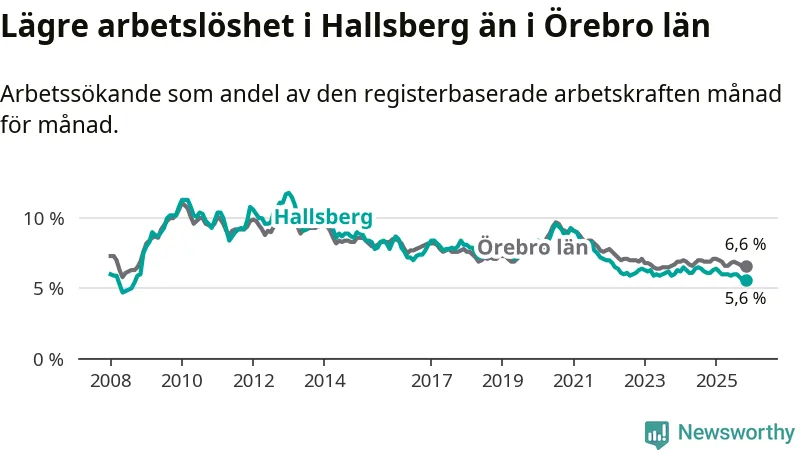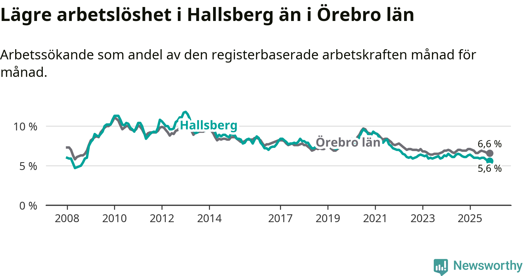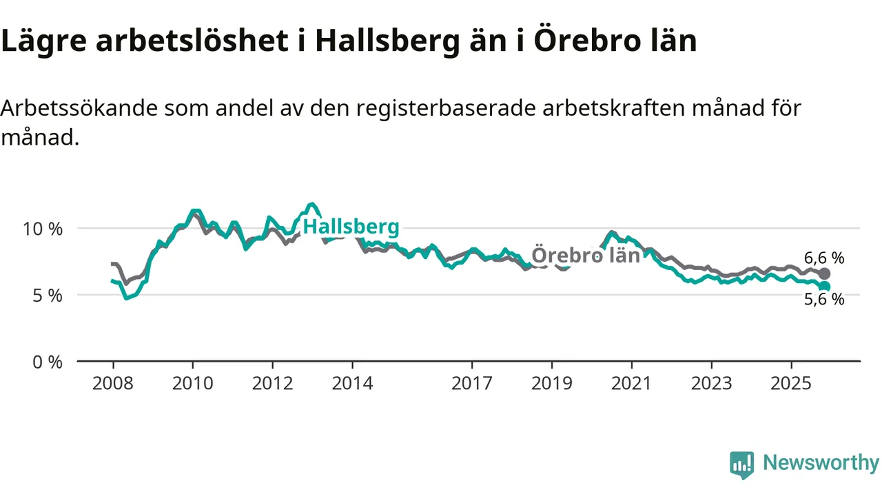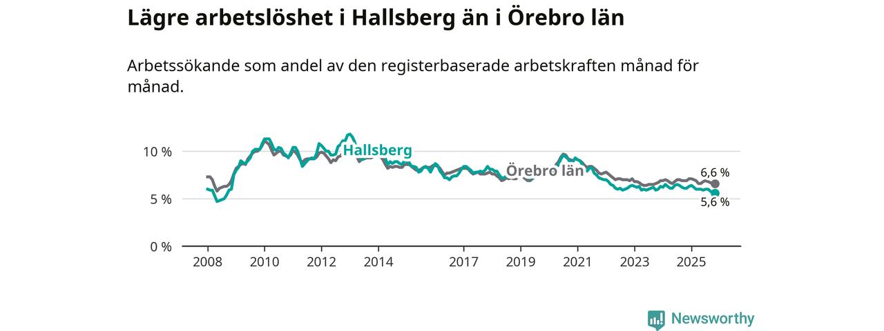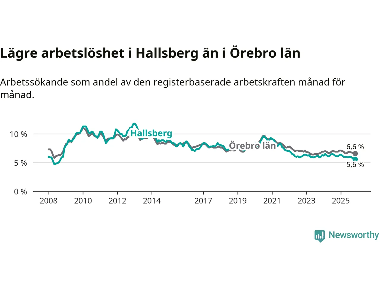 Under november månad rapporterade Hallsbergs kommun en total arbetslöshet på 5,6 procent. Det är en minskning jämfört med samma tidpunkt i fjol (−0,5 procentenheter). Även i Örebro län sjunker arbetslösheten .
