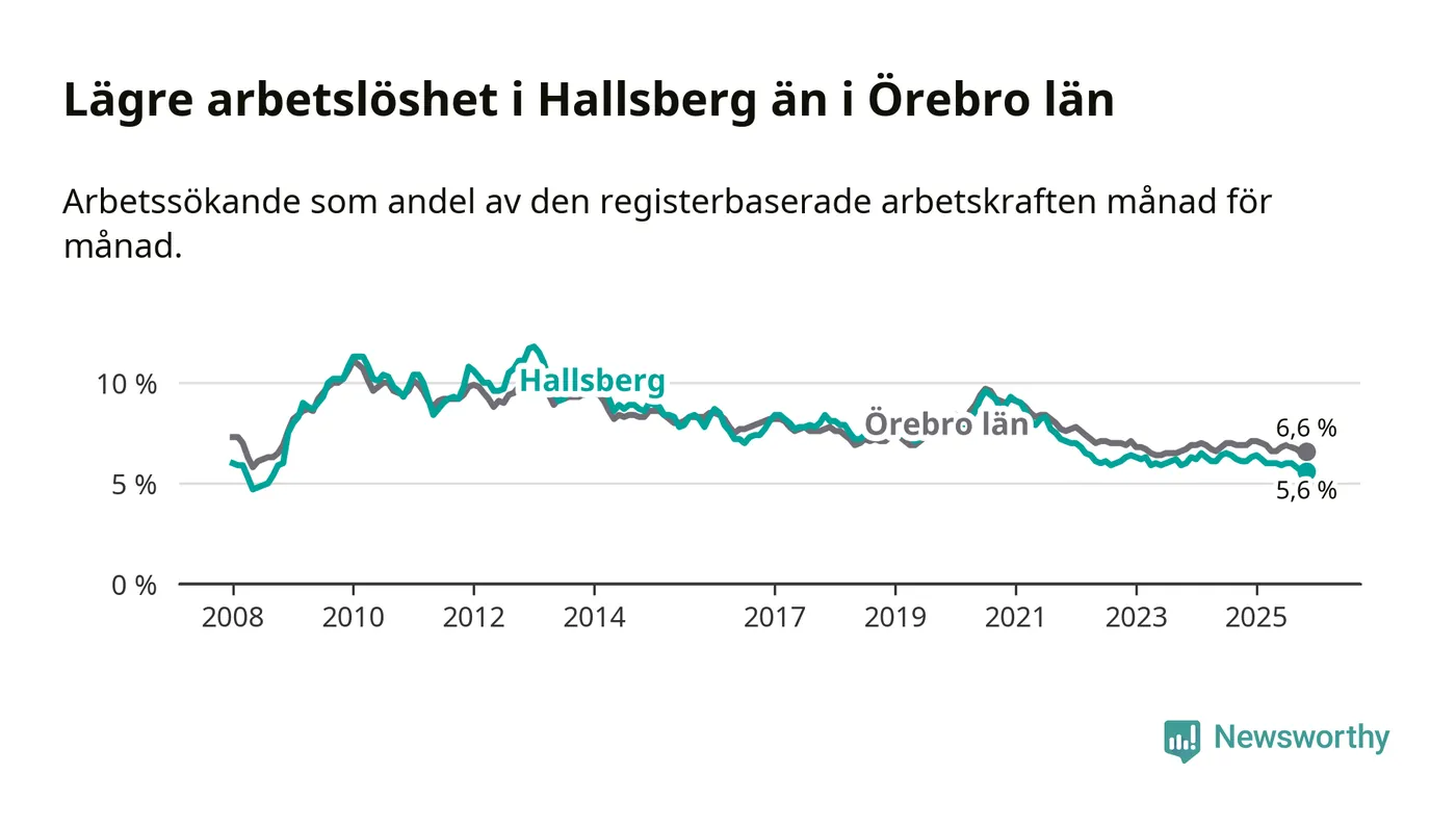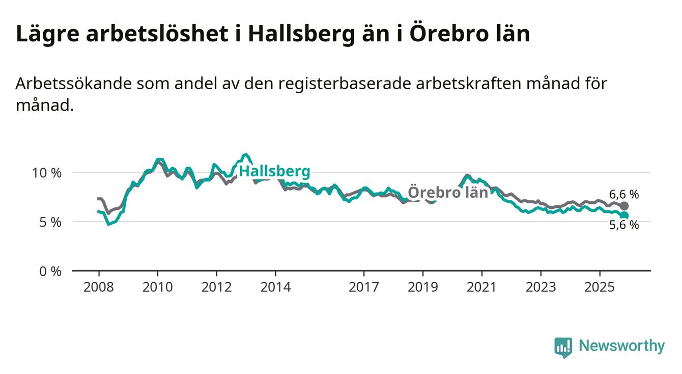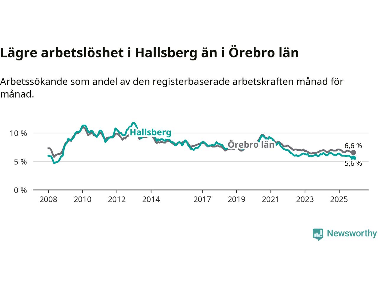 Hallsberg hade redan tidigare lägre arbetslöshet än snittet i hela Örebro län och nu växer klyftan (5,6 procent i kommunen, jämfört med 6,6 procent i hela länet). Askersund har den lägsta arbetslösheten i länet (4,1 procent), medan Örebro har den högsta (7,4 procent). För att Hallsberg skulle komma ner i samma arbetslöshetsnivå som Askersund skulle 115 personer behöva sysselsättas.