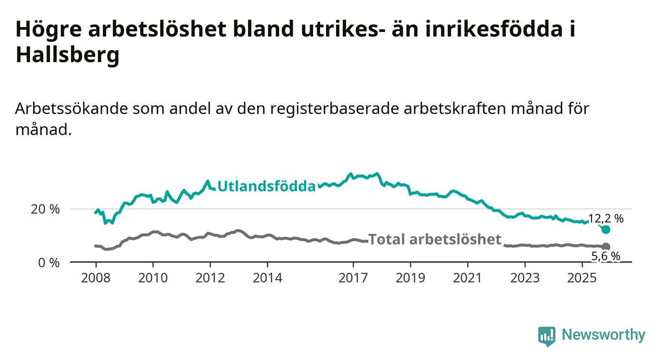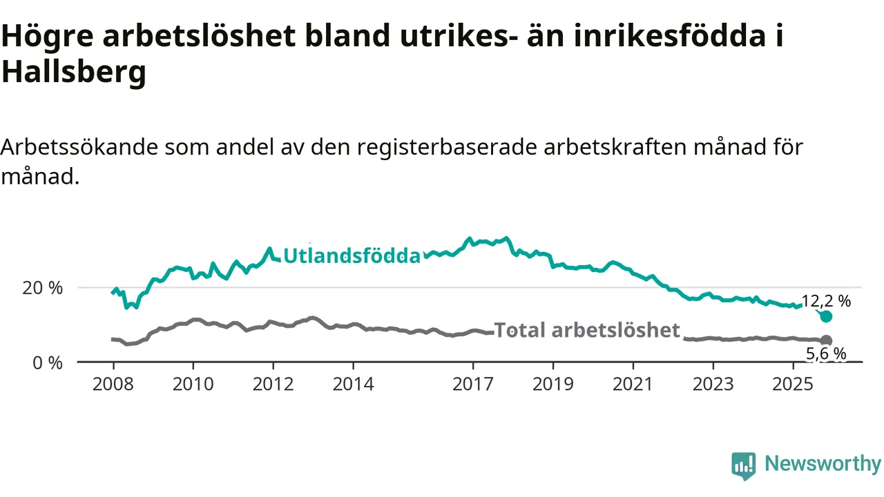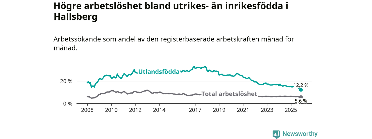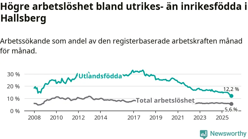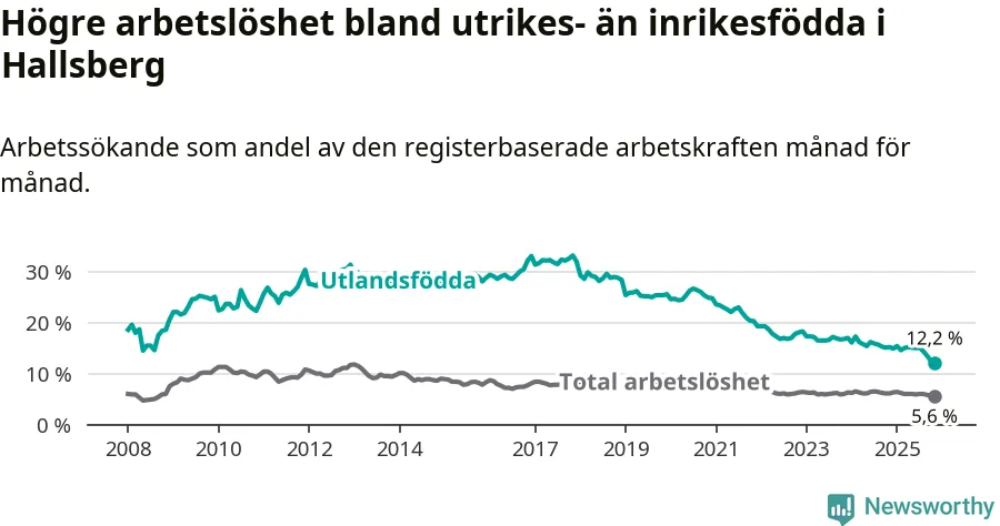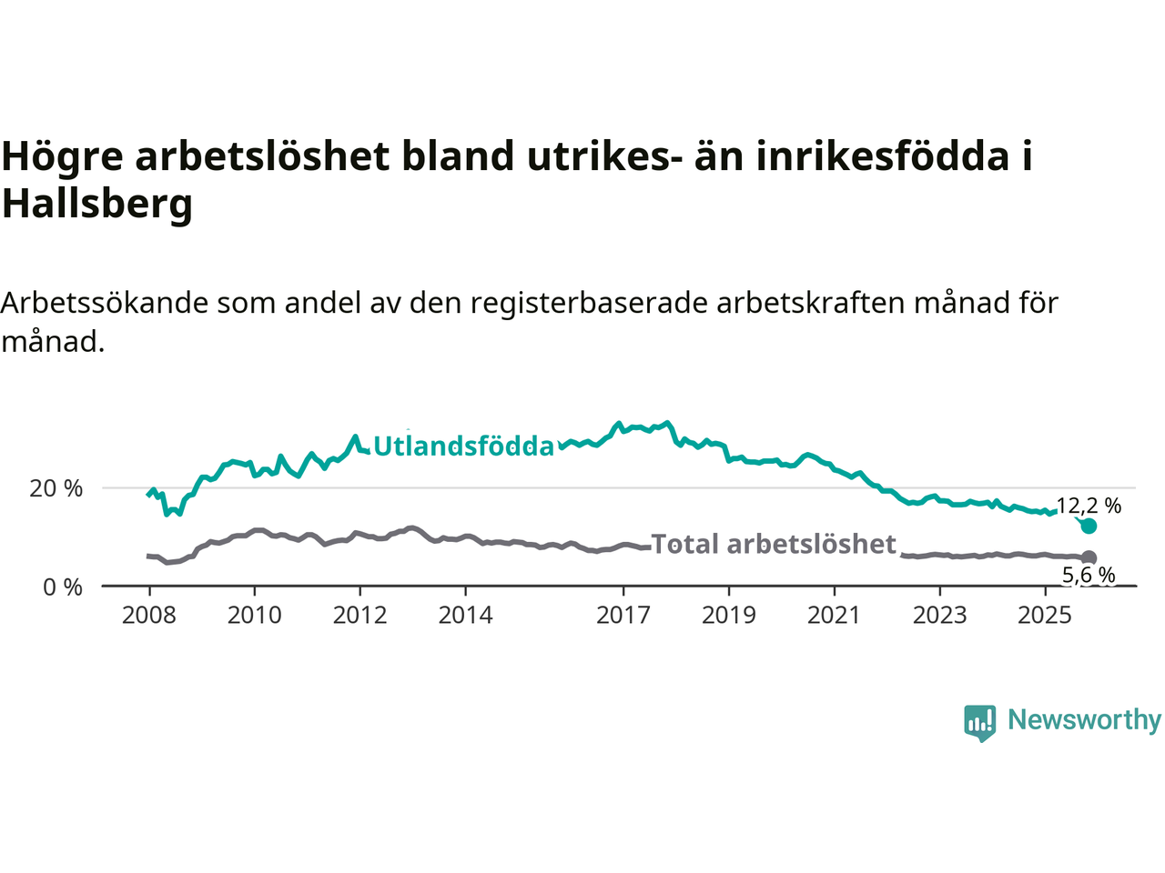 Arbetslösheten bland utlandsfödda var 12,2 procent i Hallsberg under november månad, motsvarande 199 av 1 631 personer. Det är 3,0 procentenheter färre än vid samma tidpunkt i fjol (−52 om man räknar personer). Därmed är de utlandsföddas arbetslöshet lägre än vid samma tidpunkt i fjol för 21:a månaden i följd. Sedan februari 2024 har arbetslösheten bland utlandsfödda minskat från 17,3 till 12,2 procent. Den nuvarande arbetslöshetsnivån är den lägsta sedan januari 2008.