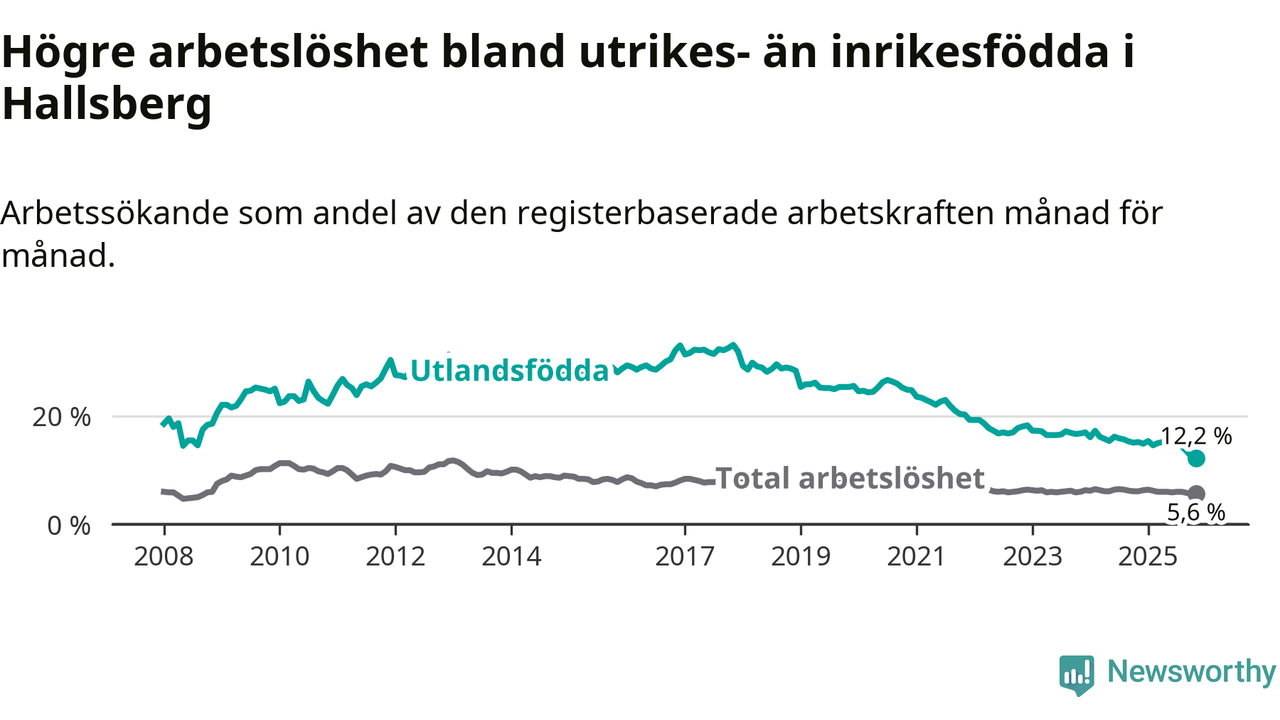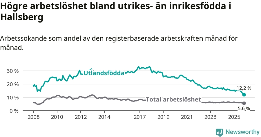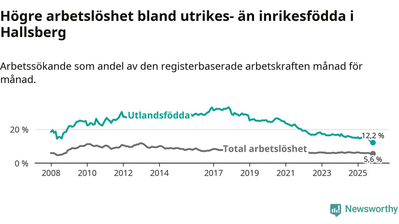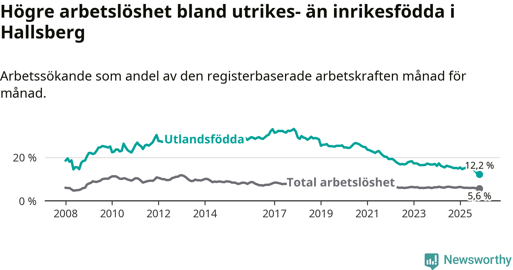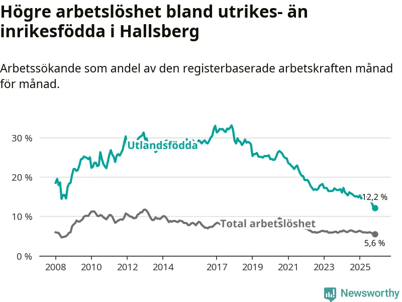 Arbetslösheten bland utlandsfödda var 12,2 procent i Hallsberg under november månad, motsvarande 199 av 1 631 personer. Det är 3,0 procentenheter färre än vid samma tidpunkt i fjol (−52 om man räknar personer). Därmed är de utlandsföddas arbetslöshet lägre än vid samma tidpunkt i fjol för 21:a månaden i följd. Sedan februari 2024 har arbetslösheten bland utlandsfödda minskat från 17,3 till 12,2 procent. Den nuvarande arbetslöshetsnivån är den lägsta sedan januari 2008.
