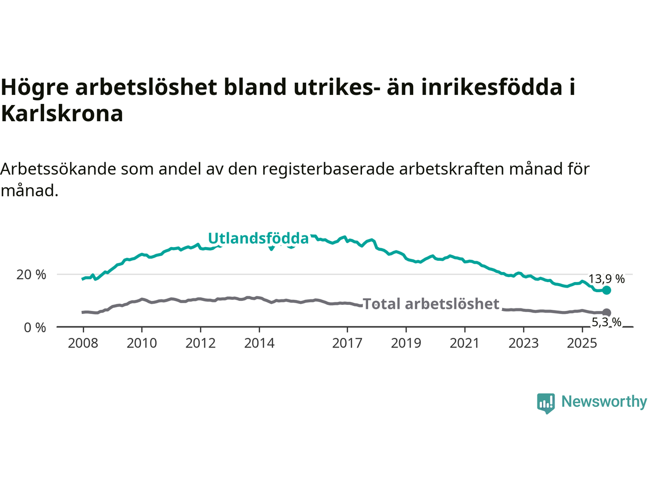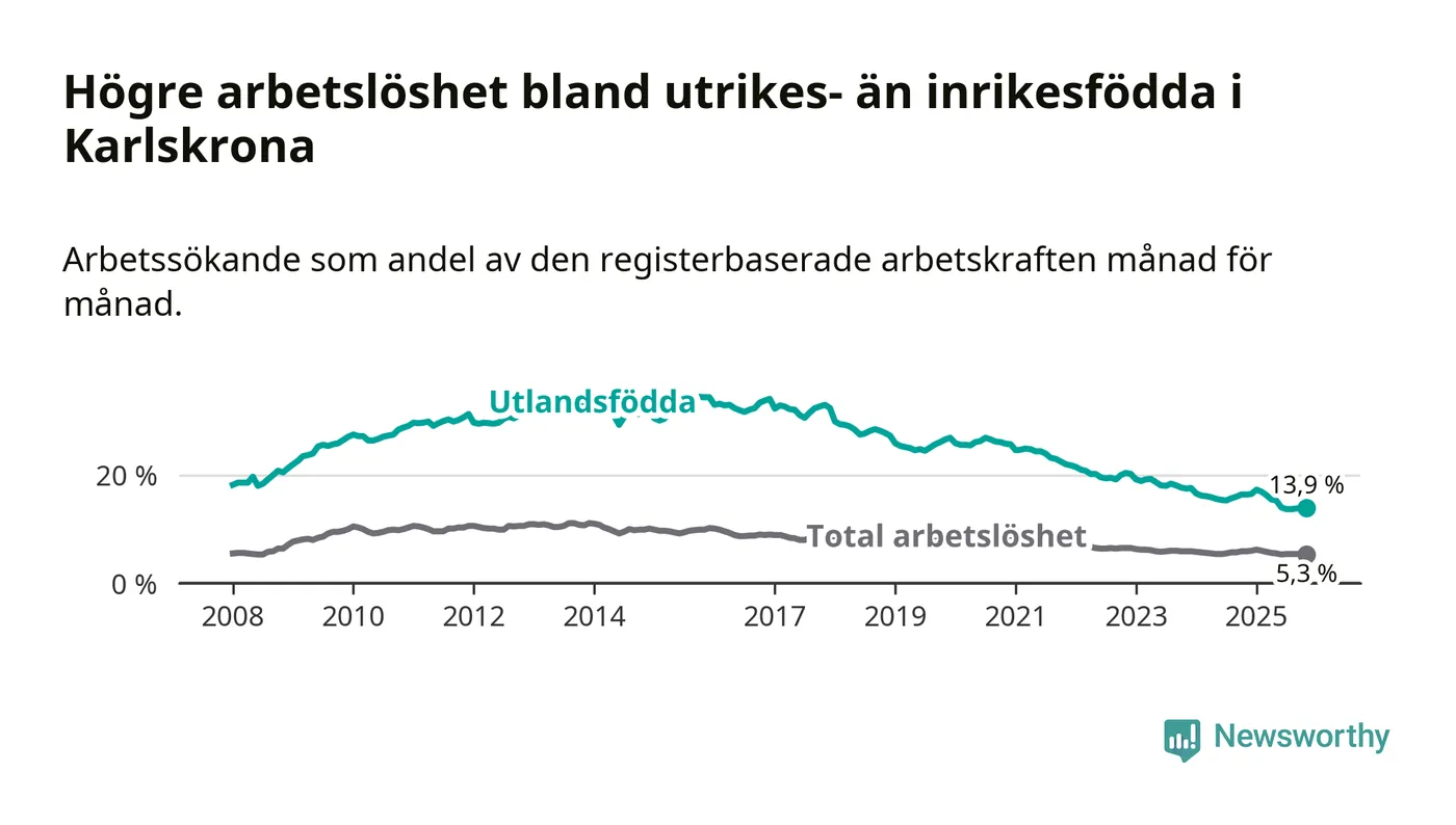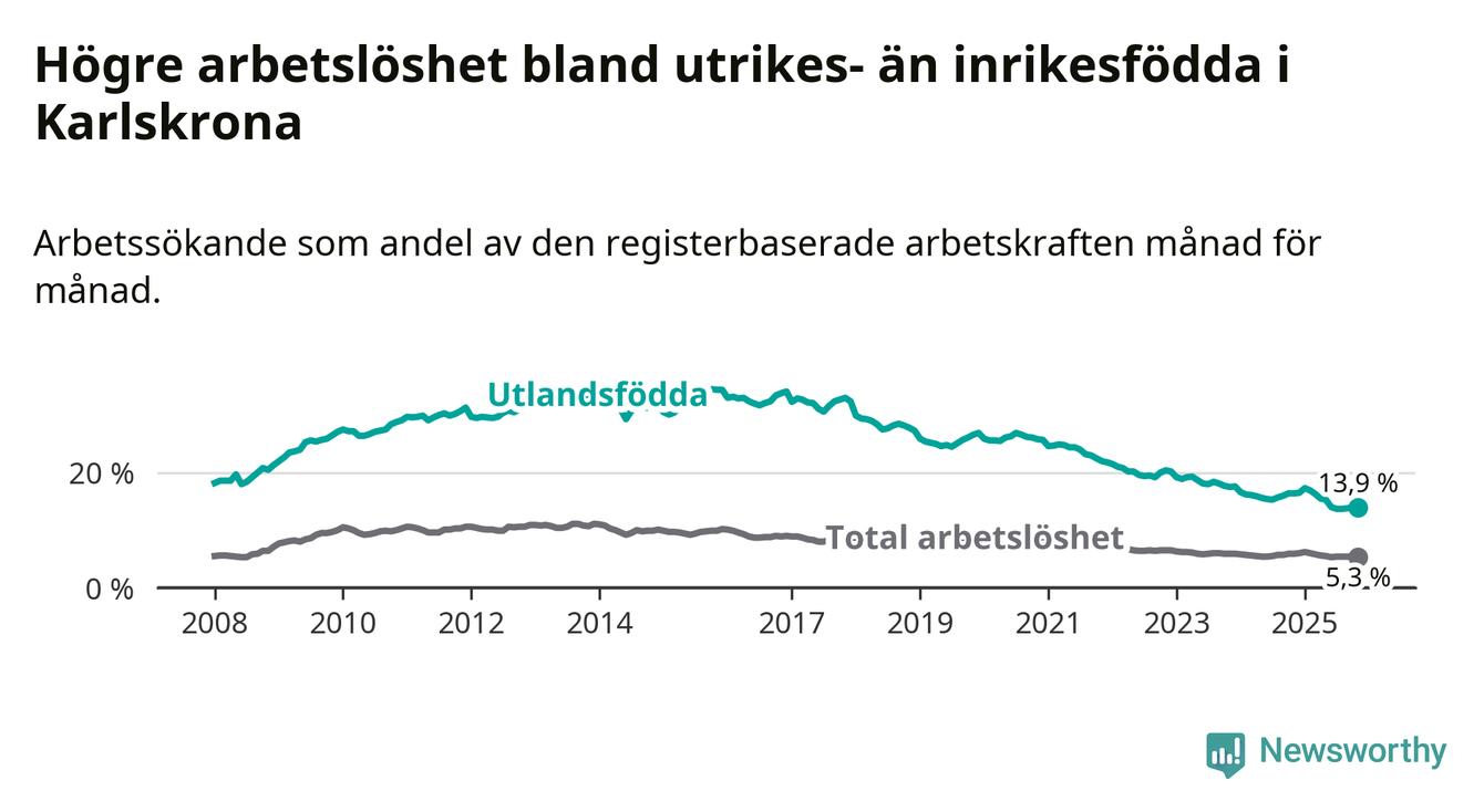 Arbetslösheten bland utlandsfödda var 13,9 procent i Karlskrona under november månad, motsvarande 733 av 5 273 personer. Det är 2,5 procentenheter färre än vid samma tidpunkt i fjol (−131 om man räknar personer). Därmed är de utlandsföddas arbetslöshet lägre än vid samma tidpunkt i fjol för åttonde månaden i följd. Sedan mars har arbetslösheten bland utlandsfödda minskat från 16,3 till 13,9 procent.