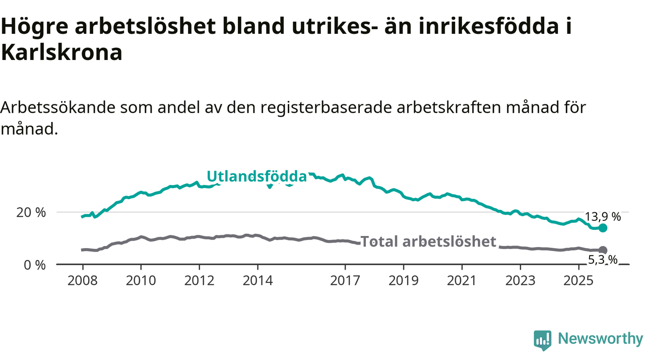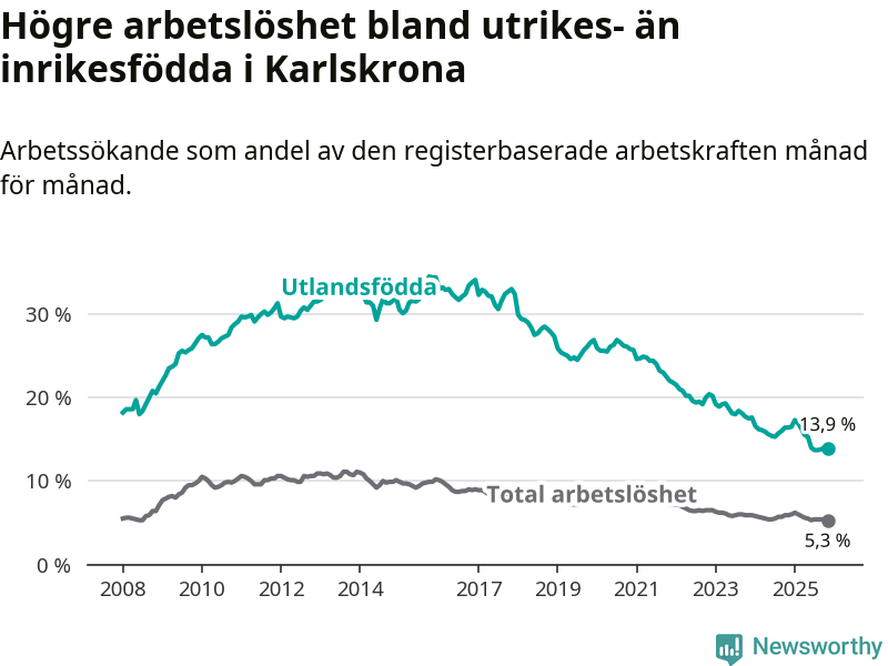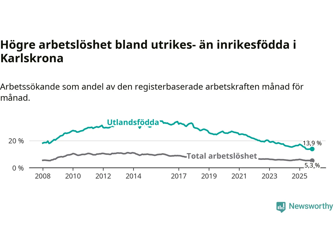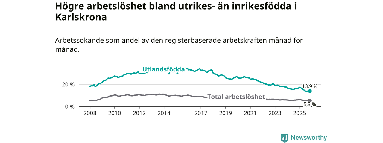 Arbetslösheten bland utlandsfödda var 13,9 procent i Karlskrona under november månad, motsvarande 733 av 5 273 personer. Det är 2,5 procentenheter färre än vid samma tidpunkt i fjol (−131 om man räknar personer). Därmed är de utlandsföddas arbetslöshet lägre än vid samma tidpunkt i fjol för åttonde månaden i följd. Sedan mars har arbetslösheten bland utlandsfödda minskat från 16,3 till 13,9 procent.