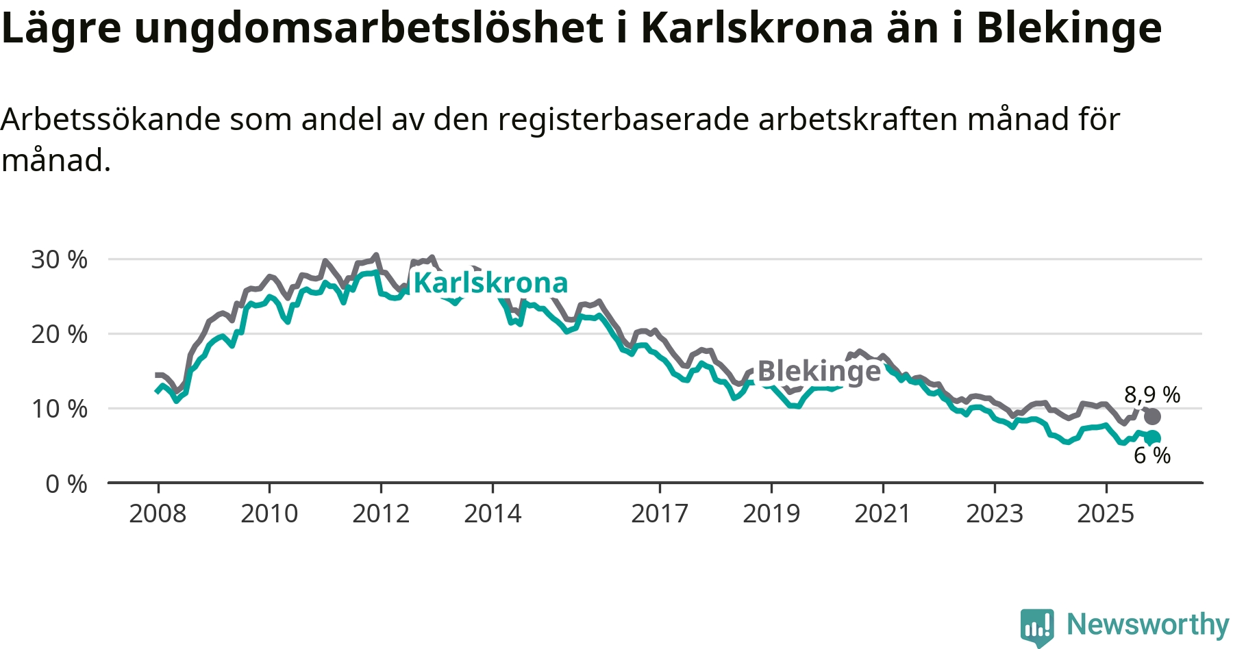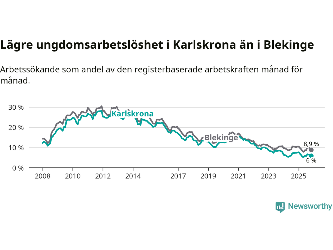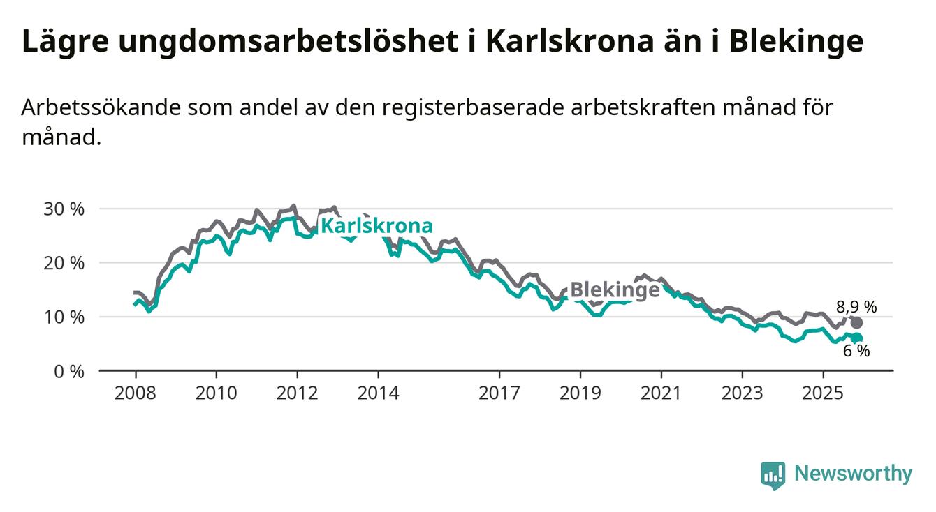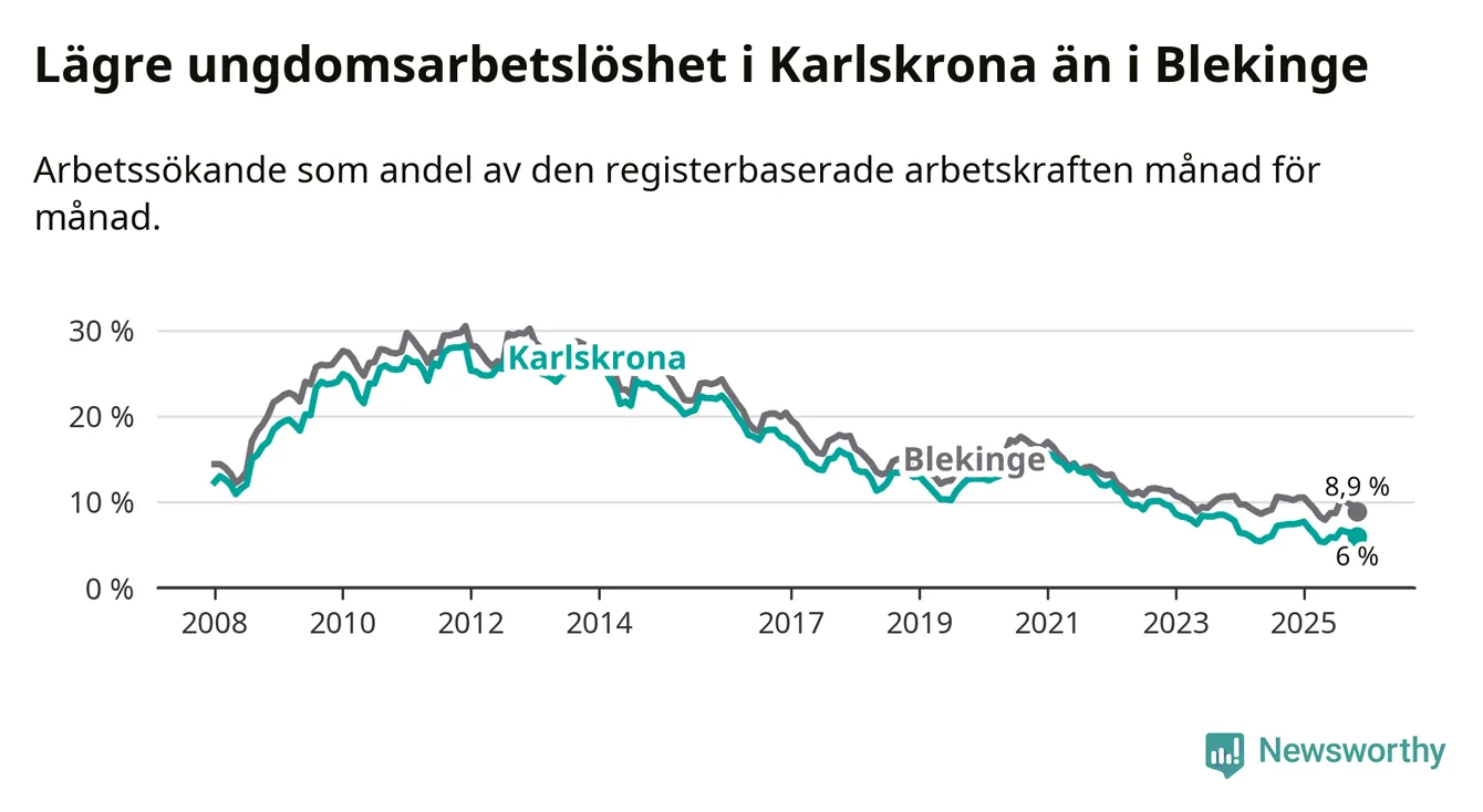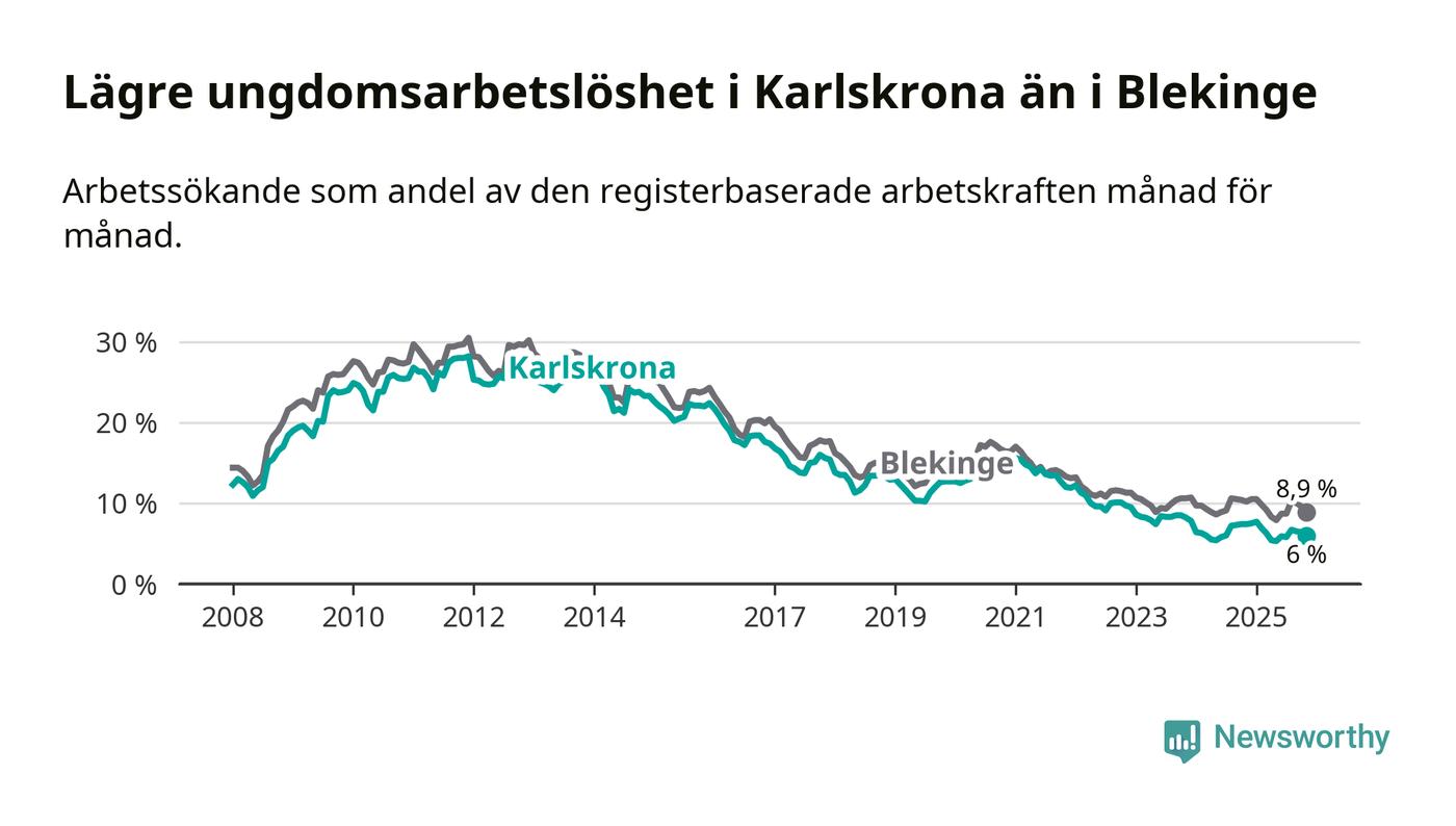Precis som den totala arbetslösheten ligger ungdomsarbetslösheten i Karlskrona lägre än i Blekinge som helhet. Skillnaden mellan kommunen och länet är 2,9 procentenheter.