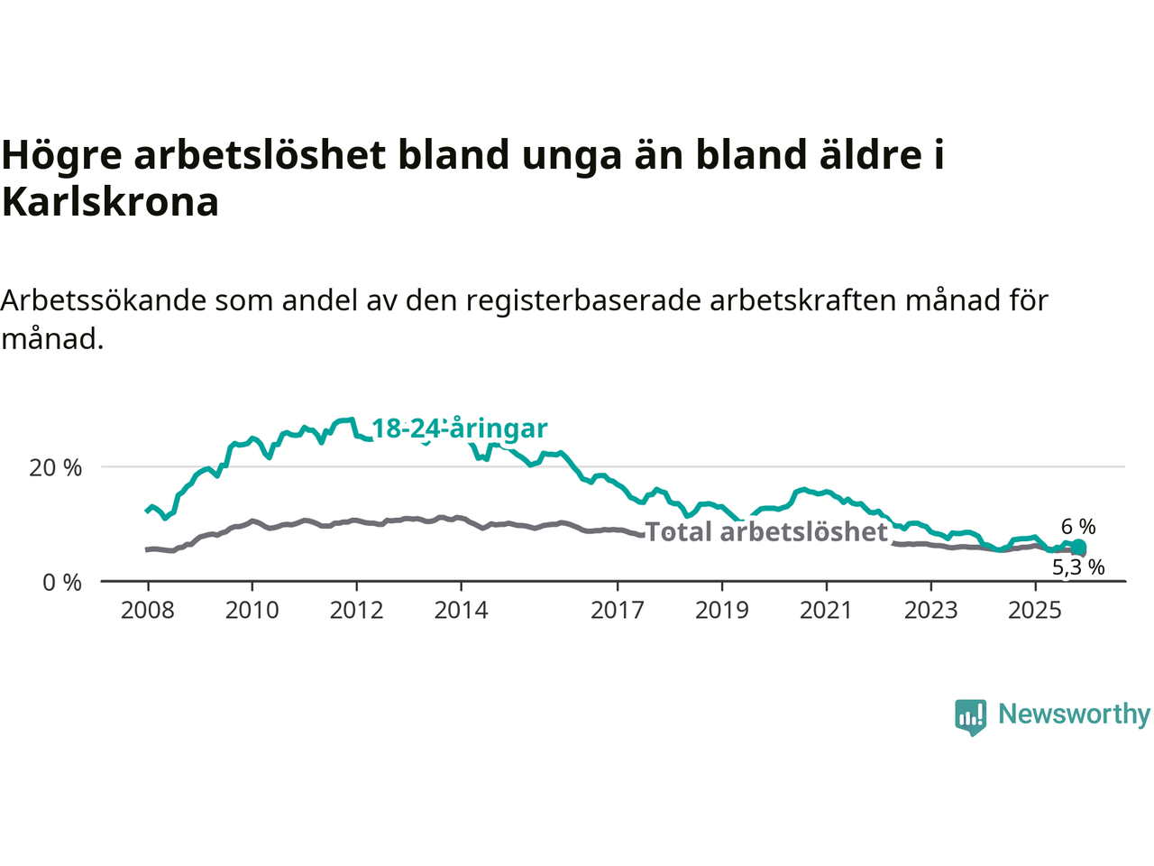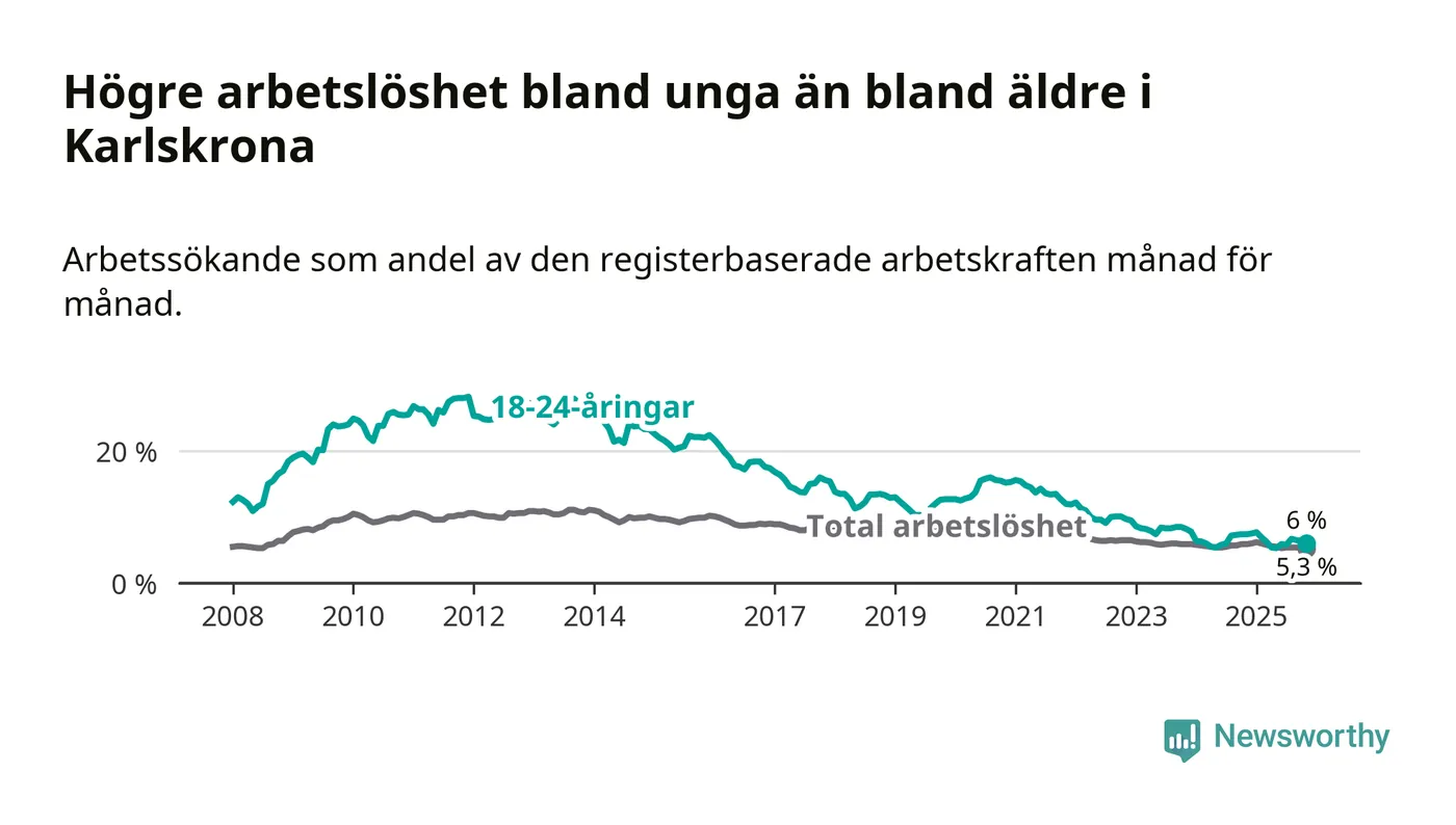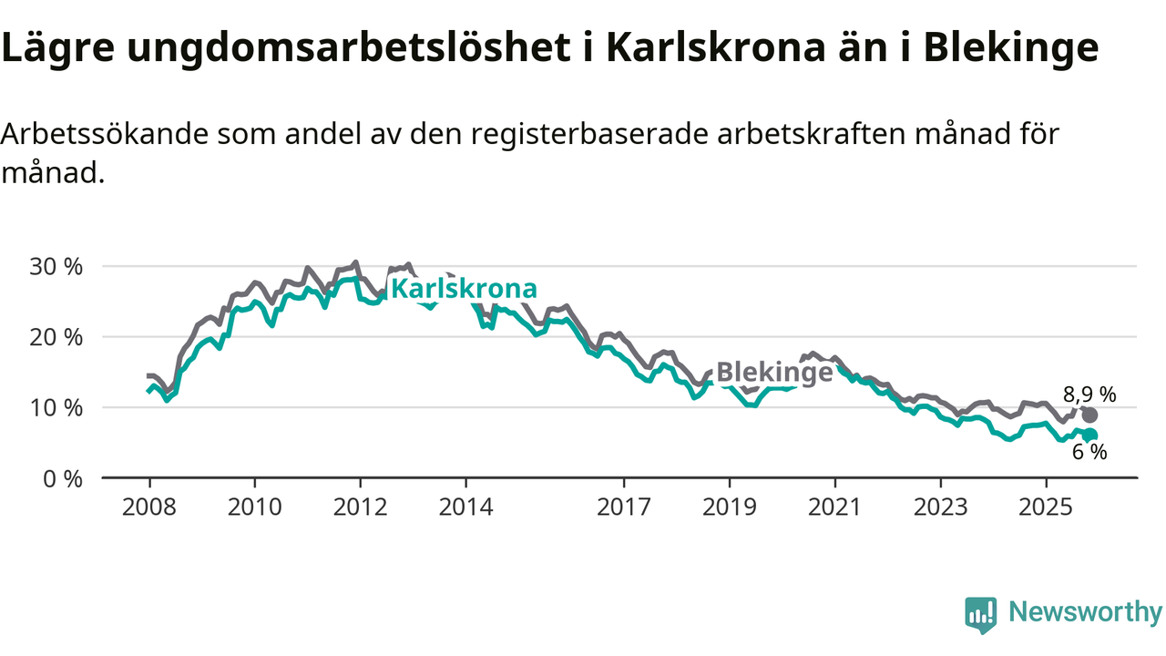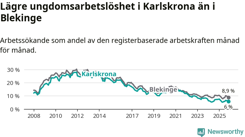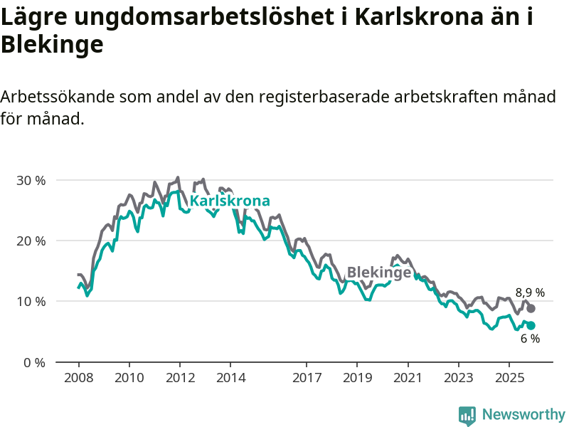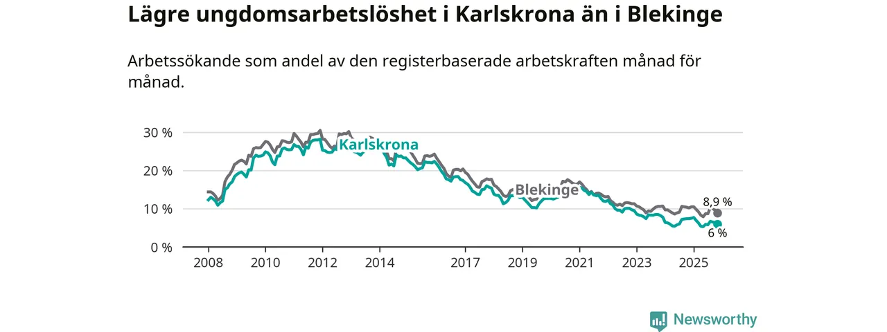 Precis som den totala arbetslösheten ligger ungdomsarbetslösheten i Karlskrona lägre än i Blekinge som helhet. Skillnaden mellan kommunen och länet är 2,9 procentenheter.
