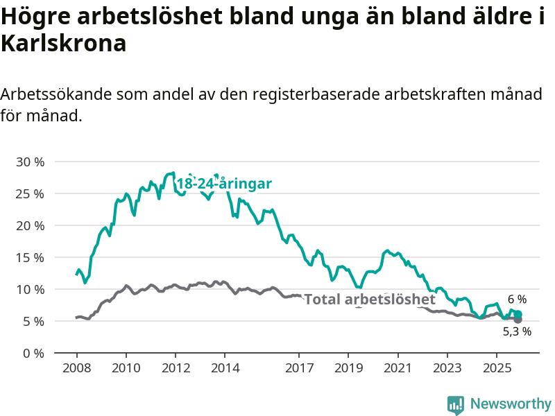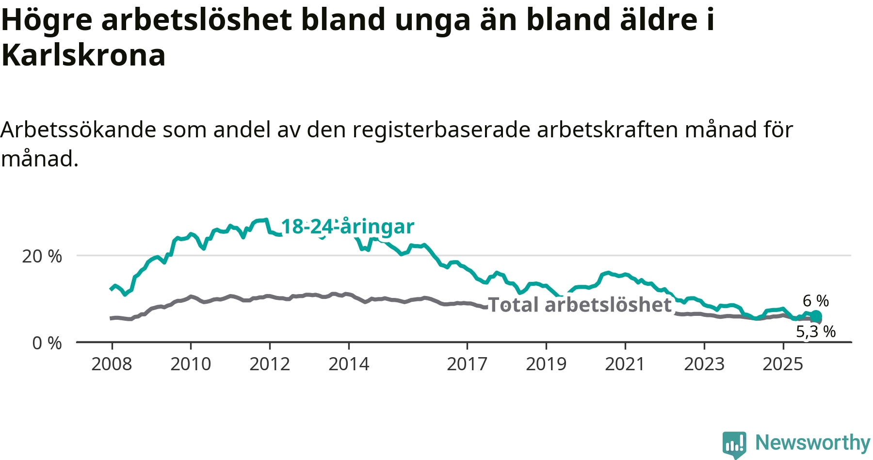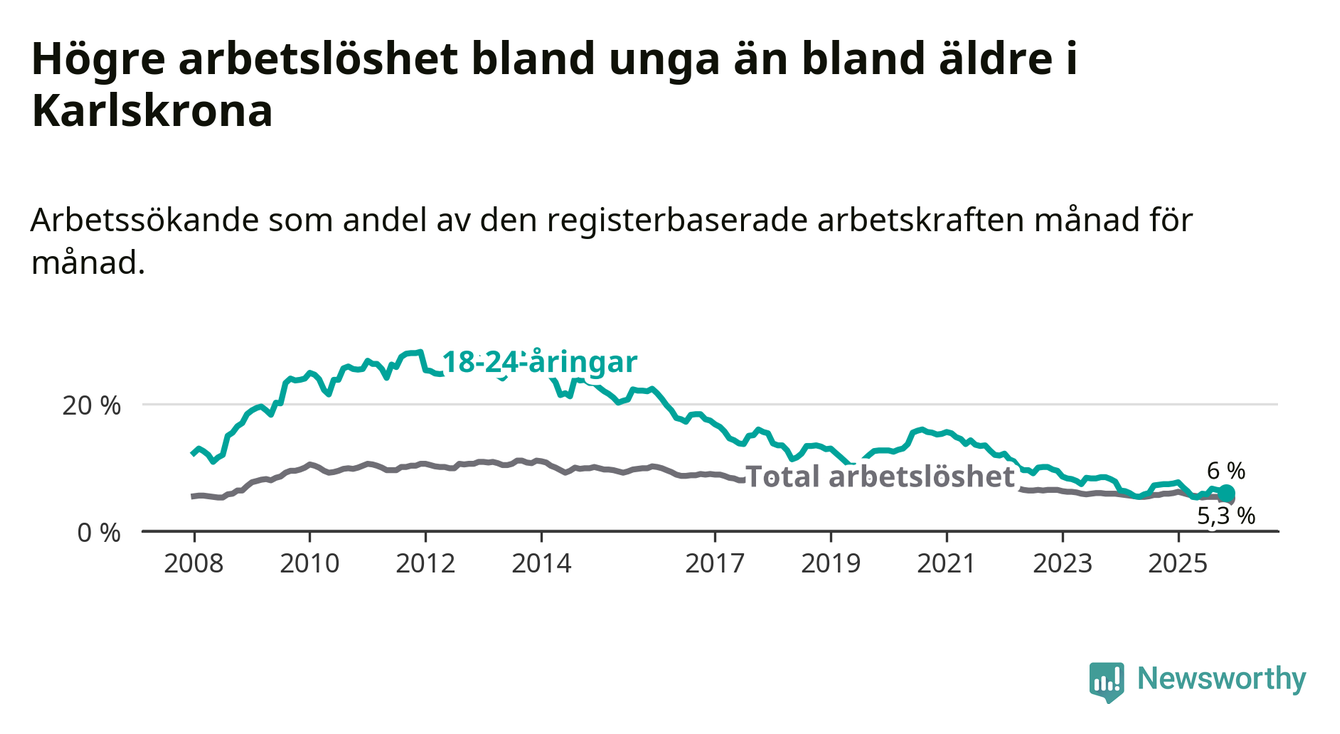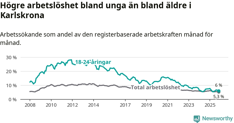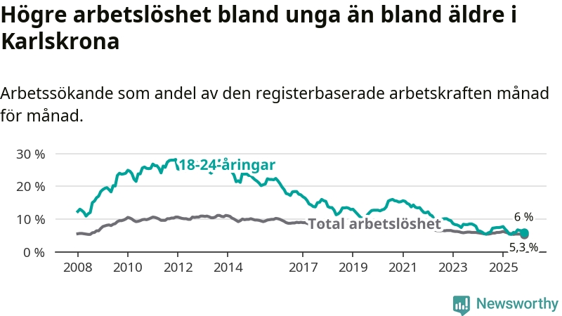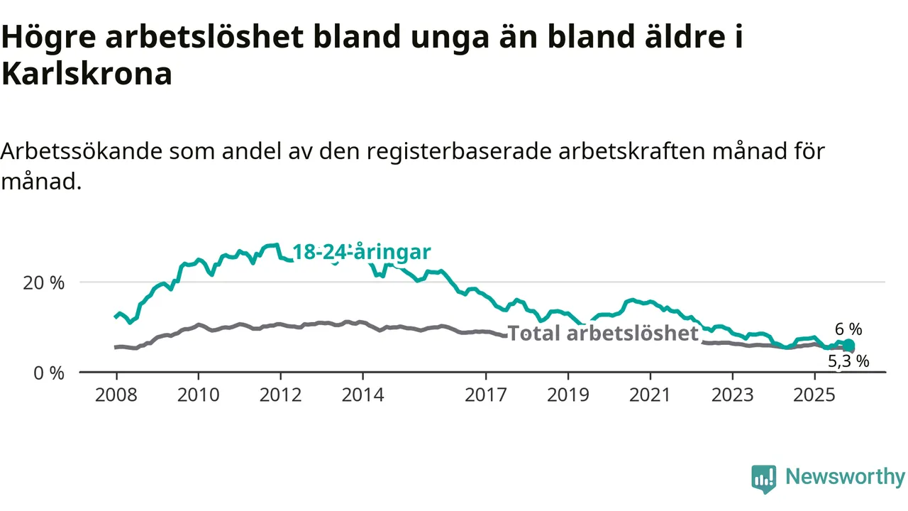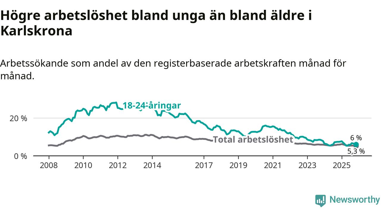 Precis som den totala arbetslösheten ligger ungdomsarbetslösheten i Karlskrona lägre än i Blekinge som helhet. Skillnaden mellan kommunen och länet är 2,9 procentenheter.
