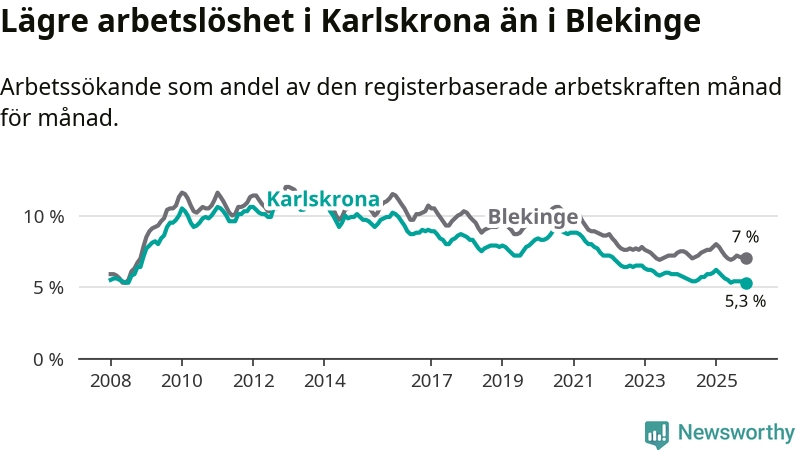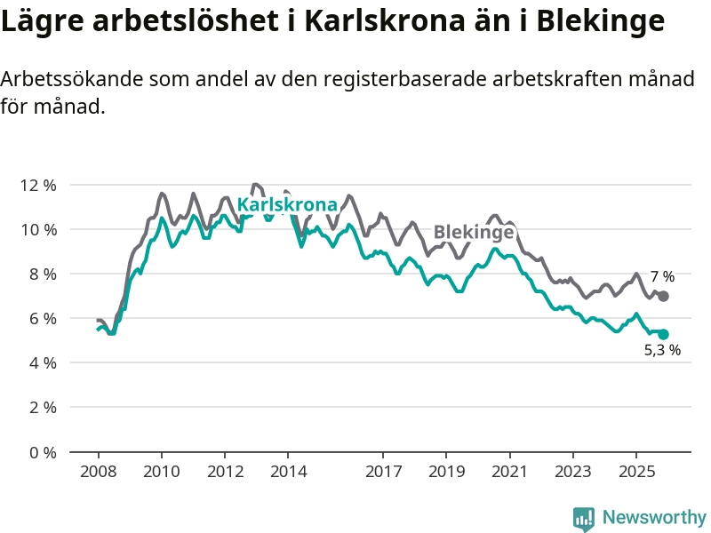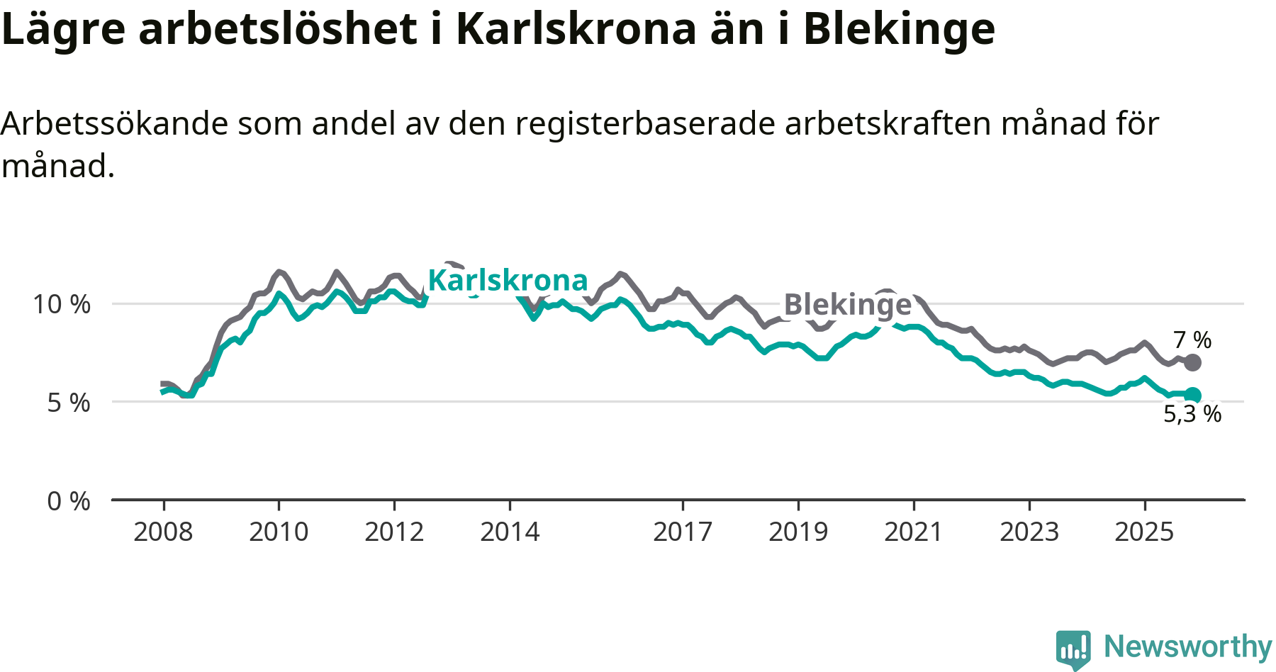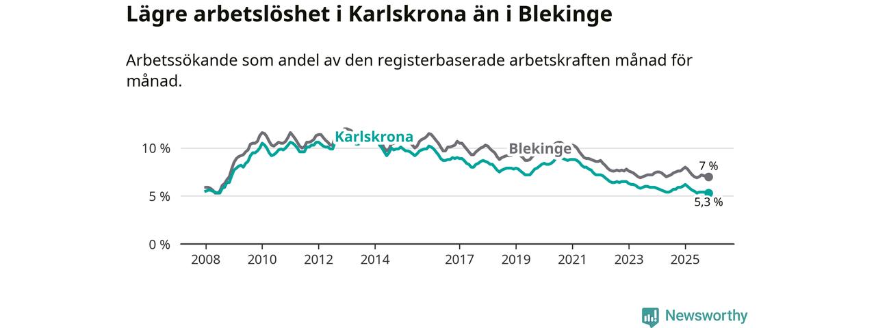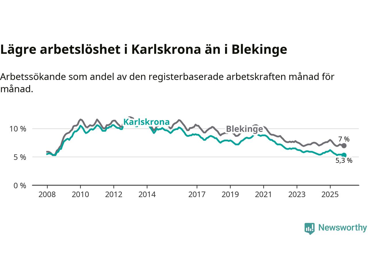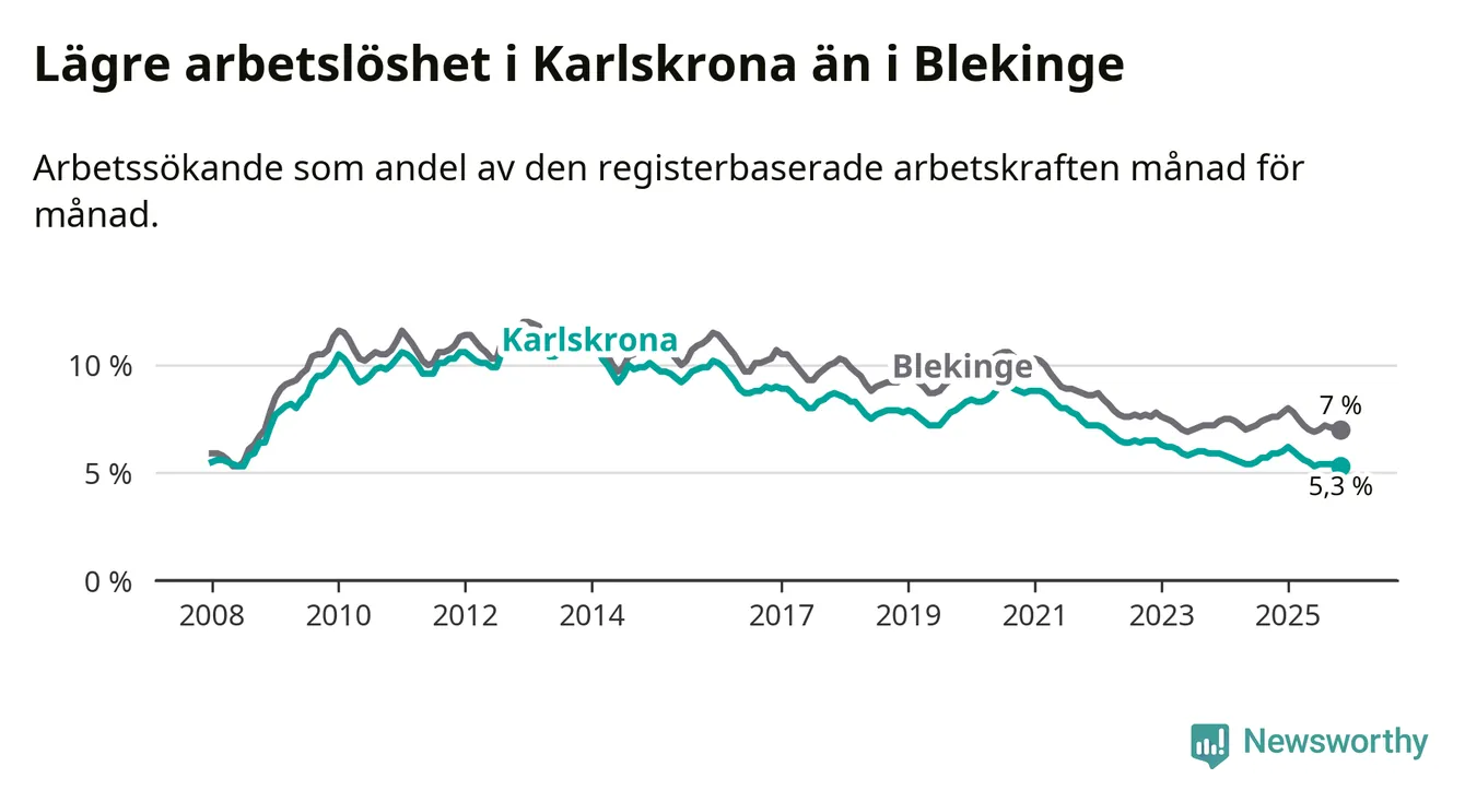 Under november månad rapporterade Karlskrona kommun en total arbetslöshet på 5,3 procent. Det är en minskning jämfört med samma tidpunkt i fjol (−0,6 procentenheter). Även i Blekinge län sjunker arbetslösheten .
