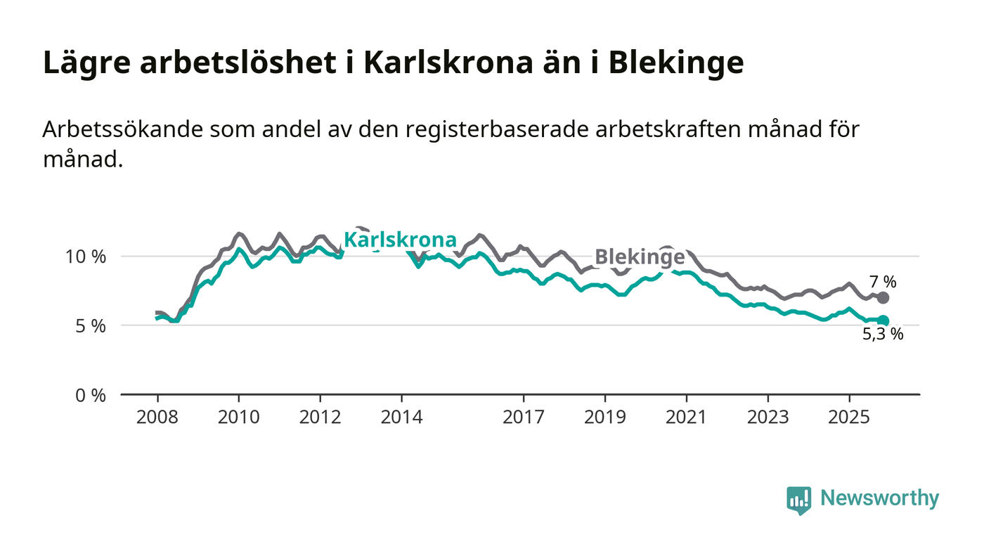 Karlskrona hade redan tidigare lägre arbetslöshet än snittet i hela Blekinge län och nu växer klyftan (5,3 procent i kommunen, jämfört med 7,0 procent i hela länet). Karlskrona har därmed även den lägsta arbetslöshetsnivån i länet. Ronneby har den högsta (9,9 procent).