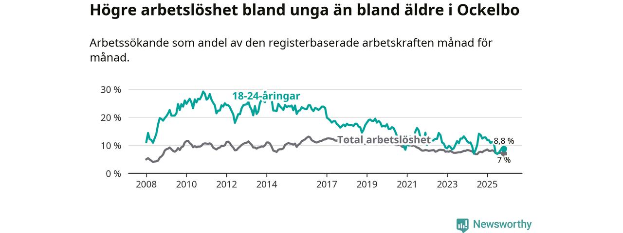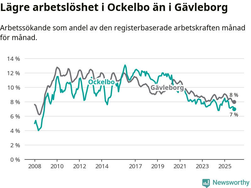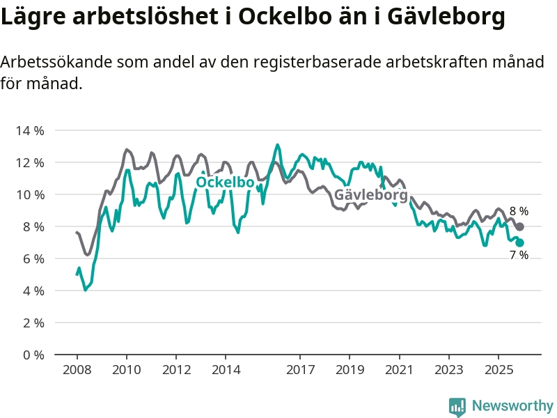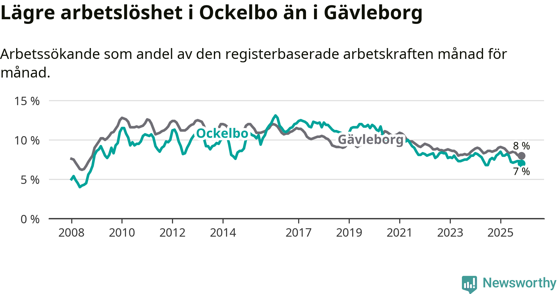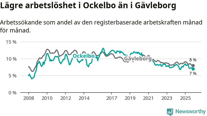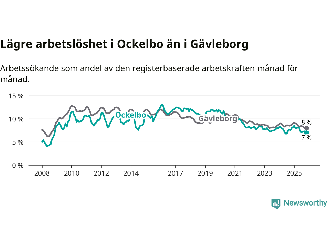 Under november månad rapporterade Ockelbo kommun en total arbetslöshet på 7,0 procent. Det är en minskning jämfört med samma tidpunkt i fjol (−1,0 procentenheter). Även i Gävleborgs län sjunker arbetslösheten .