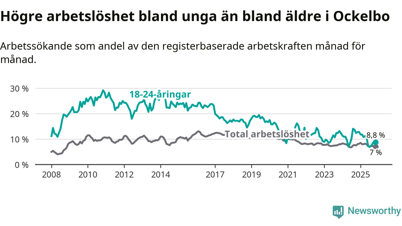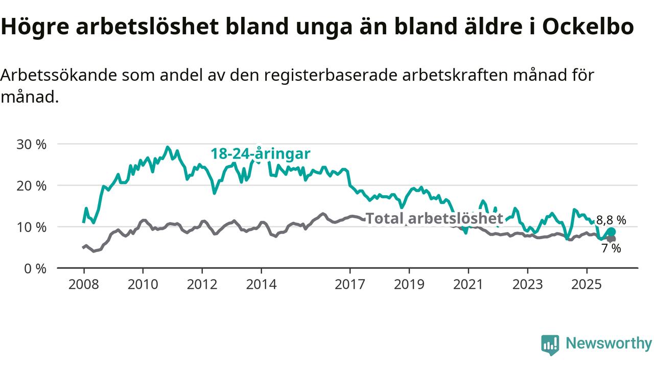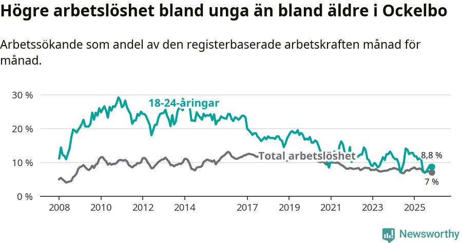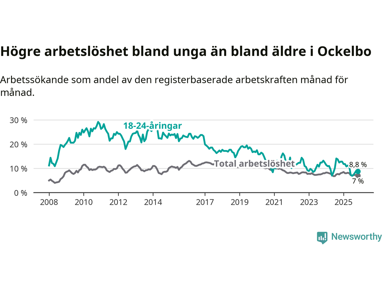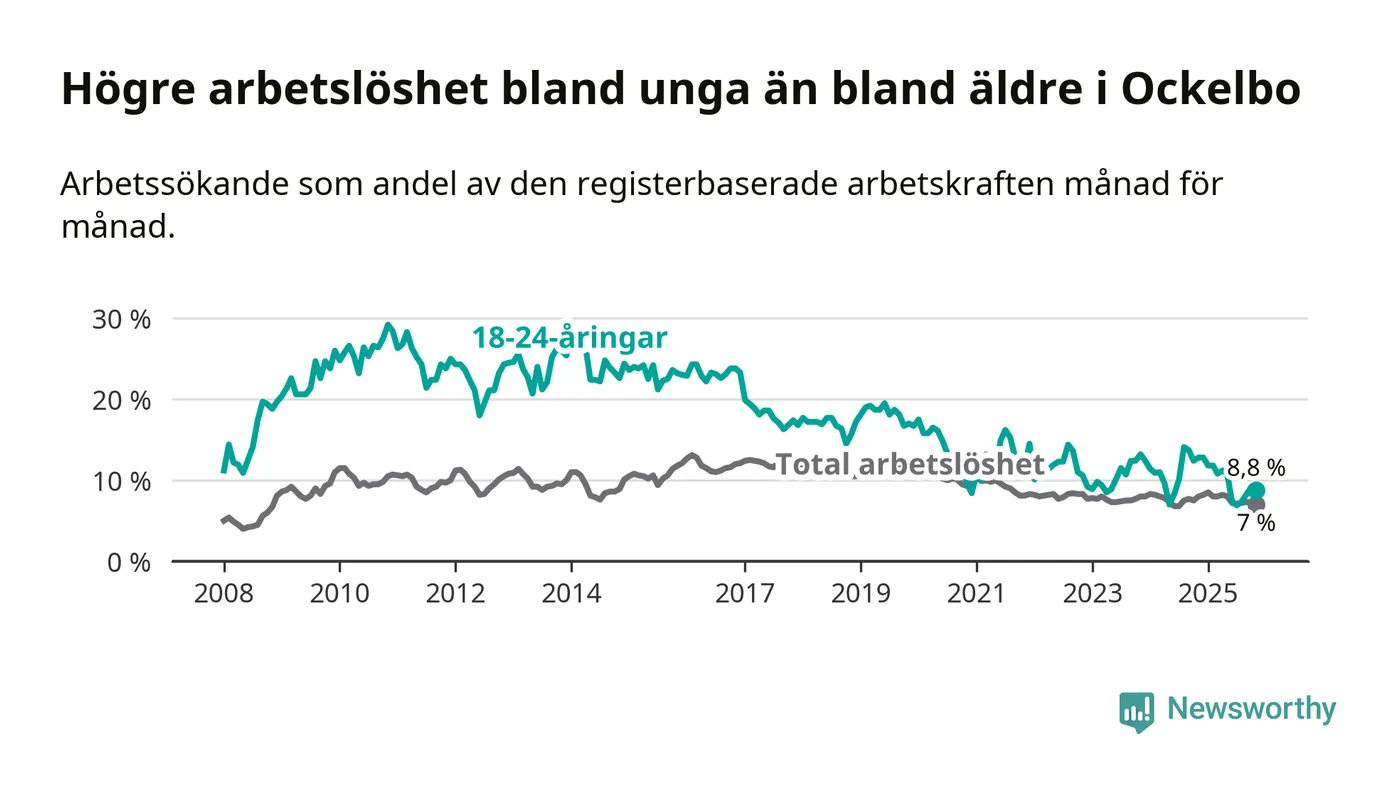 Under november månad rapporterade Ockelbo kommun en total arbetslöshet på 7,0 procent. Det är en minskning jämfört med samma tidpunkt i fjol (−1,0 procentenheter). Även i Gävleborgs län sjunker arbetslösheten .
