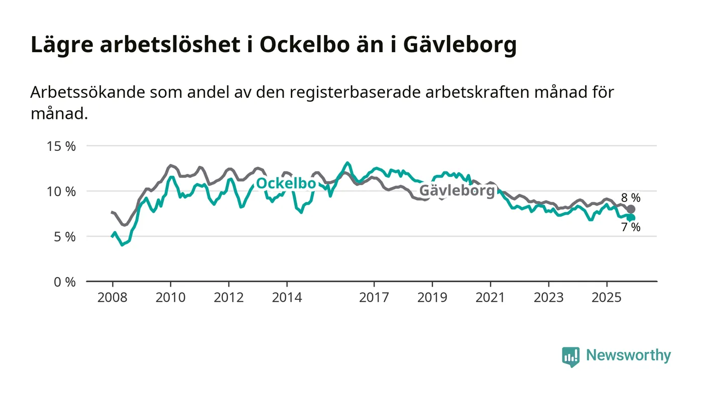 Ockelbo hade redan tidigare lägre arbetslöshet än snittet i hela Gävleborgs län och nu växer klyftan (7,0 procent i kommunen, jämfört med 8,0 procent i hela länet). Hudiksvall har den lägsta arbetslösheten i länet (5,7 procent), medan Söderhamn har den högsta (9,0 procent). För att Ockelbo skulle komma ner i samma arbetslöshetsnivå som Hudiksvall skulle 33 personer behöva sysselsättas.