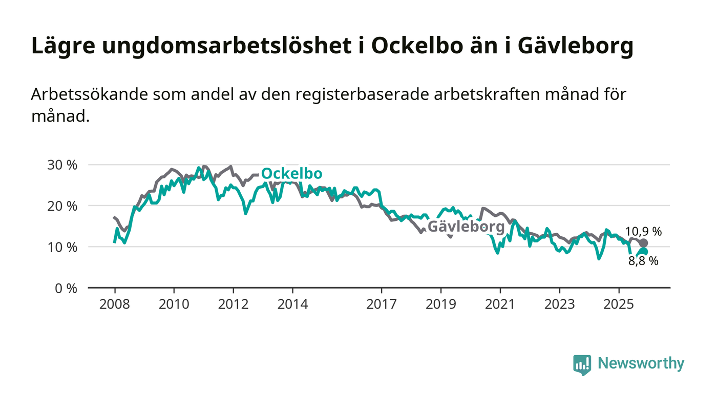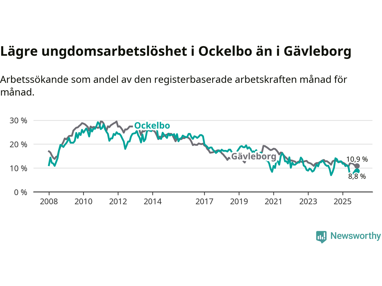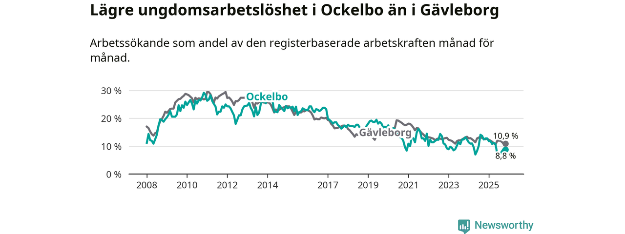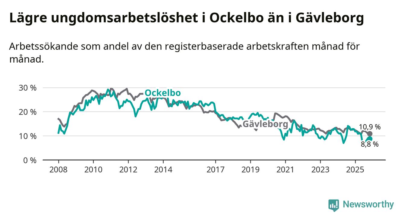 Precis som den totala arbetslösheten ligger ungdomsarbetslösheten i Ockelbo lägre än i Gävleborg som helhet. Skillnaden mellan kommunen och länet är 2,1 procentenheter.