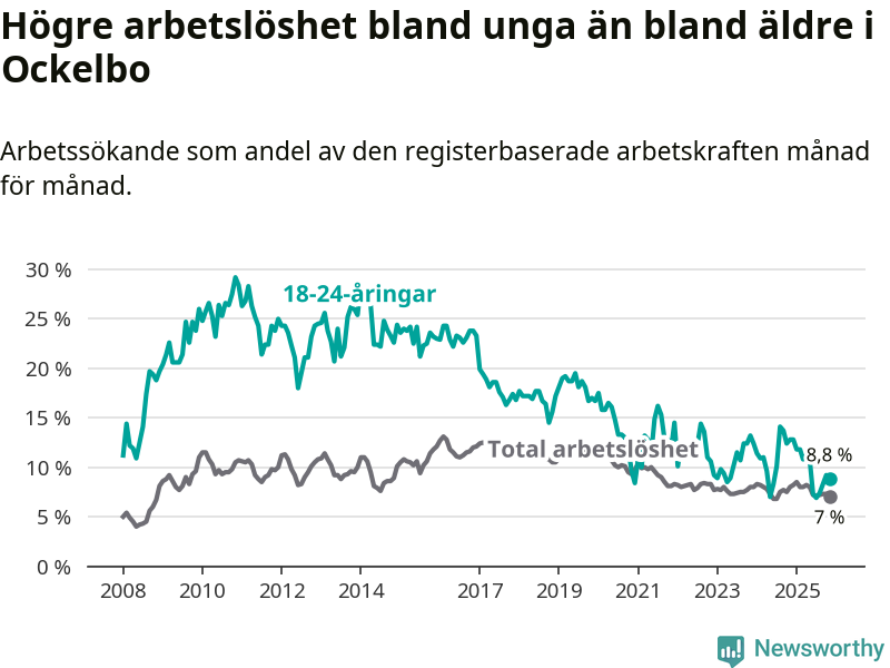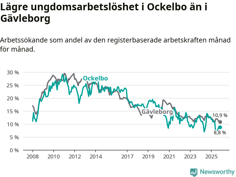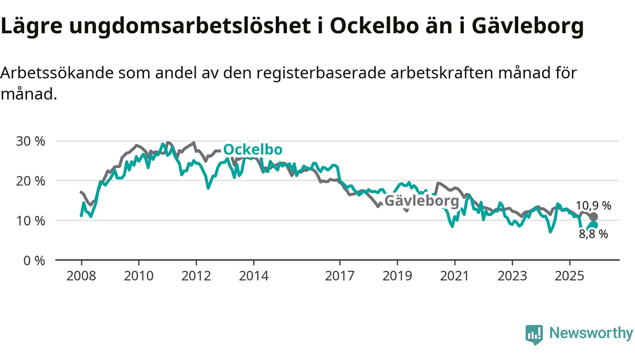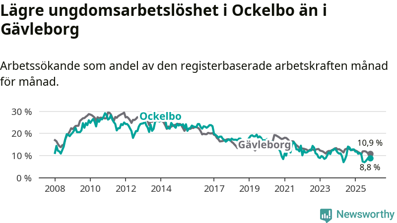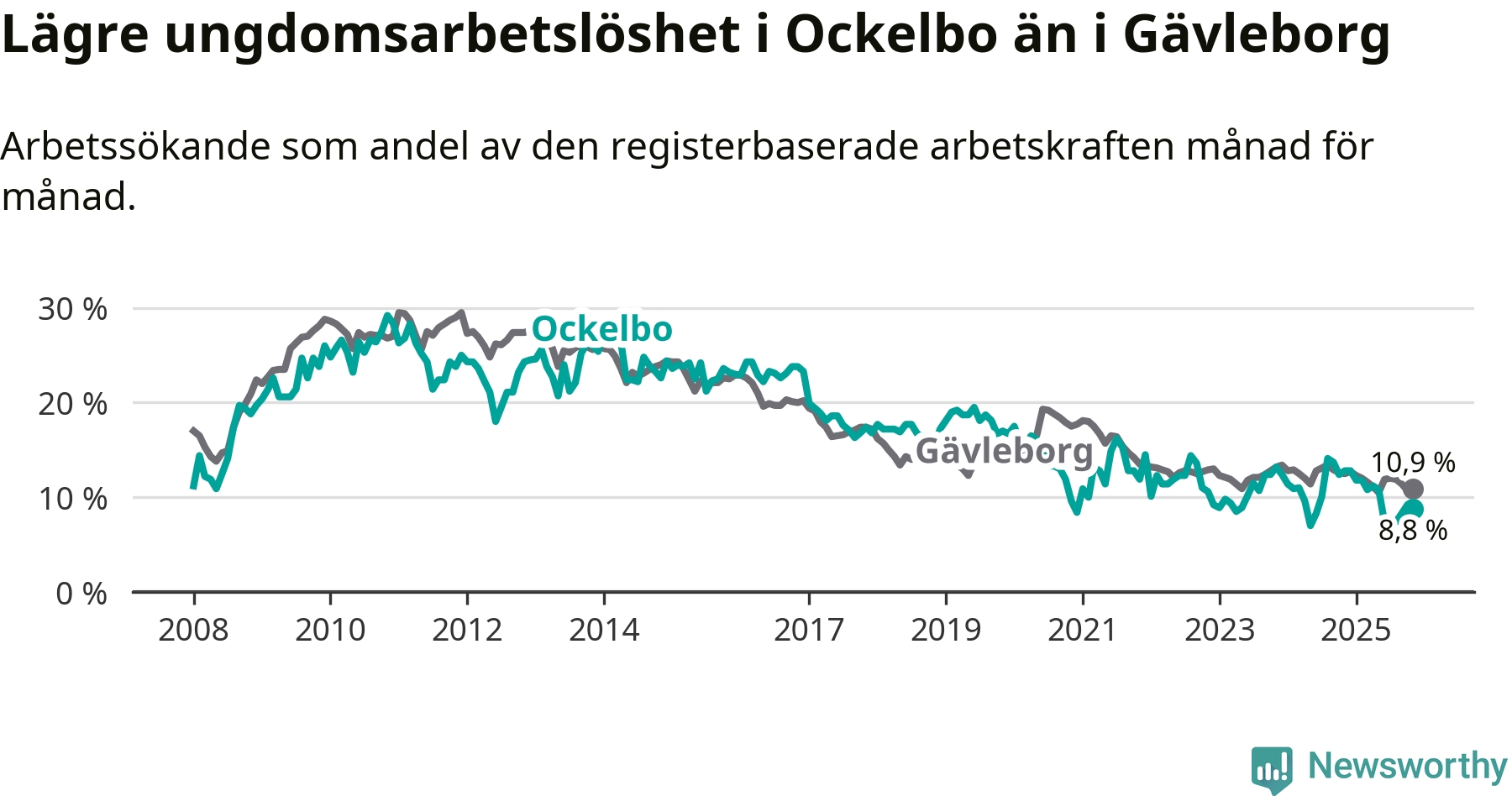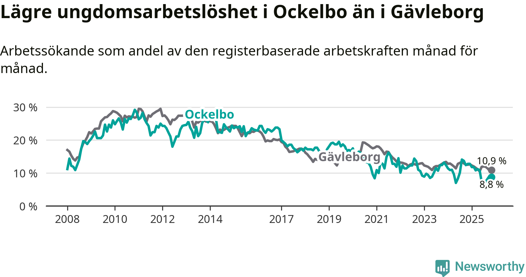 Precis som den totala arbetslösheten ligger ungdomsarbetslösheten i Ockelbo lägre än i Gävleborg som helhet. Skillnaden mellan kommunen och länet är 2,1 procentenheter.