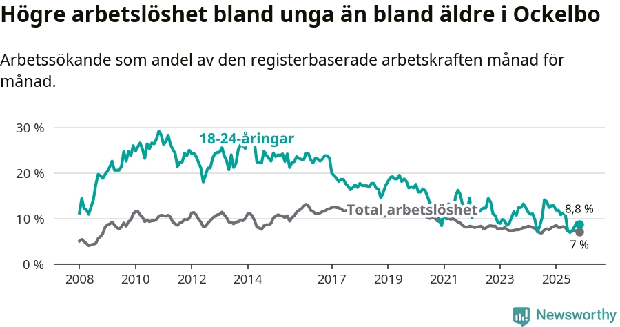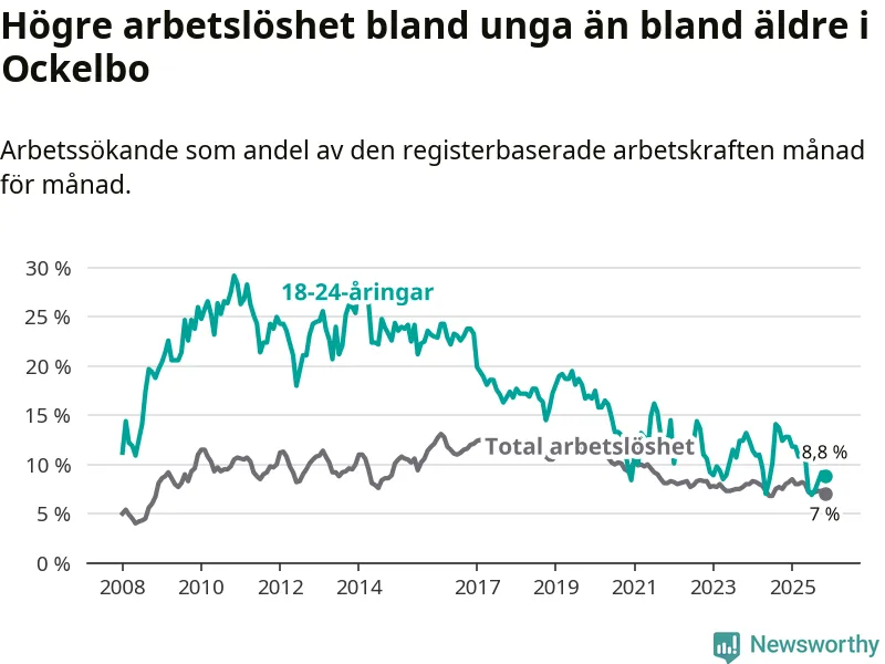 Precis som den totala arbetslösheten sjunker arbetslösheten bland unga (−4 procentenheter). I november var 8,8 procent av 18–24-åringarna inskrivna som arbetssökande (motsvarande 20 personer). Mäter vi antalet inskrivna ser vi en minskning med nio personer på ett års sikt.