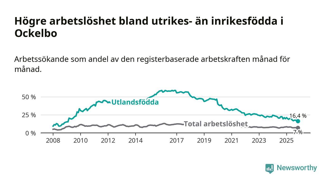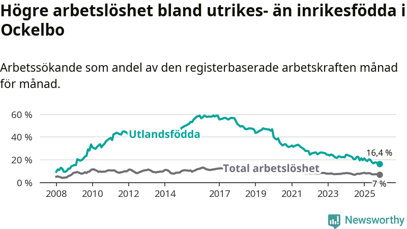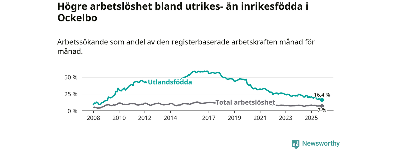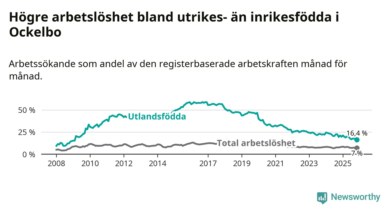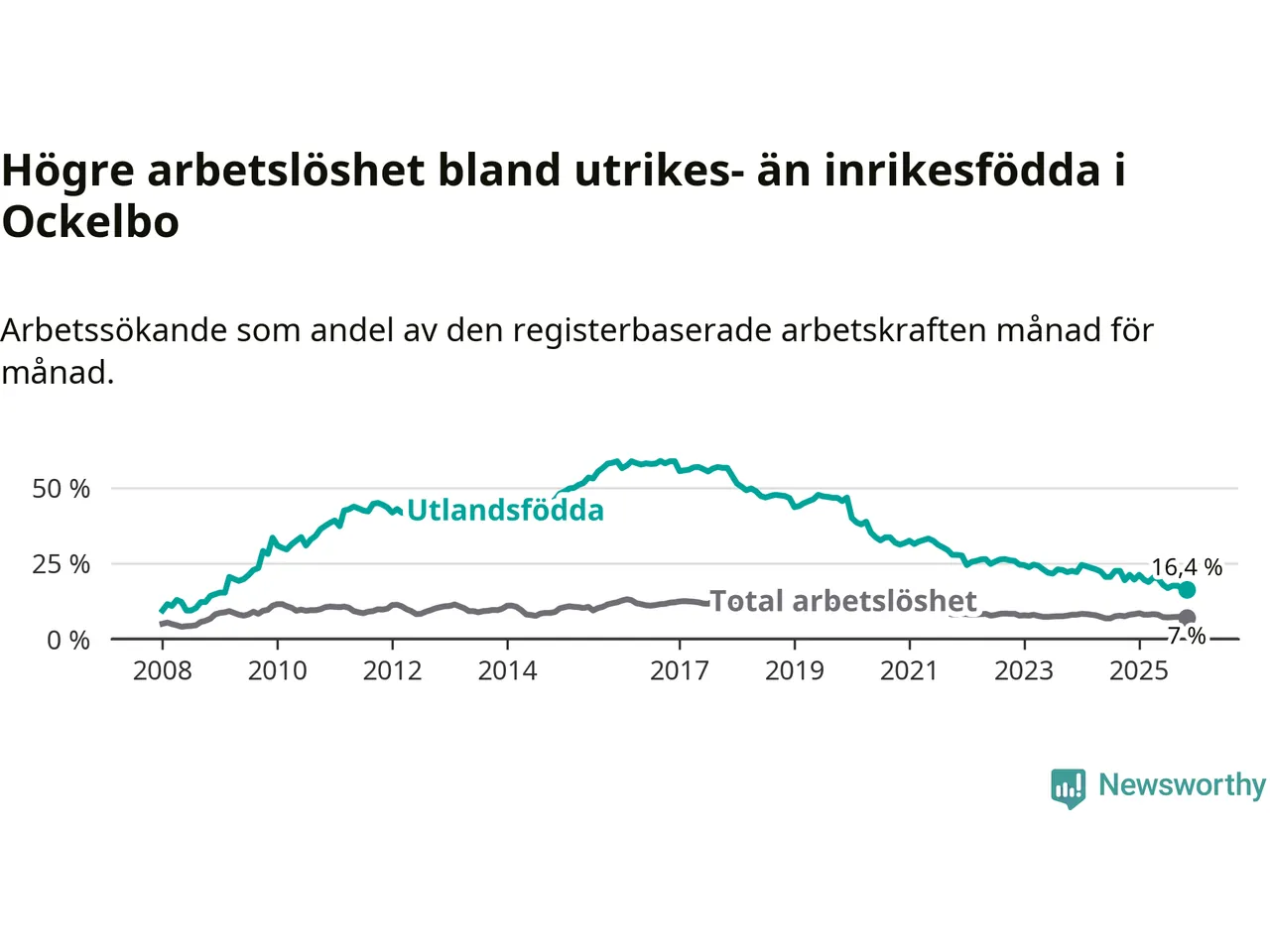 Arbetslösheten bland utlandsfödda var 16,4 procent i Ockelbo under november månad, motsvarande 64 av 390 personer. Det är 4,8 procentenheter färre än vid samma tidpunkt i fjol (−18 om man räknar personer). Därmed är de utlandsföddas arbetslöshet lägre än vid samma tidpunkt i fjol för 21:a månaden i följd. Sedan februari 2024 har arbetslösheten bland utlandsfödda minskat från 24,0 till 16,4 procent. Den nuvarande arbetslöshetsnivån är den lägsta sedan februari 2009.