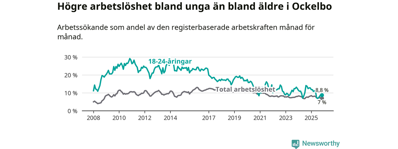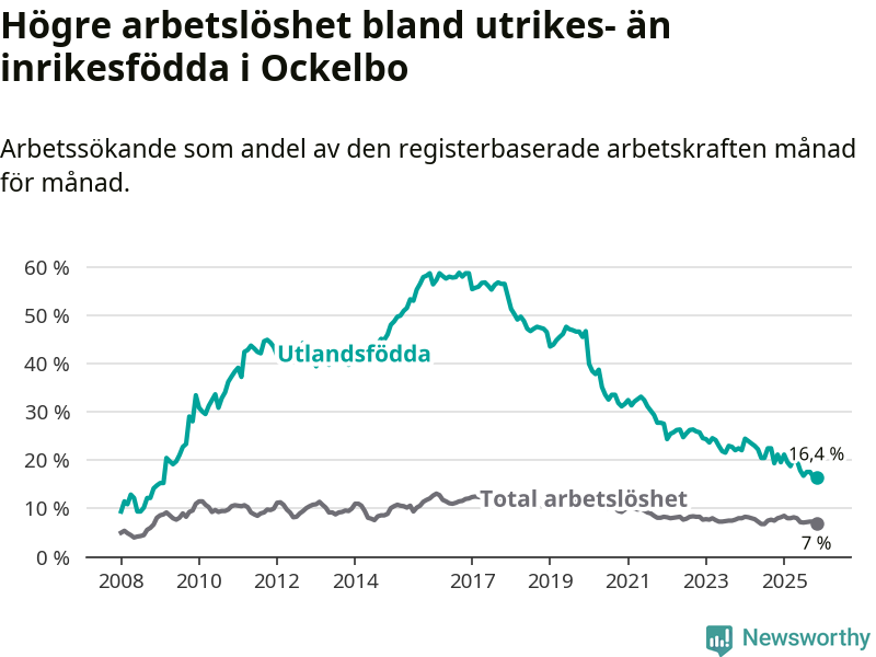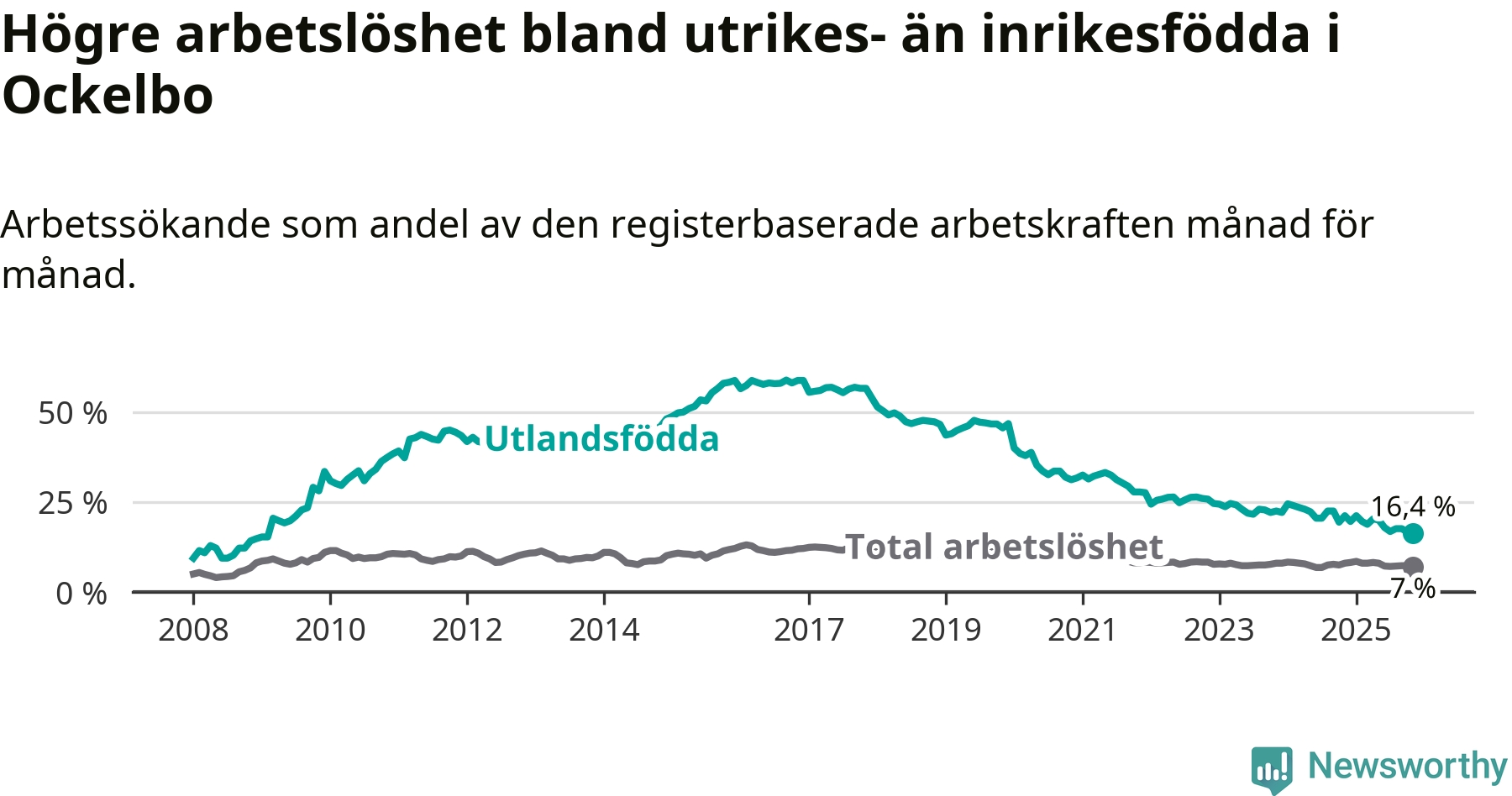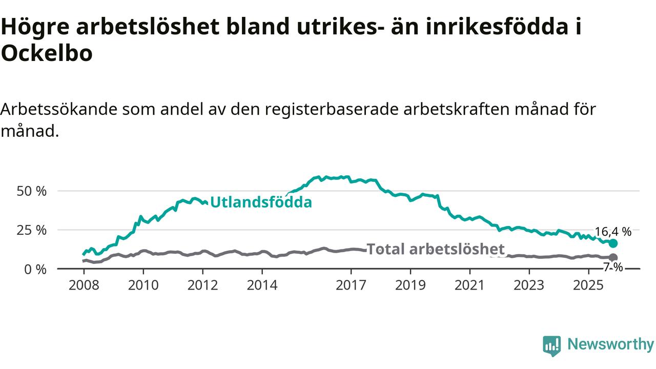 Arbetslösheten bland utlandsfödda var 16,4 procent i Ockelbo under november månad, motsvarande 64 av 390 personer. Det är 4,8 procentenheter färre än vid samma tidpunkt i fjol (−18 om man räknar personer). Därmed är de utlandsföddas arbetslöshet lägre än vid samma tidpunkt i fjol för 21:a månaden i följd. Sedan februari 2024 har arbetslösheten bland utlandsfödda minskat från 24,0 till 16,4 procent. Den nuvarande arbetslöshetsnivån är den lägsta sedan februari 2009.