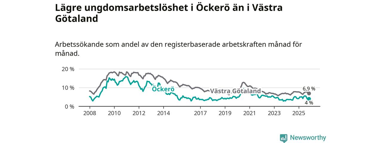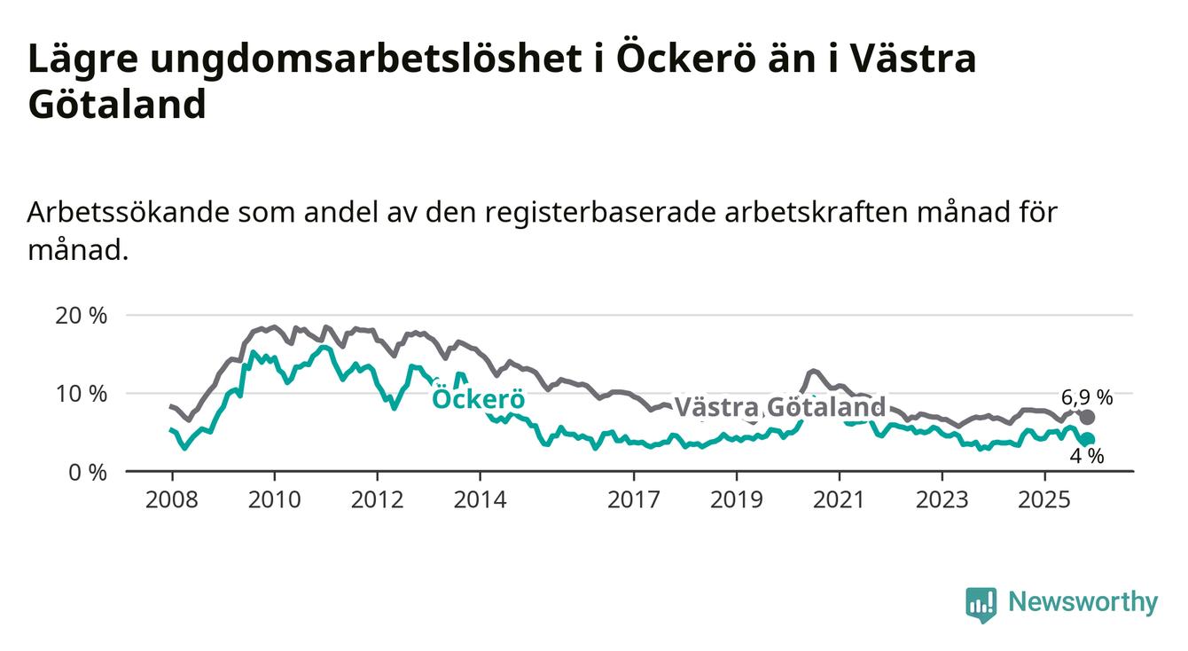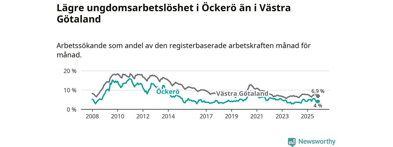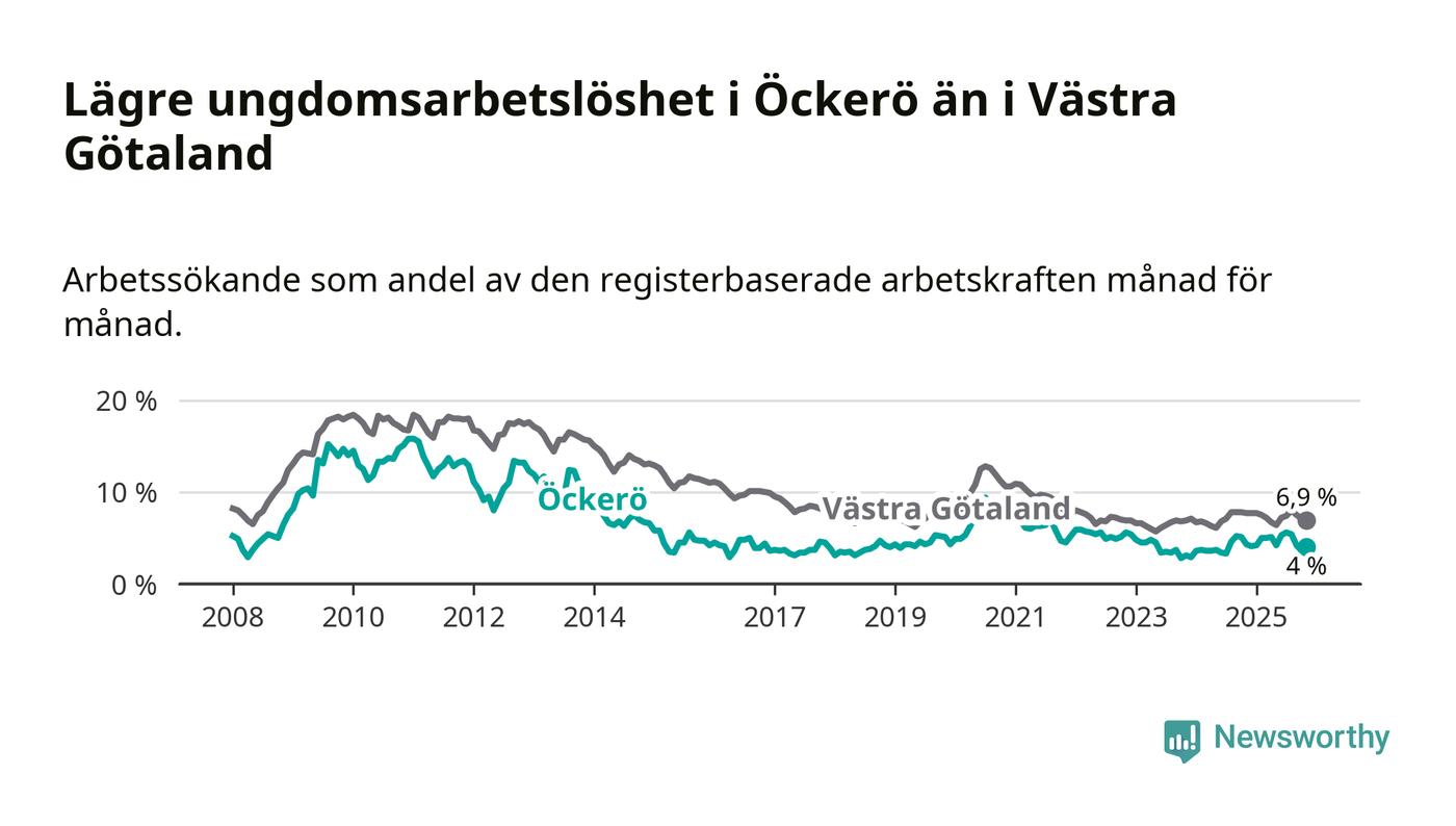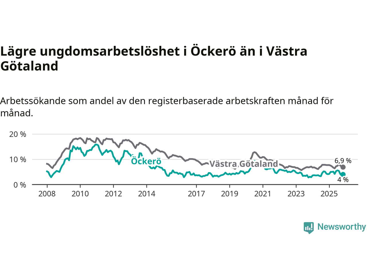 Precis som den totala arbetslösheten ligger ungdomsarbetslösheten på Öckerö lägre än i Västra Götaland som helhet. Skillnaden mellan kommunen och länet är 2,9 procentenheter.