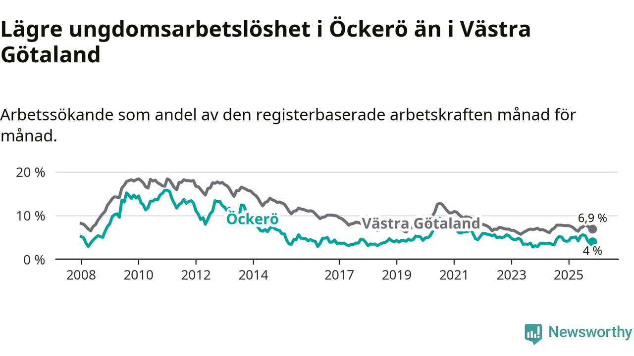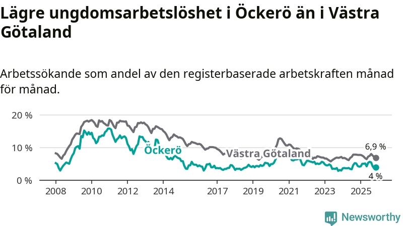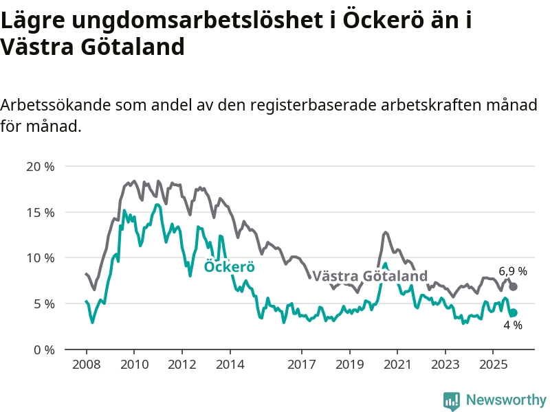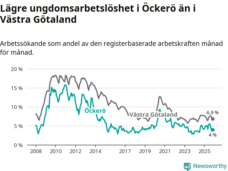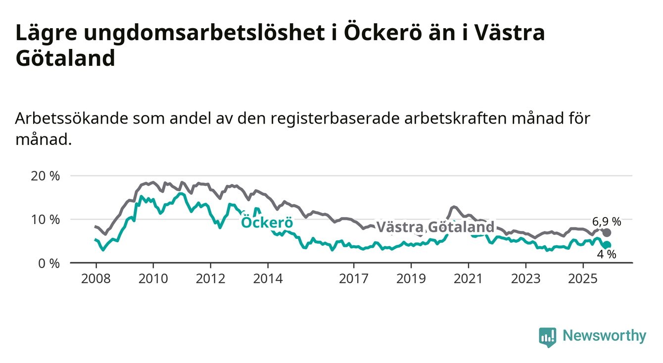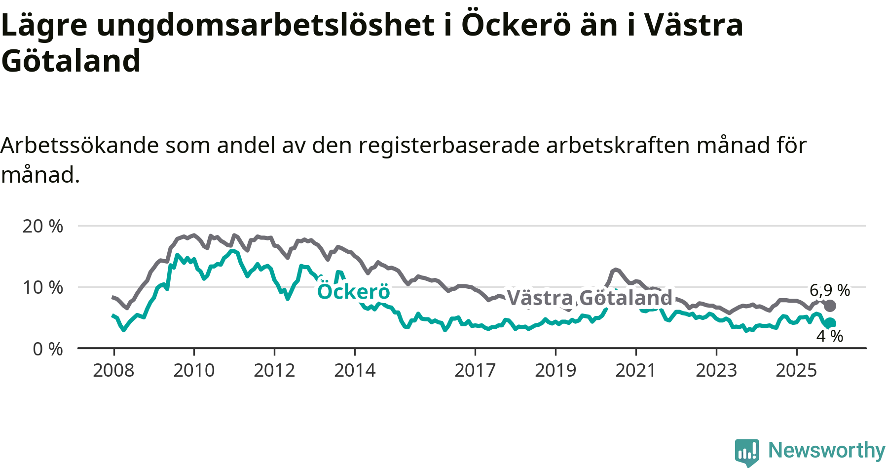 Precis som den totala arbetslösheten ligger ungdomsarbetslösheten på Öckerö lägre än i Västra Götaland som helhet. Skillnaden mellan kommunen och länet är 2,9 procentenheter.