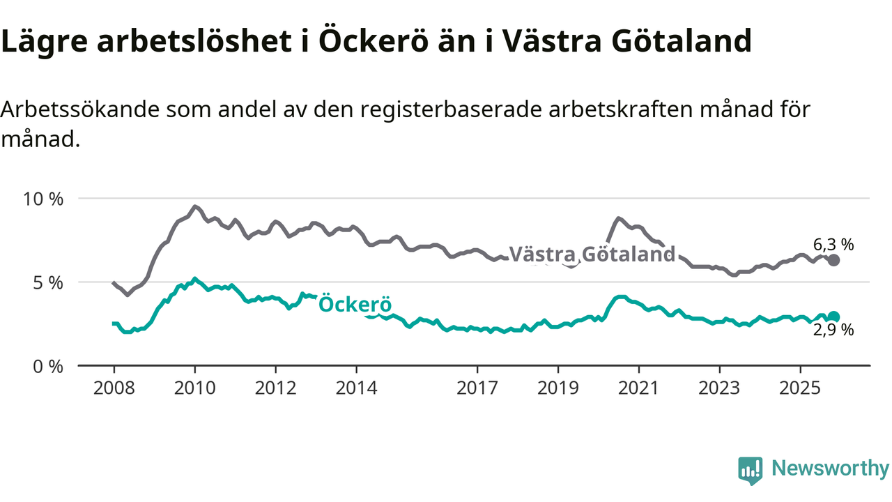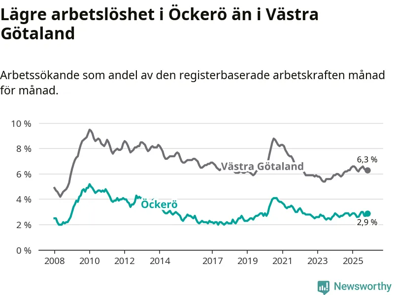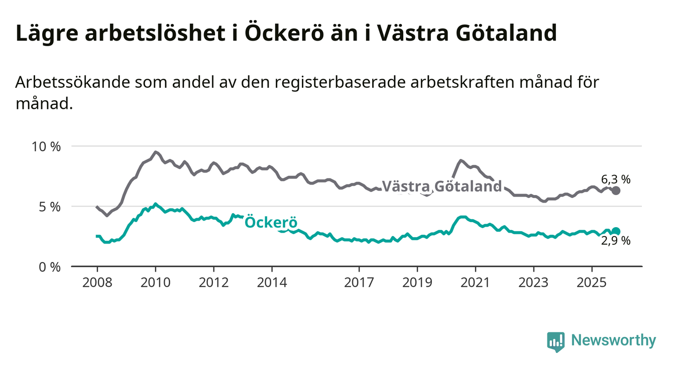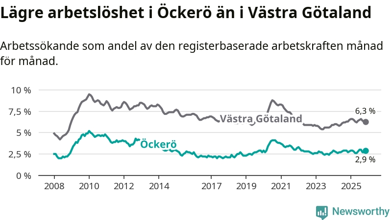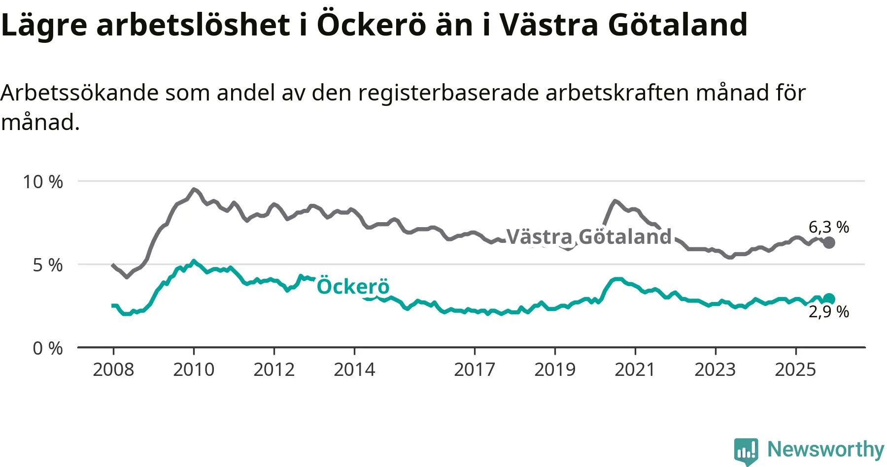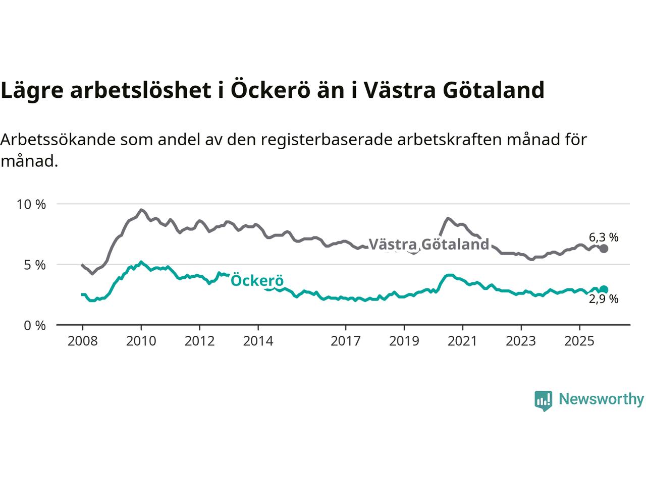 Även om arbetslösheten på Öckerö alltså ökar, så ligger den fortfarande under snittet i hela Västra Götalands län (2,9 procent i kommunen, jämfört med 6,3 procent i hela länet). Öckerö har därmed även den lägsta arbetslöshetsnivån i länet. Gullspång har den högsta (8,6 procent).