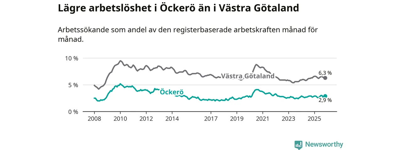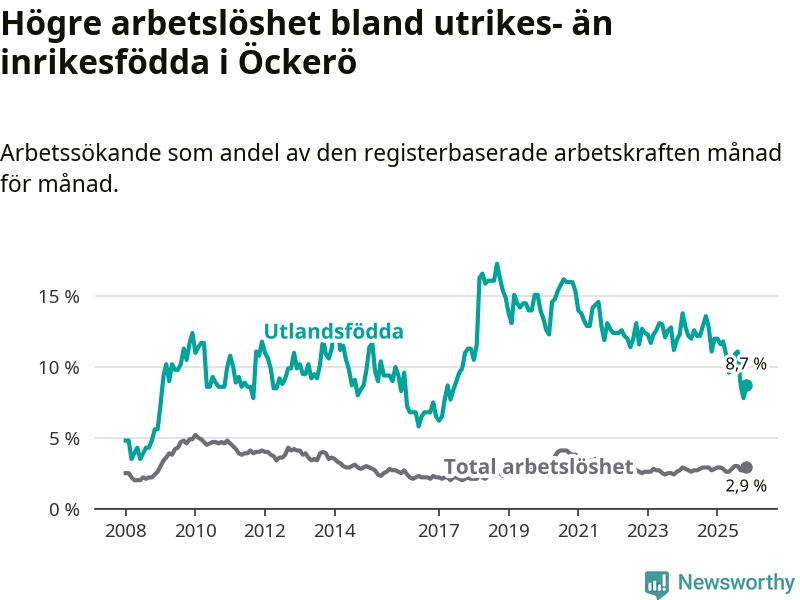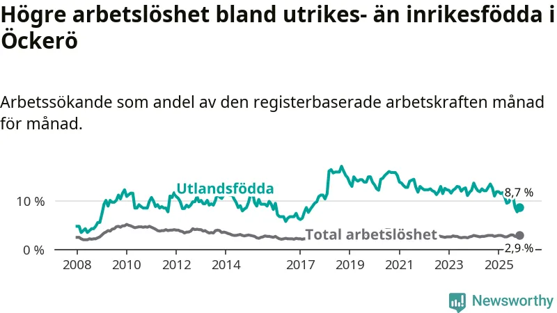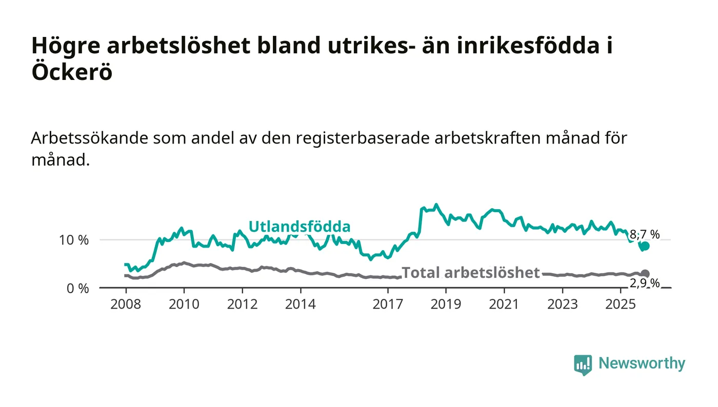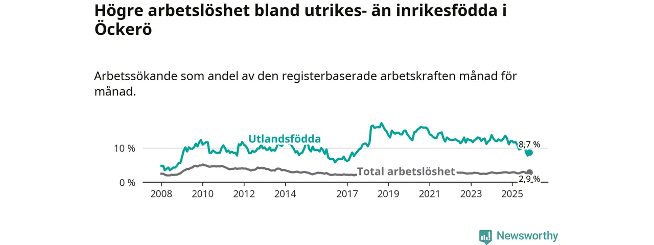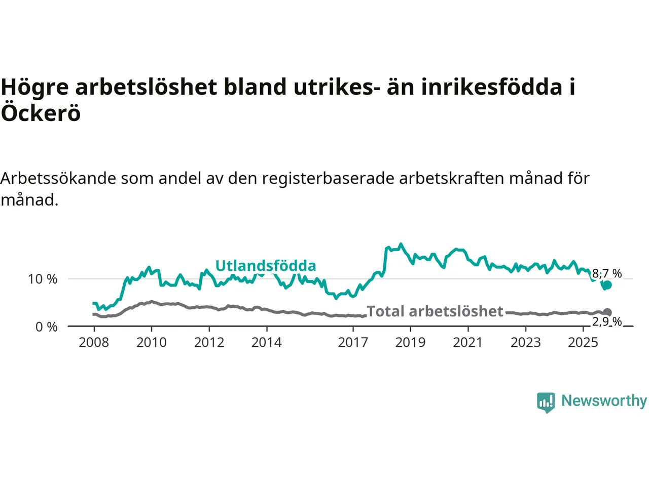 Arbetslösheten bland utlandsfödda var 8,7 procent på Öckerö under november månad, motsvarande 40 av 460 personer. Det är 2,4 procentenheter färre än vid samma tidpunkt i fjol (−11 om man räknar personer). Därmed är de utlandsföddas arbetslöshet lägre än vid samma tidpunkt i fjol för 13:e månaden i följd. Sedan oktober 2024 har arbetslösheten bland utlandsfödda minskat från 12,8 till 8,7 procent.