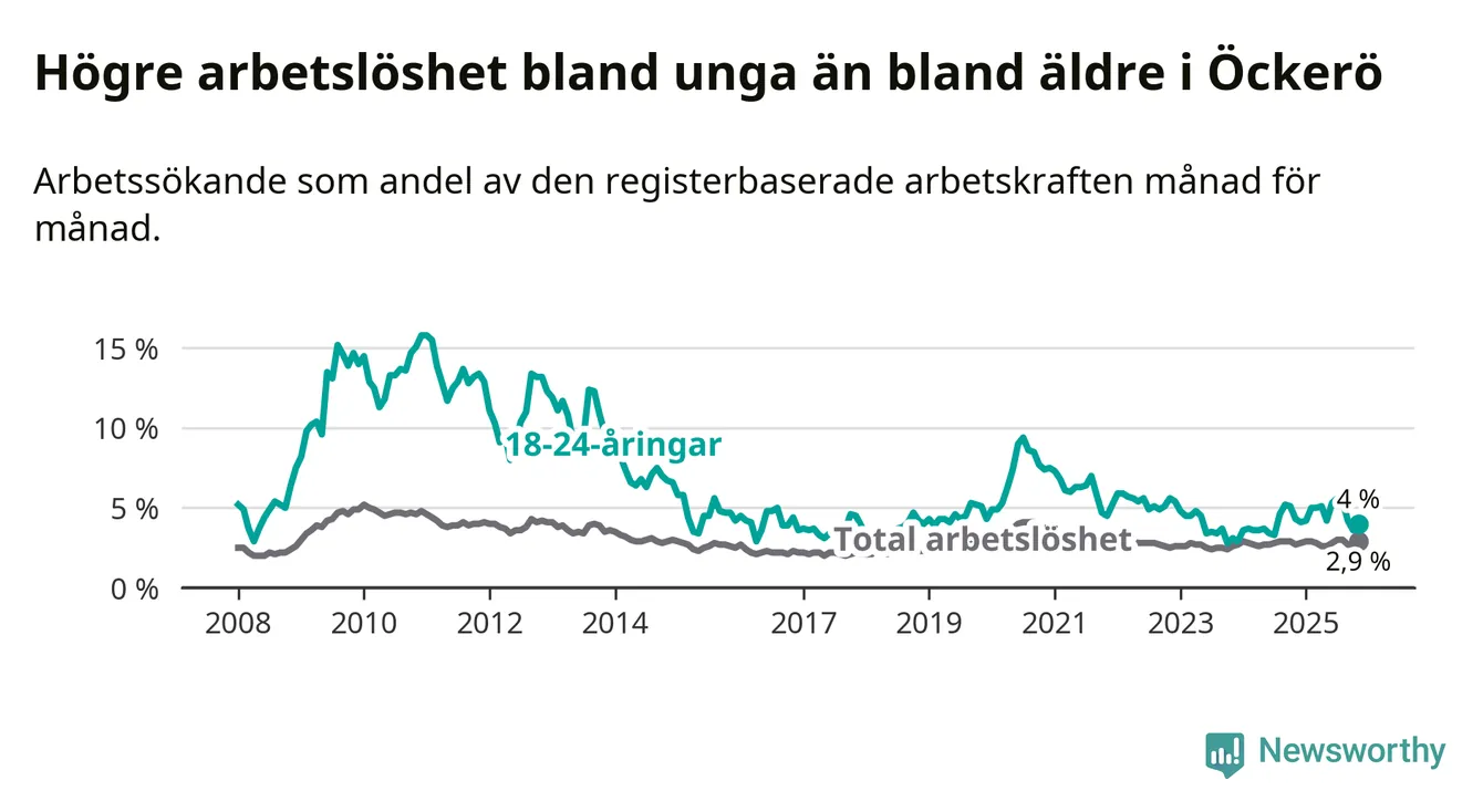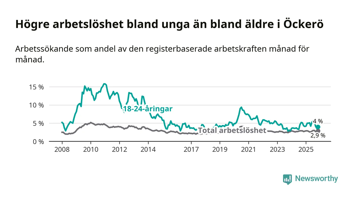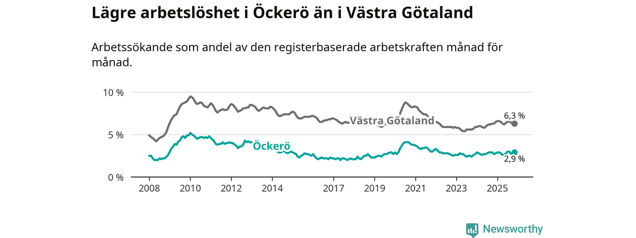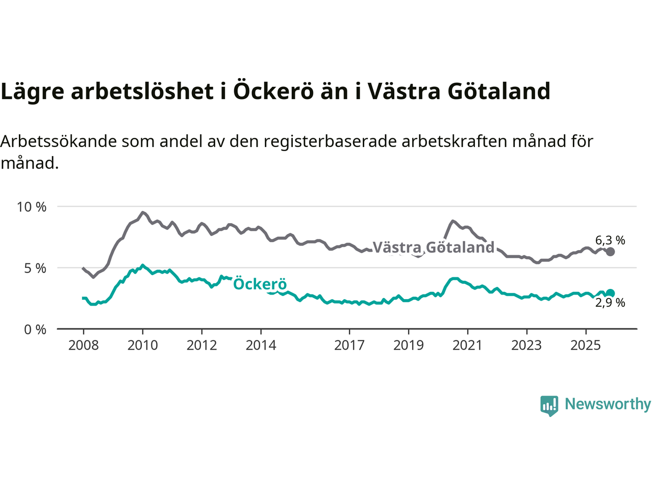 Arbetslösheten bland utlandsfödda var 8,7 procent på Öckerö under november månad, motsvarande 40 av 460 personer. Det är 2,4 procentenheter färre än vid samma tidpunkt i fjol (−11 om man räknar personer). Därmed är de utlandsföddas arbetslöshet lägre än vid samma tidpunkt i fjol för 13:e månaden i följd. Sedan oktober 2024 har arbetslösheten bland utlandsfödda minskat från 12,8 till 8,7 procent.