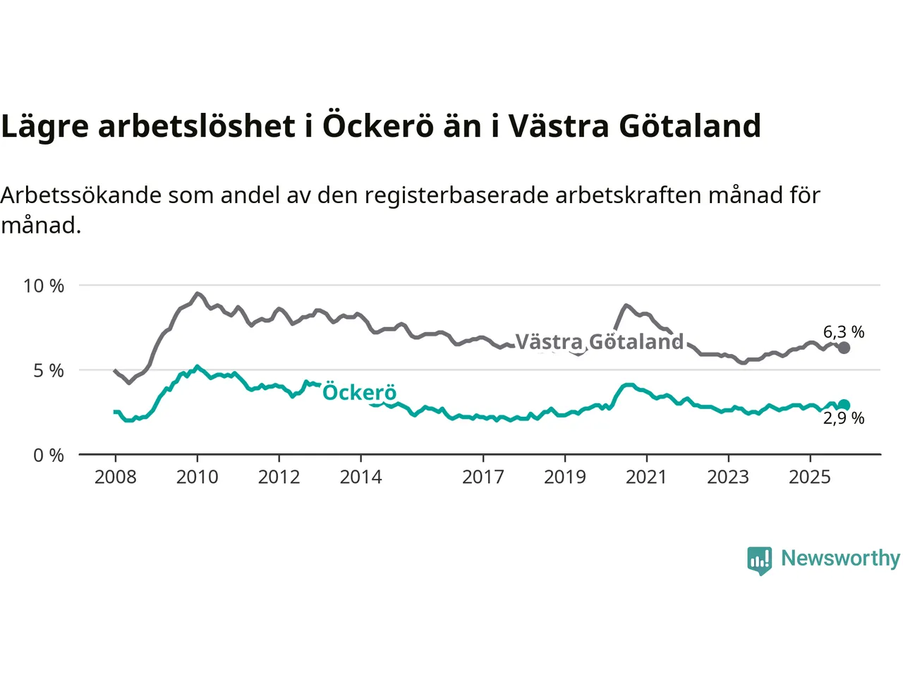 Under november månad rapporterade Öckerö kommun en total arbetslöshet på 2,9 procent. Det är en ökning jämfört med samma tidpunkt i fjol (+0,2 procentenheter). I Västra Götalands län däremot står arbetslösheten stilla.