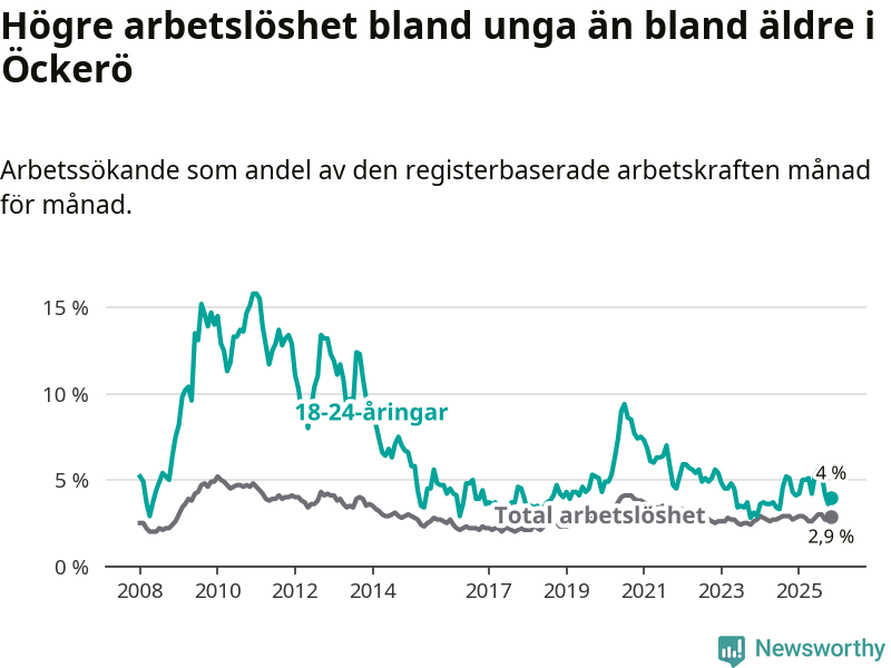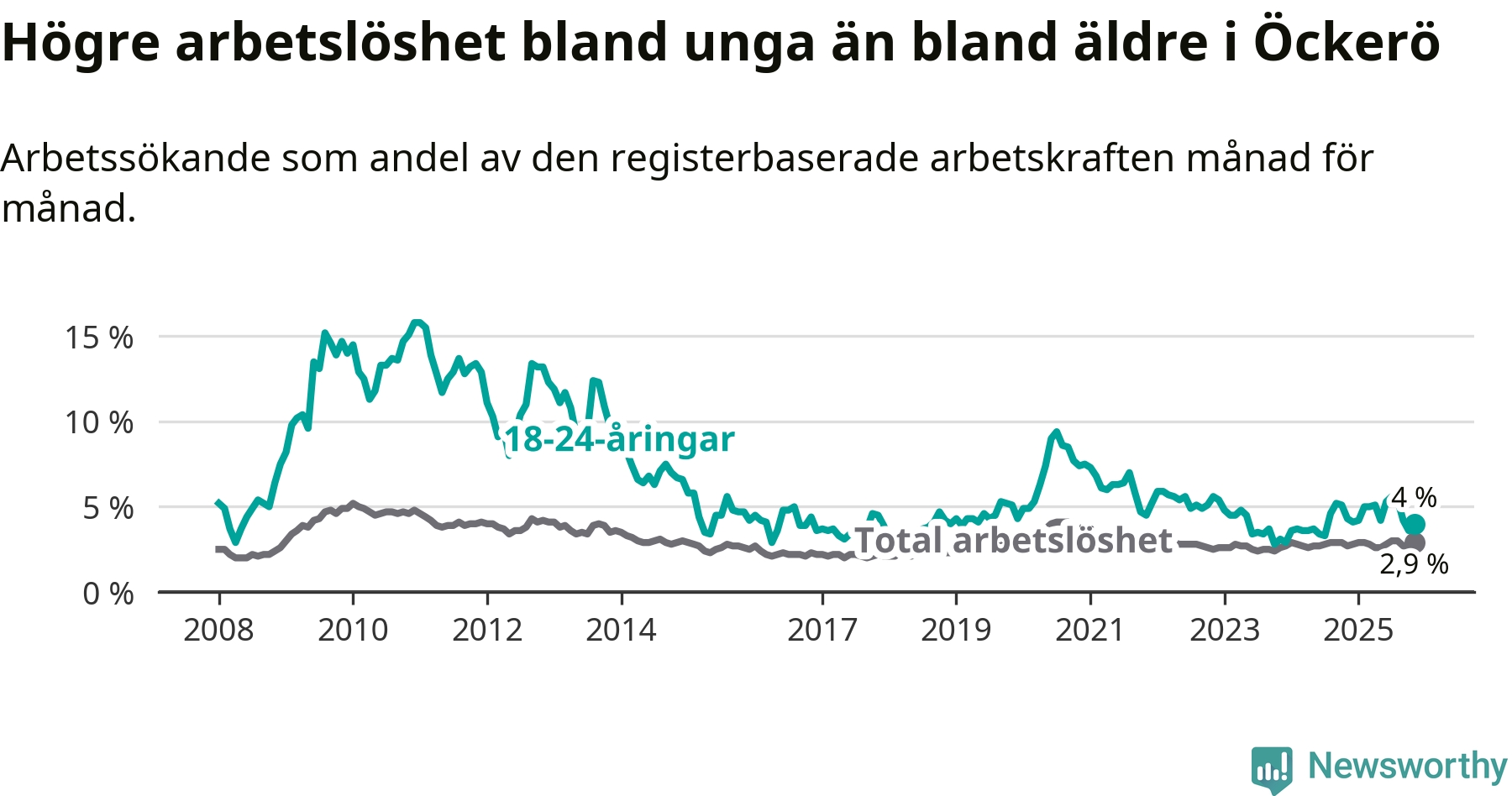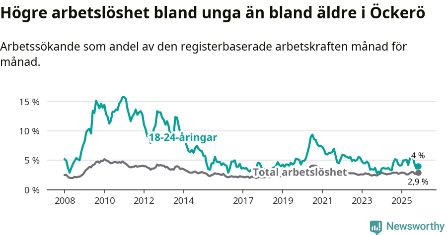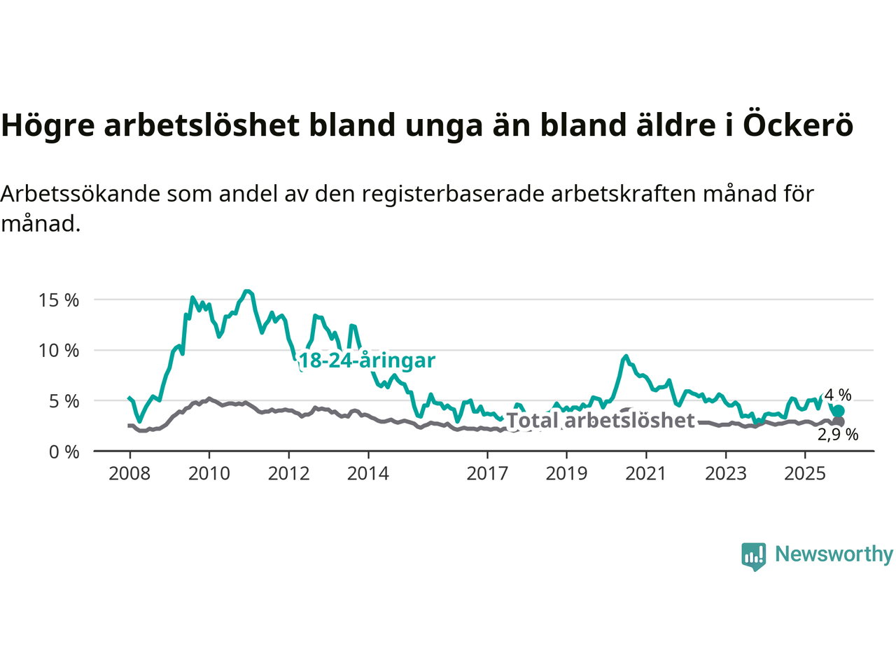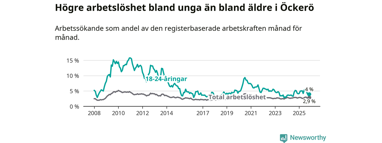 Till skillnad från den totala arbetslösheten sjunker arbetslösheten bland unga (−0,3 procentenheter). I november var 4,0 procent av 18–24-åringarna inskrivna som arbetssökande (motsvarande 27 personer). Mäter vi antalet inskrivna ser vi en minskning med två personer på ett års sikt.