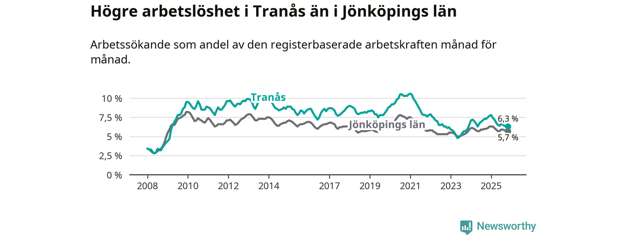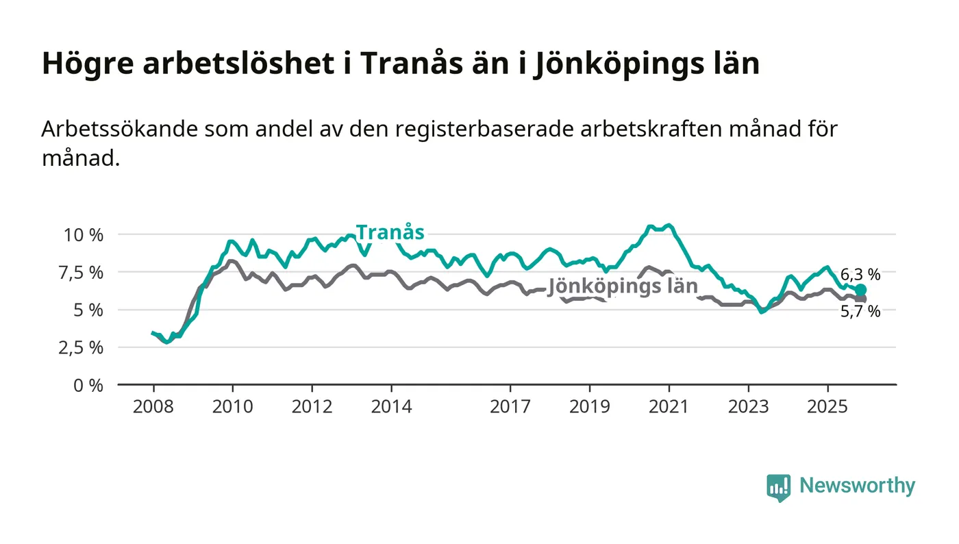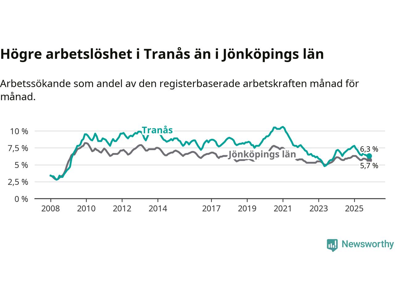 Även om arbetslösheten i Tranås alltså minskar, så ligger den fortfarande över snittet i hela Jönköpings län (6,3 procent i kommunen, jämfört med 5,7 procent i hela länet). Habo har den lägsta arbetslösheten i länet (3,3 procent), medan Nässjö har den högsta (7,6 procent). För att Tranås skulle komma ner i samma arbetslöshetsnivå som Habo skulle 263 personer behöva sysselsättas.