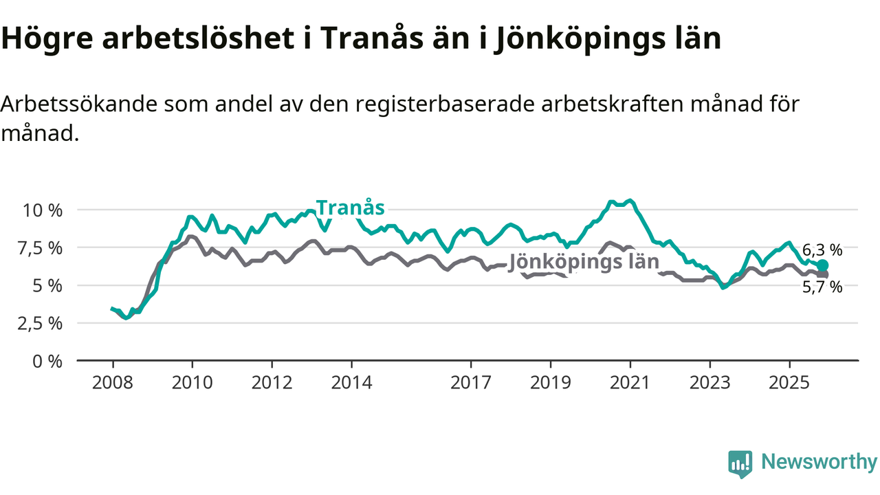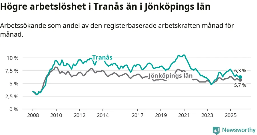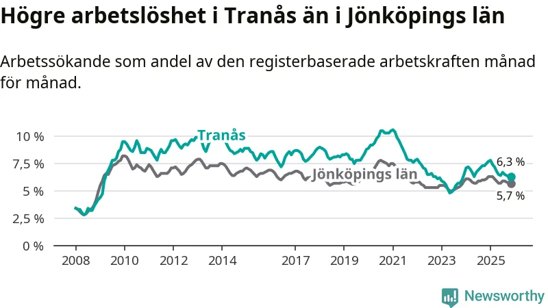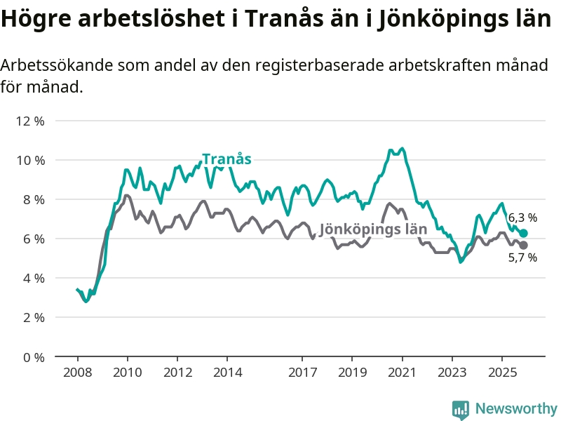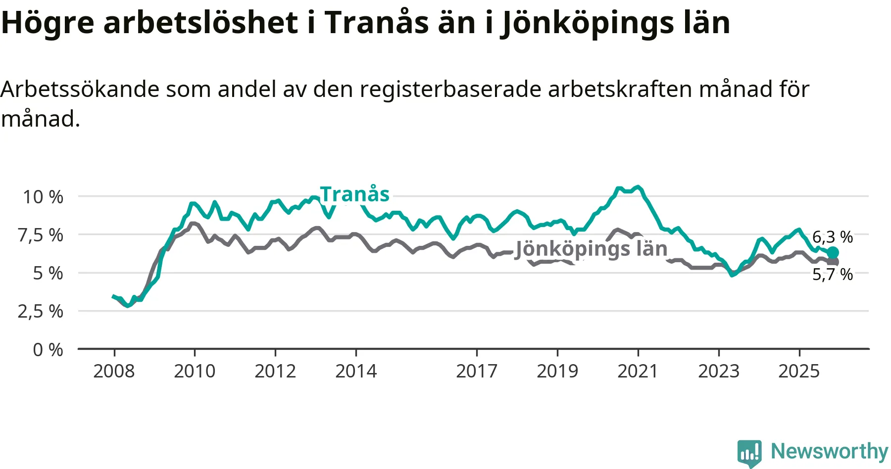 Även om arbetslösheten i Tranås alltså minskar, så ligger den fortfarande över snittet i hela Jönköpings län (6,3 procent i kommunen, jämfört med 5,7 procent i hela länet). Habo har den lägsta arbetslösheten i länet (3,3 procent), medan Nässjö har den högsta (7,6 procent). För att Tranås skulle komma ner i samma arbetslöshetsnivå som Habo skulle 263 personer behöva sysselsättas.