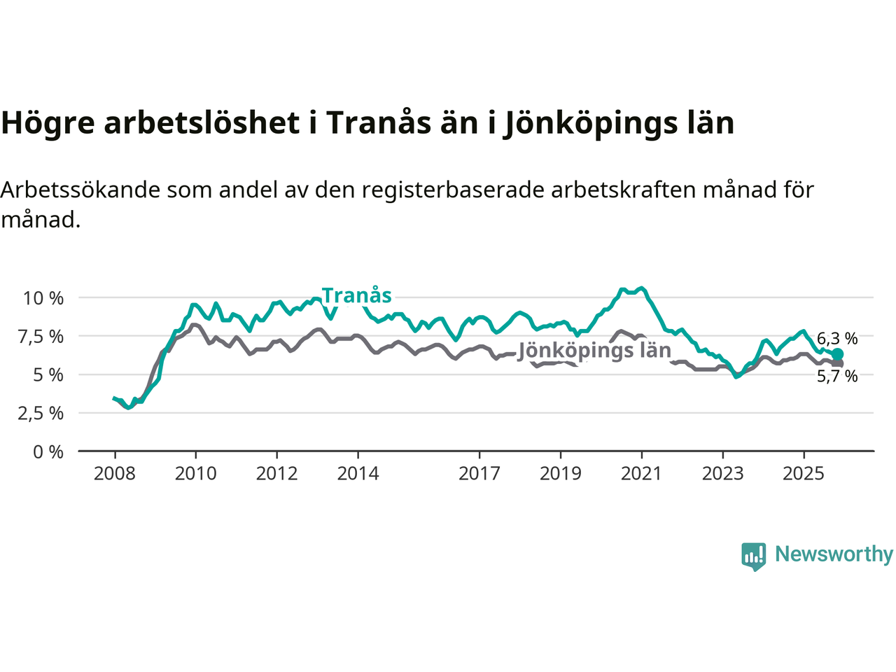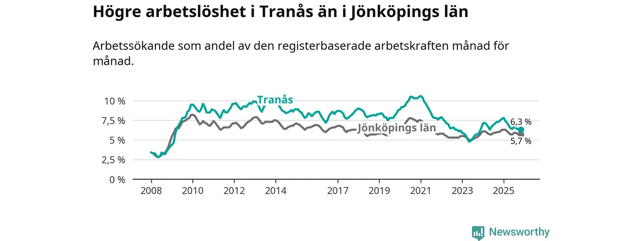 Under november månad rapporterade Tranås kommun en total arbetslöshet på 6,3 procent. Det är en minskning jämfört med samma tidpunkt i fjol (−1,2 procentenheter). Även i Jönköpings län sjunker arbetslösheten .