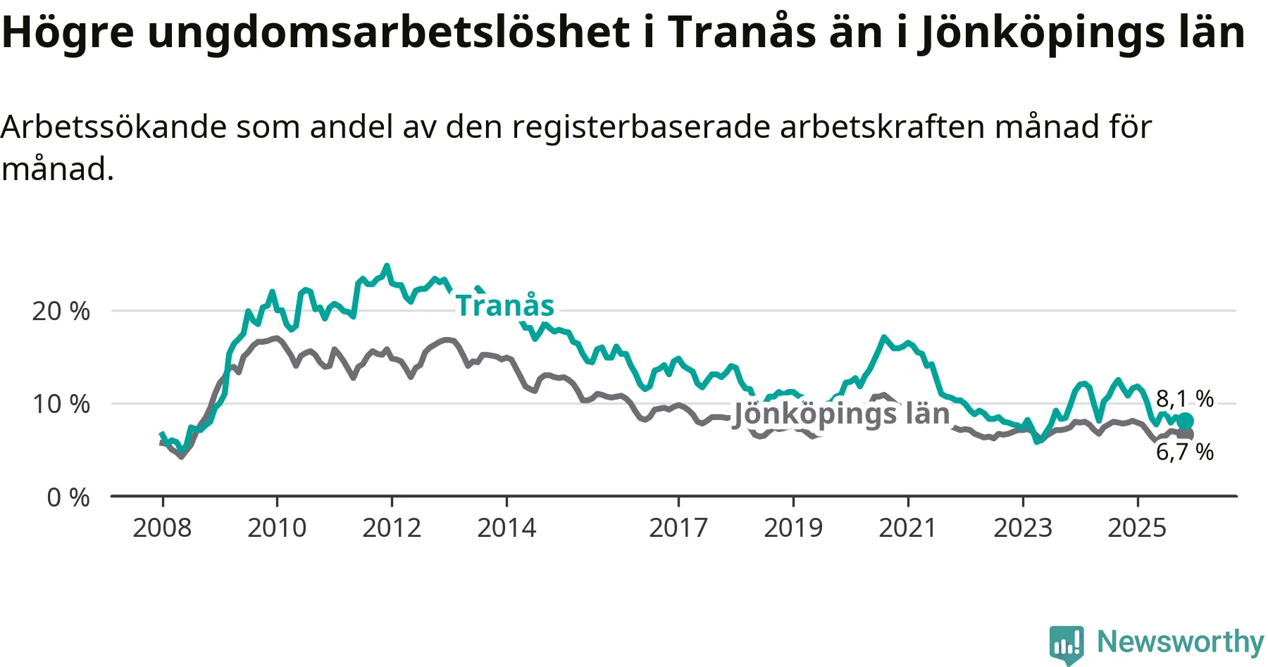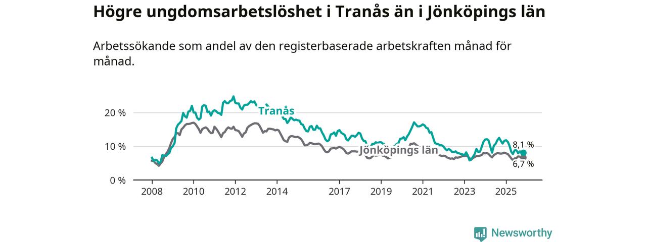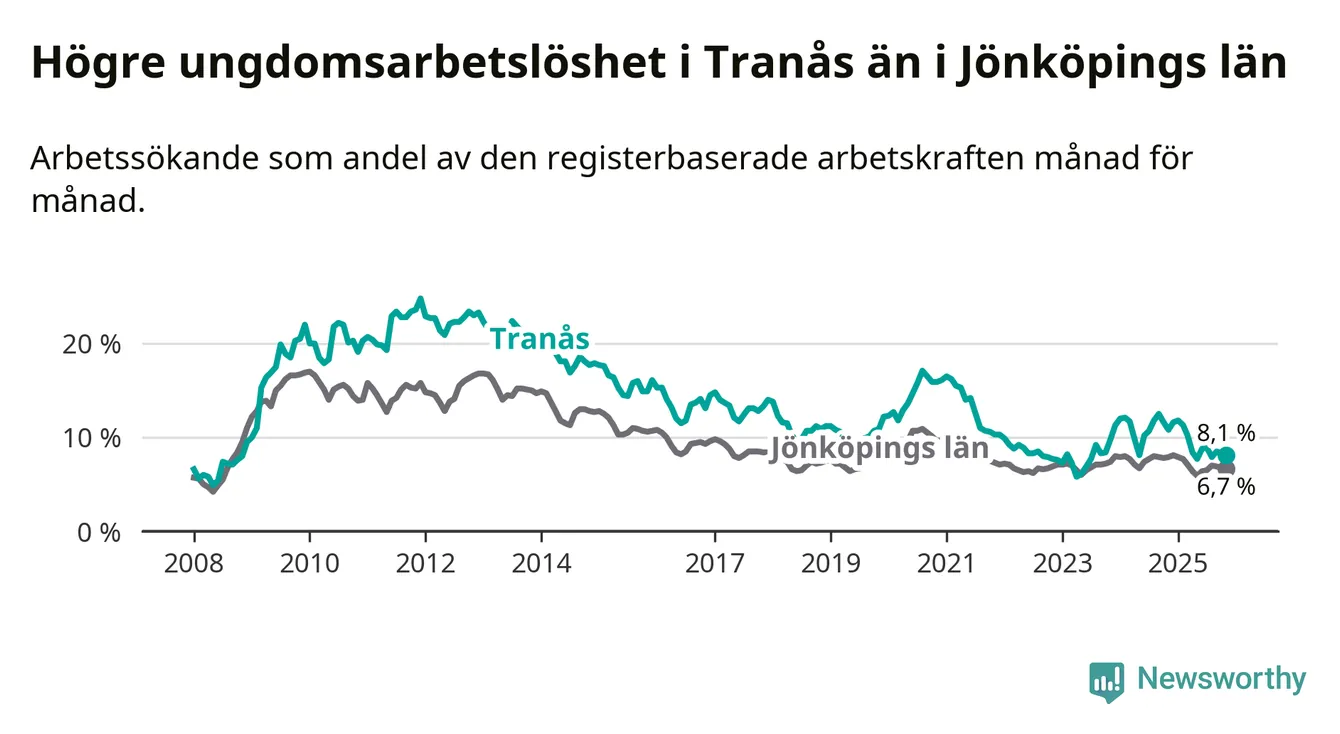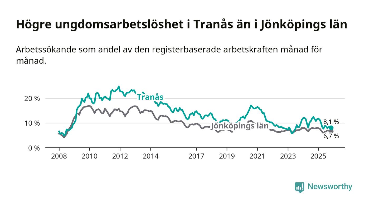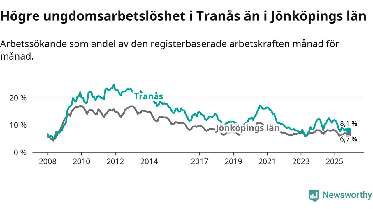 I och med den senaste månadens nedgång har de ungas arbetslöshet i Tranås sjunkit elva månader i följd (ner från 11,6 procent i december 2024 till 8,1 procent nu).