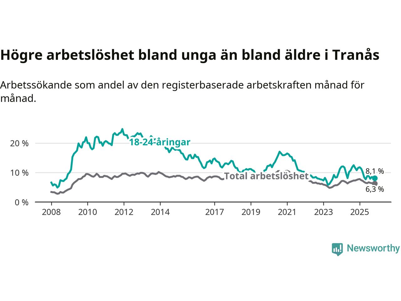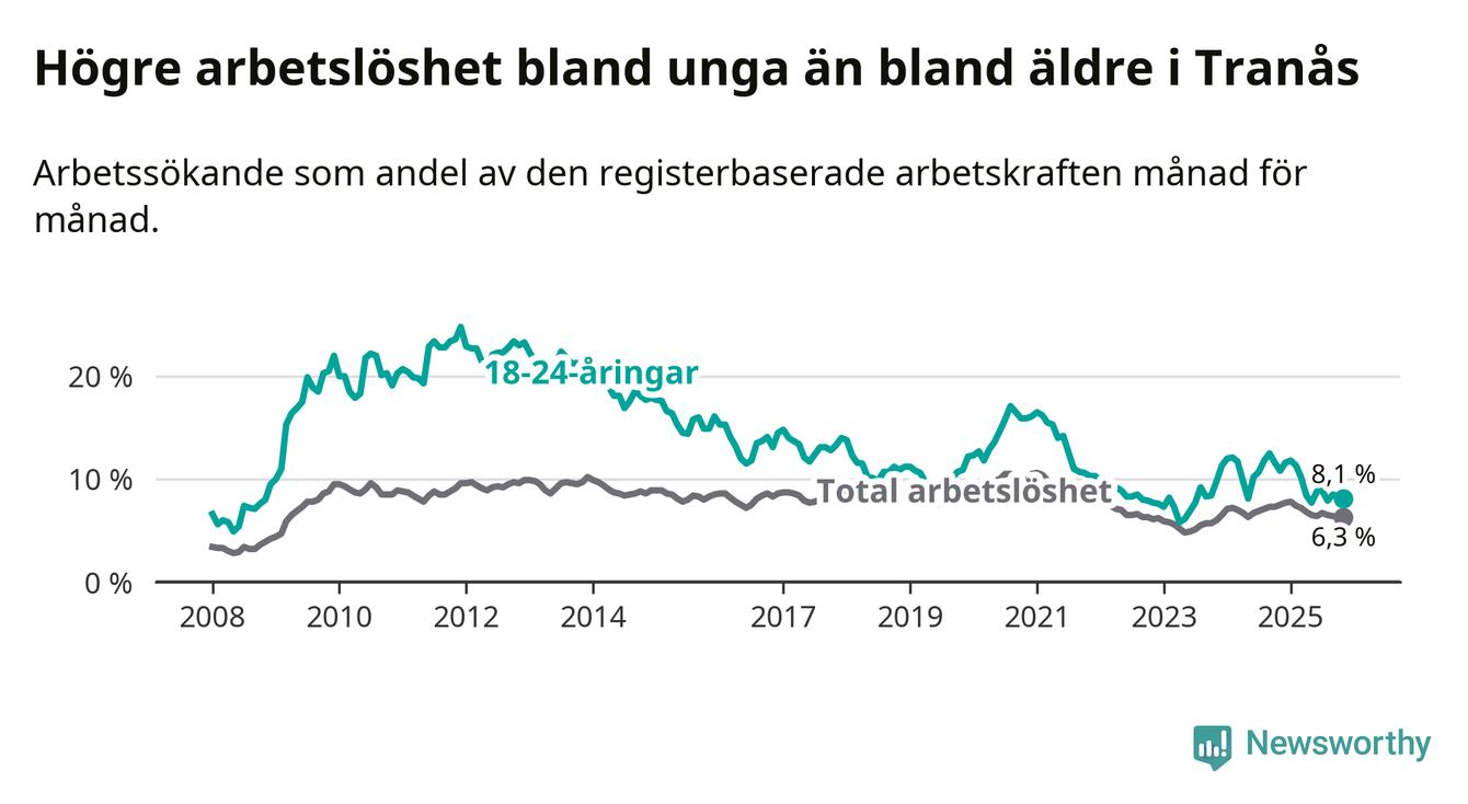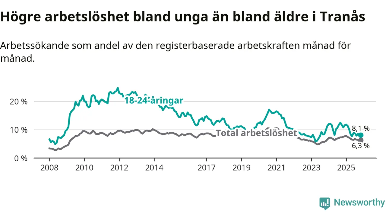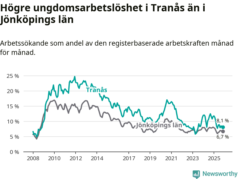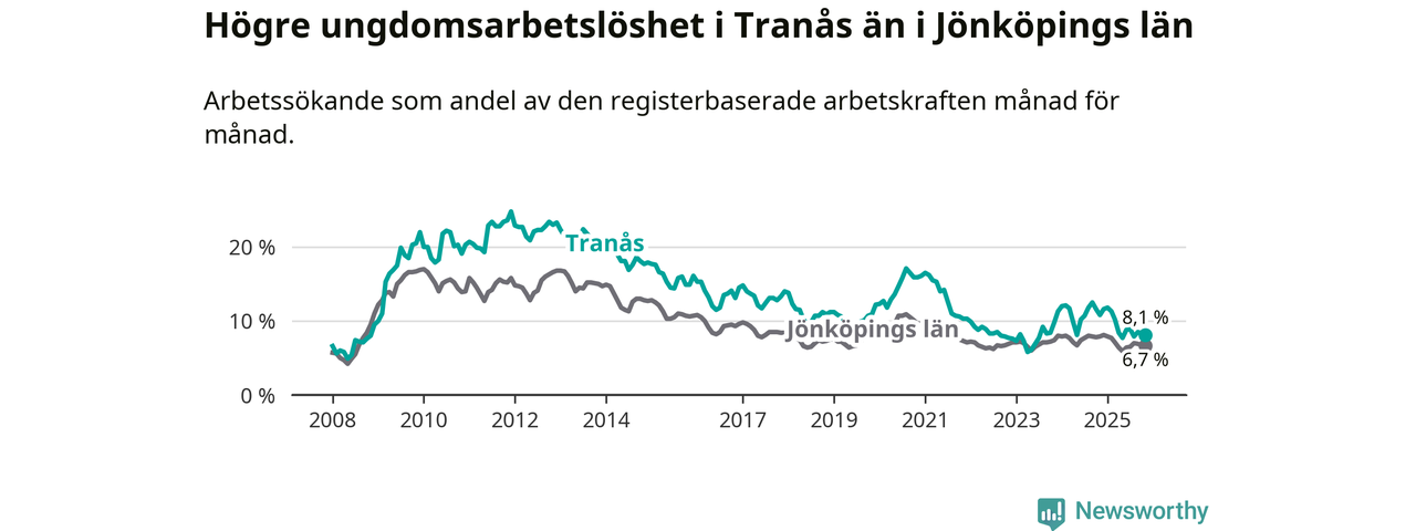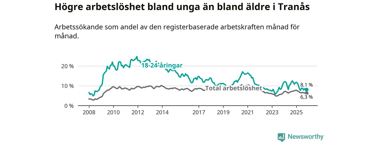 I och med den senaste månadens nedgång har de ungas arbetslöshet i Tranås sjunkit elva månader i följd (ner från 11,6 procent i december 2024 till 8,1 procent nu).