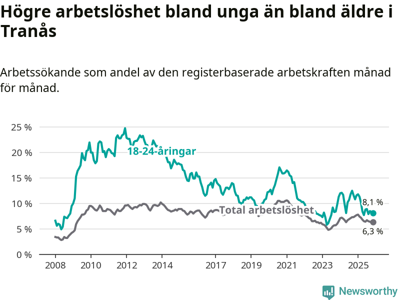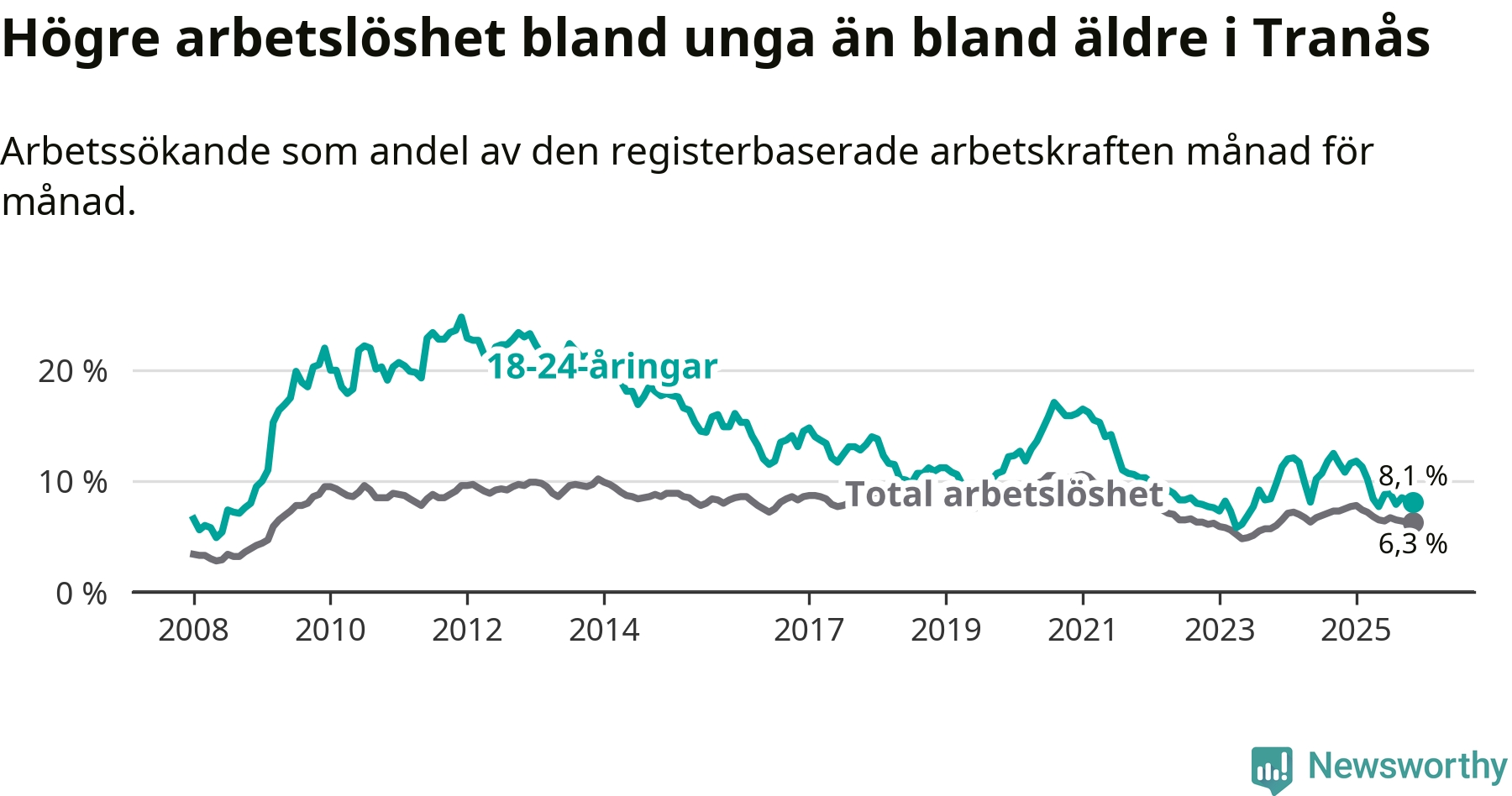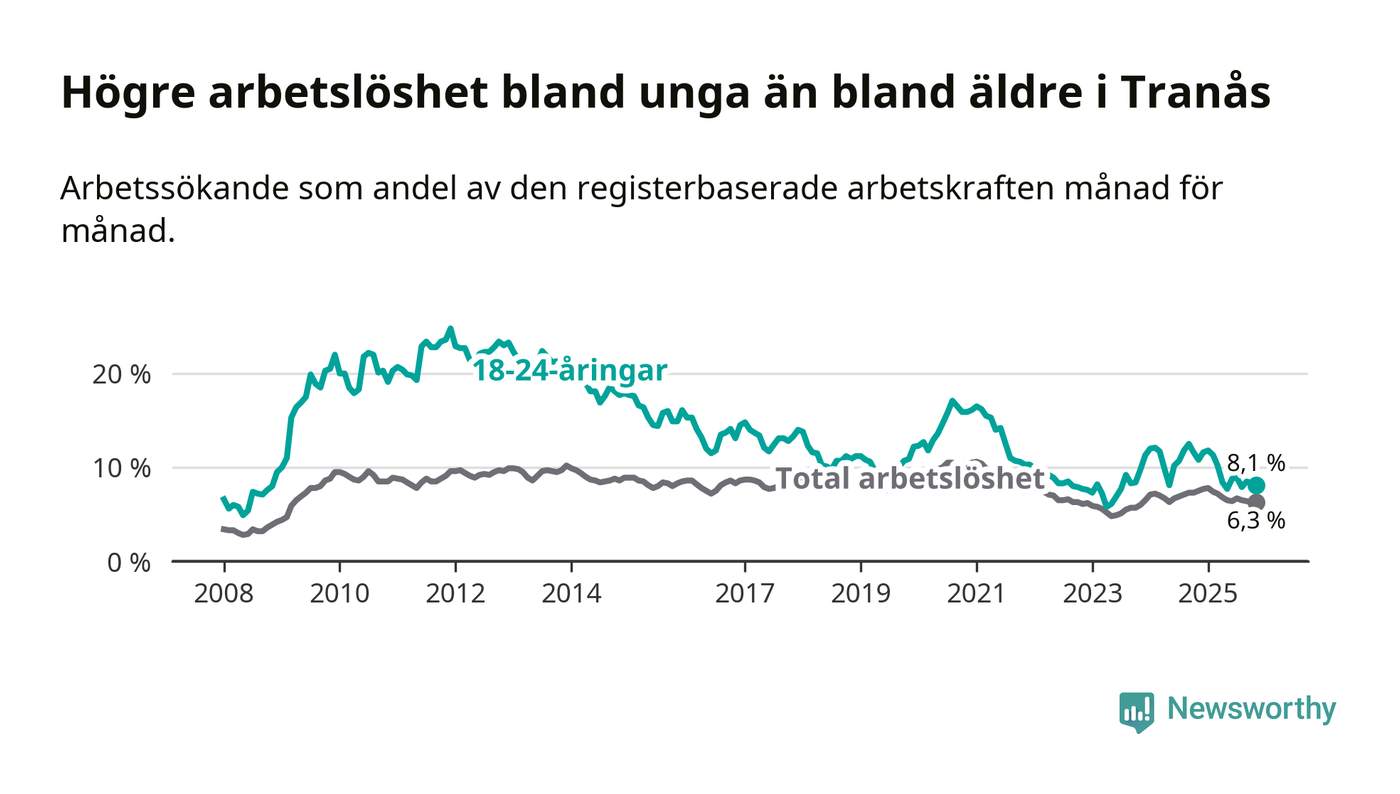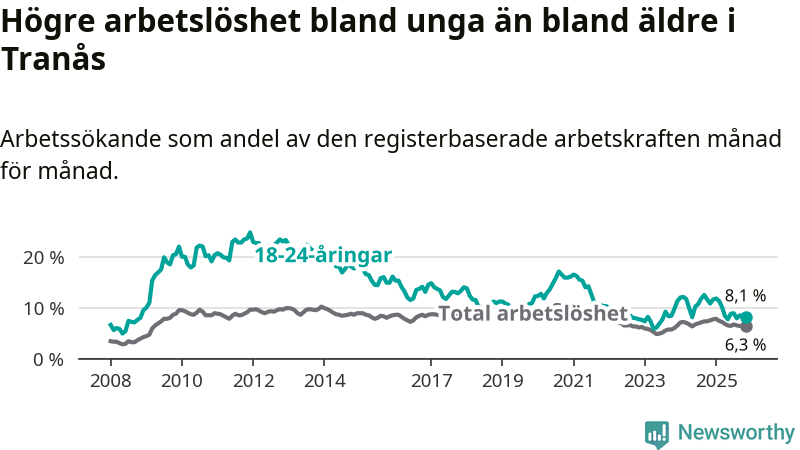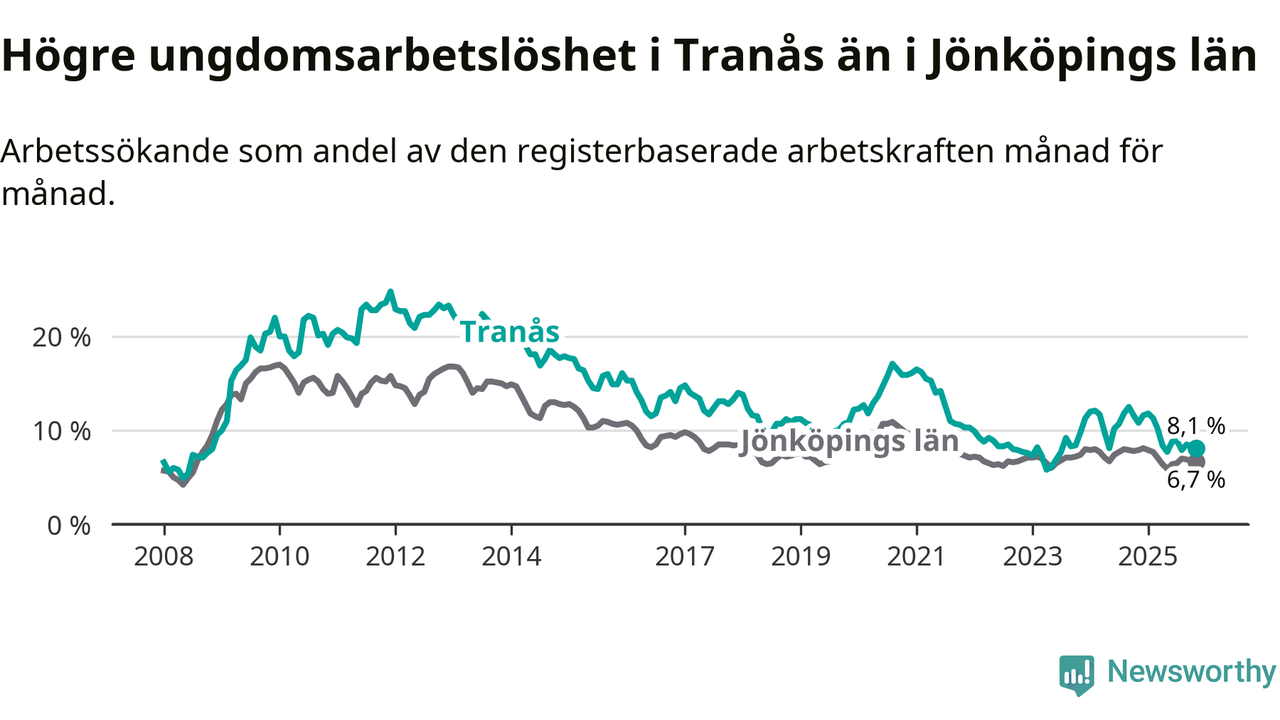 I och med den senaste månadens nedgång har de ungas arbetslöshet i Tranås sjunkit elva månader i följd (ner från 11,6 procent i december 2024 till 8,1 procent nu).