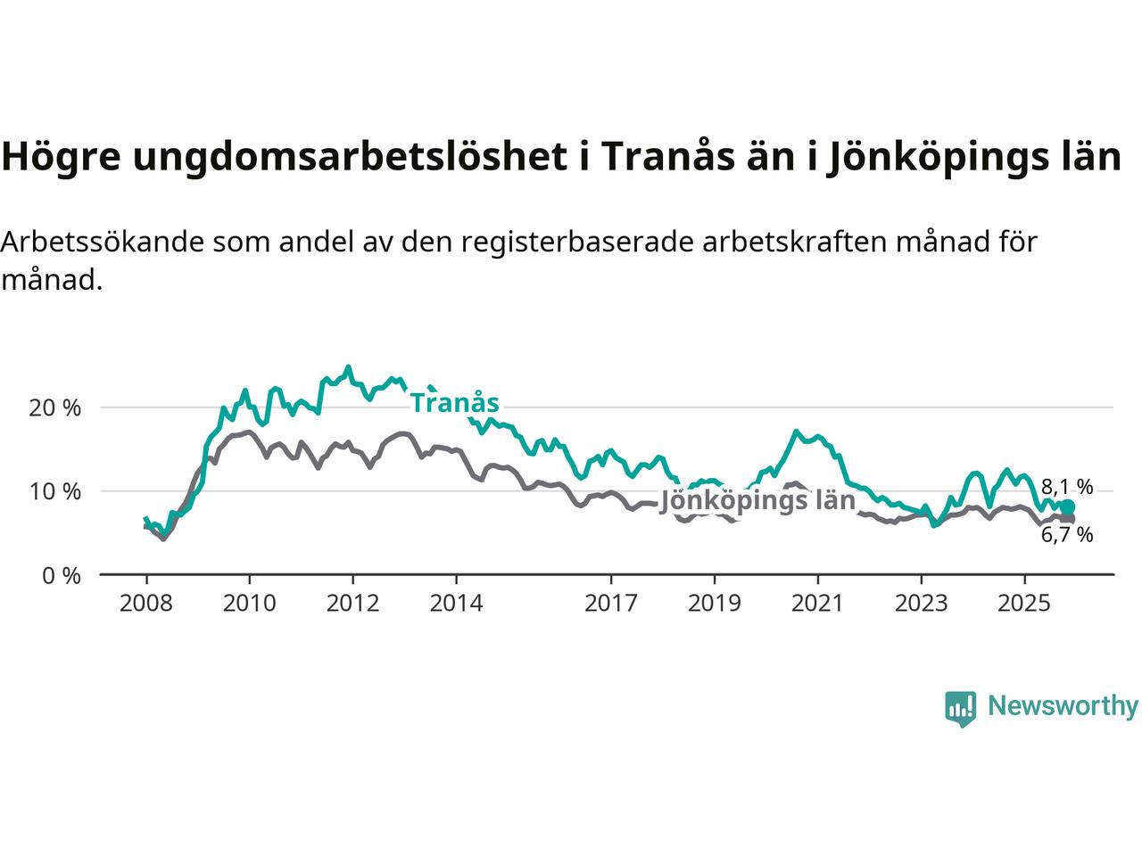 Precis som den totala arbetslösheten ligger ungdomsarbetslösheten i Tranås högre än i Jönköpings län som helhet. Skillnaden mellan kommunen och länet är 1,4 procentenheter.