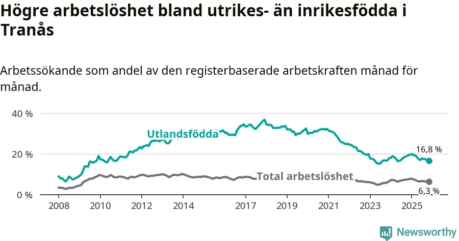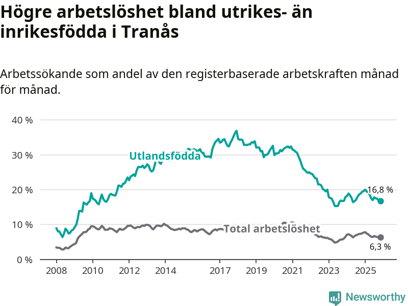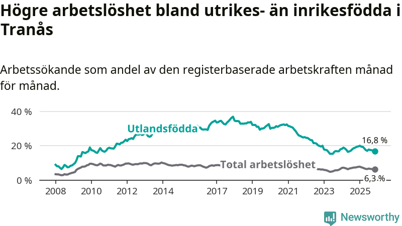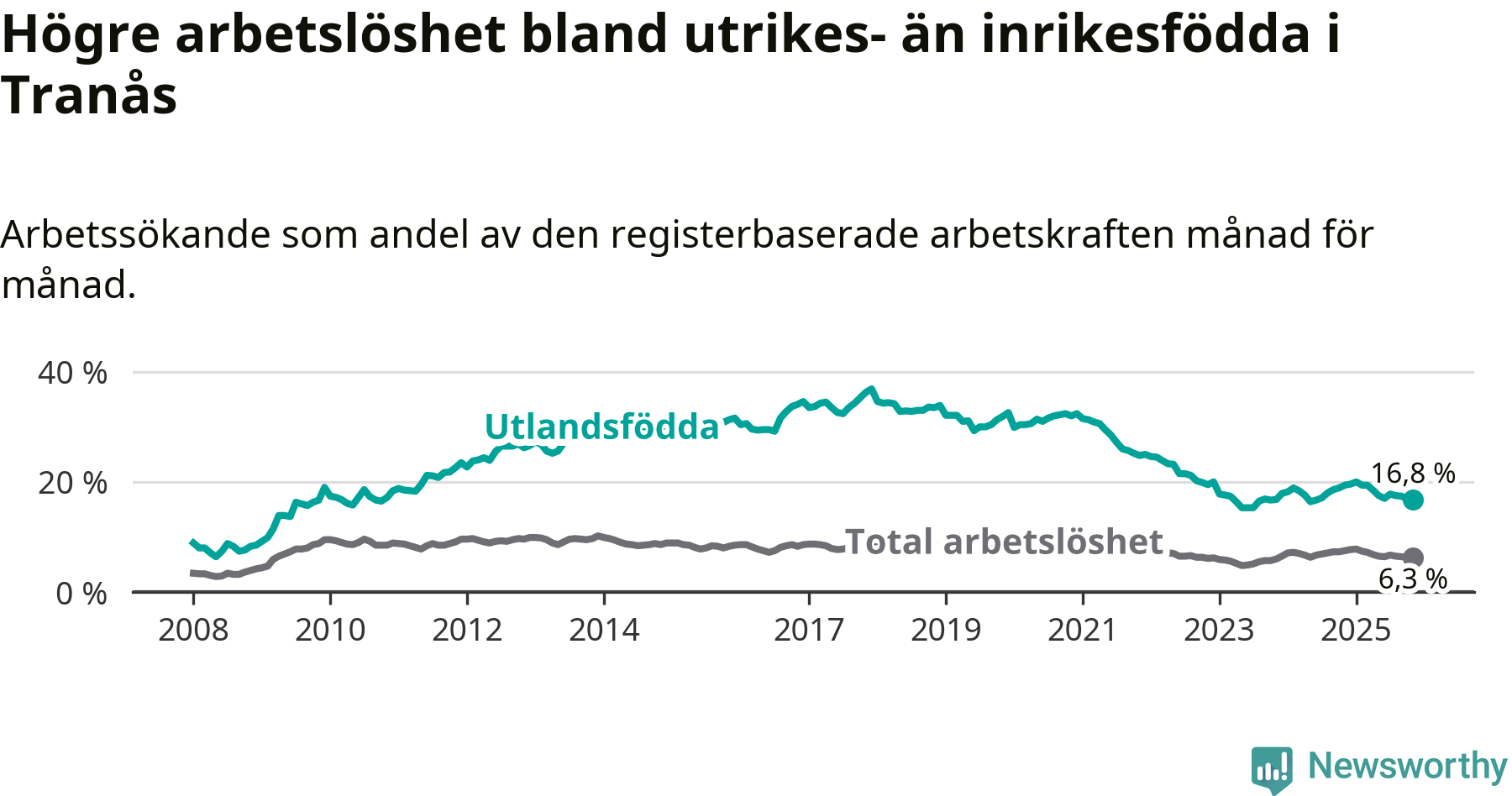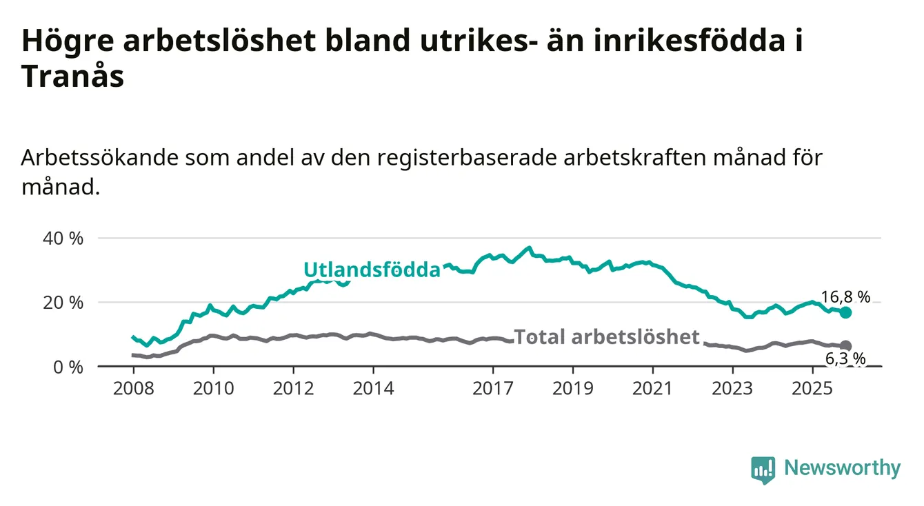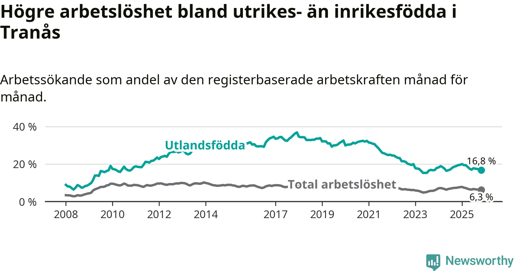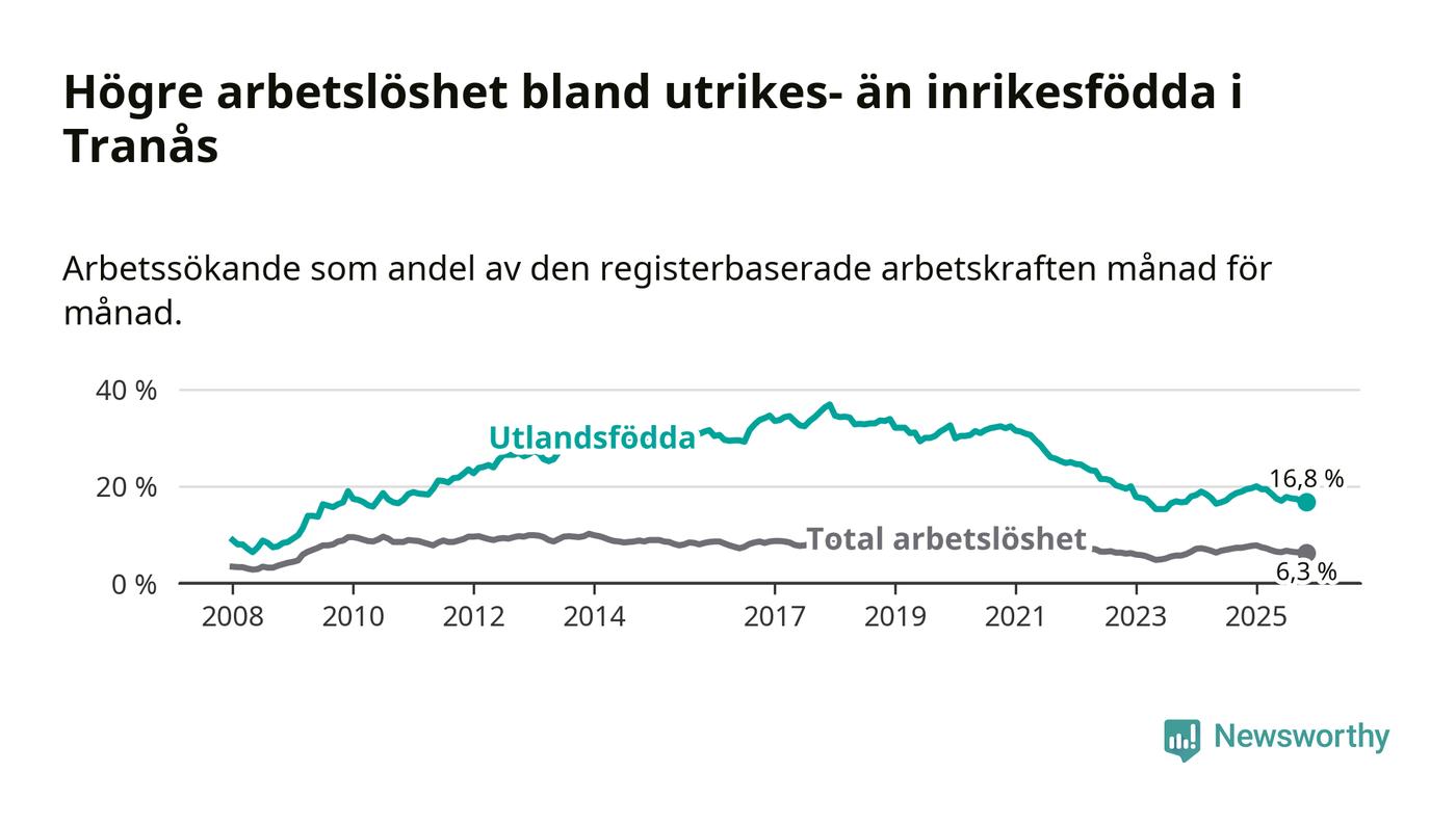 Arbetslösheten bland utlandsfödda var 16,8 procent i Tranås under november månad, motsvarande 297 av 1 768 personer. Det är 2,6 procentenheter färre än vid samma tidpunkt i fjol (−53 om man räknar personer).
