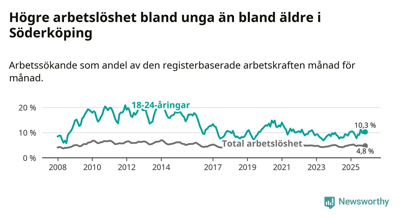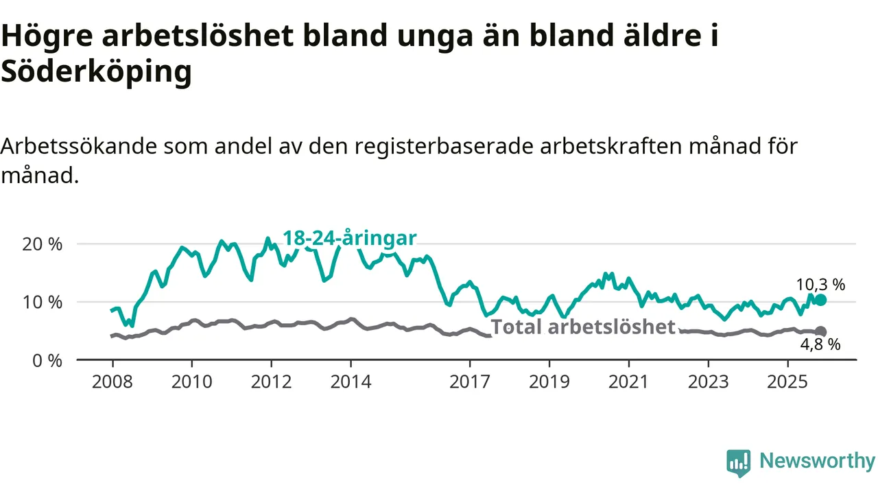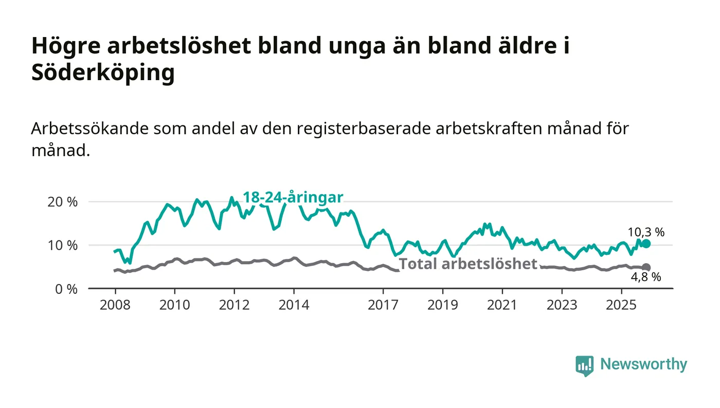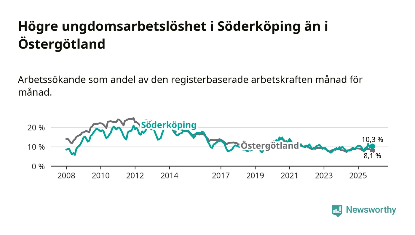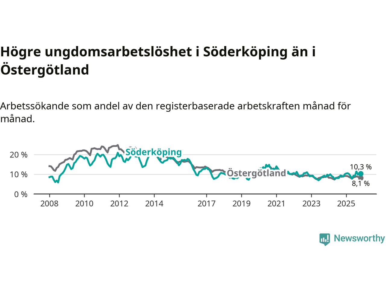 I och med den senaste månadens uppgång har de ungas arbetslöshet i Söderköping stigit 13 månader i följd (upp från 9,2 procent i oktober 2024 till 10,3 procent nu).