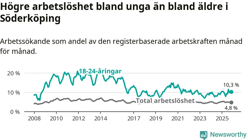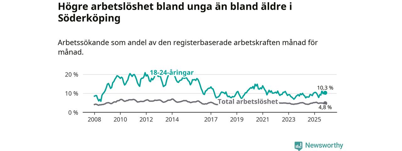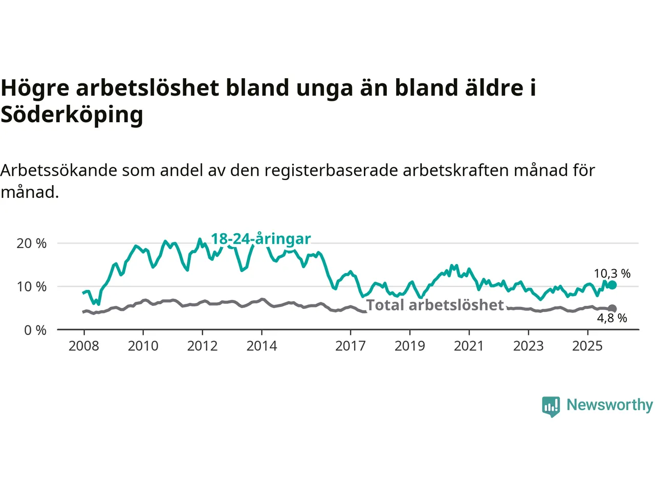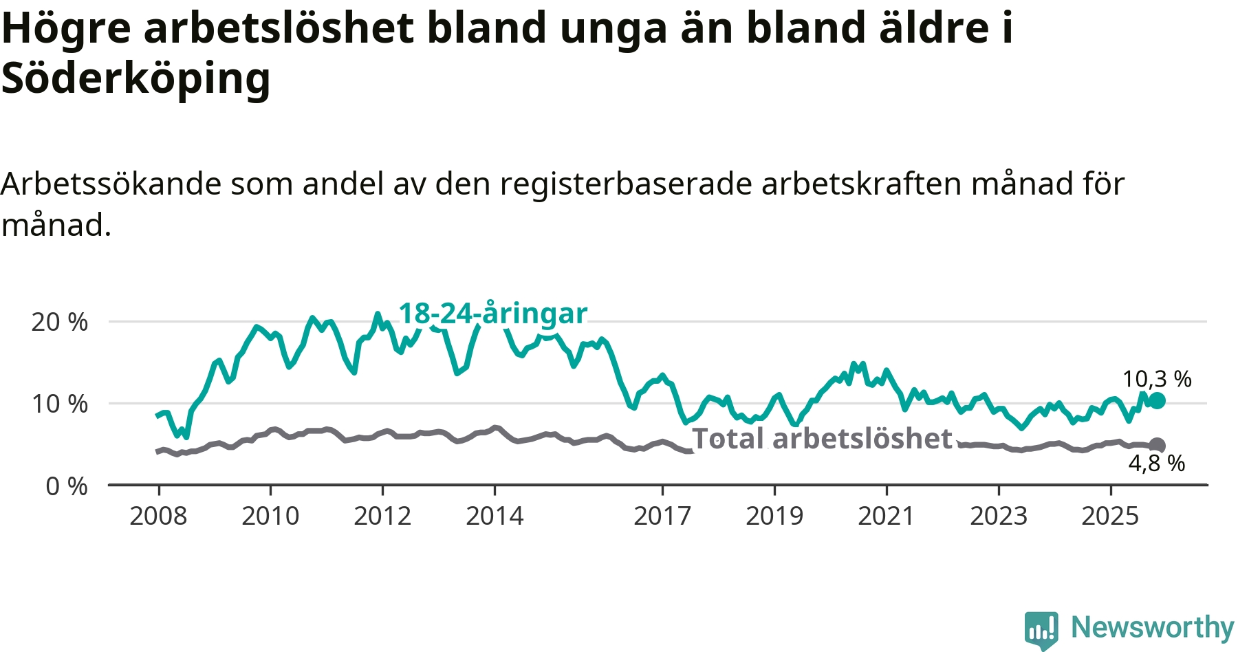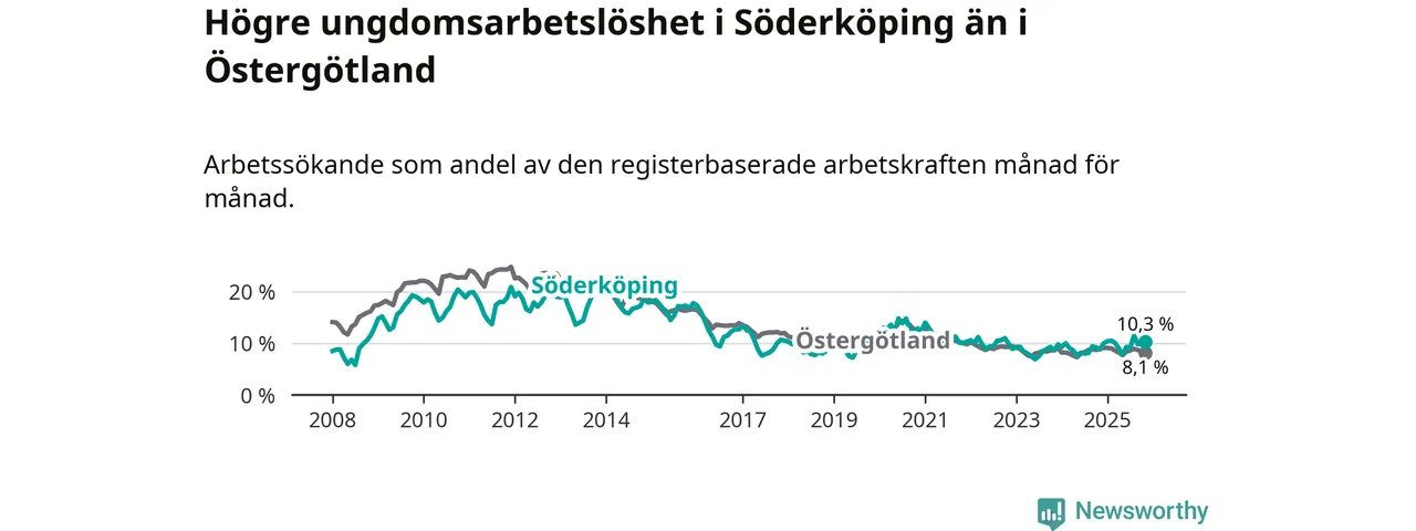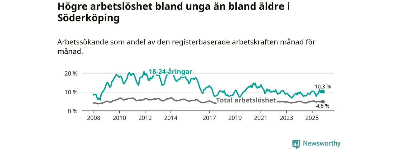 I och med den senaste månadens uppgång har de ungas arbetslöshet i Söderköping stigit 13 månader i följd (upp från 9,2 procent i oktober 2024 till 10,3 procent nu).