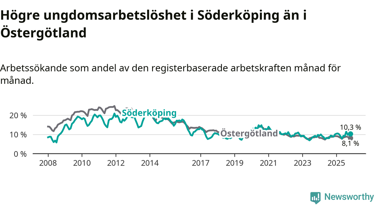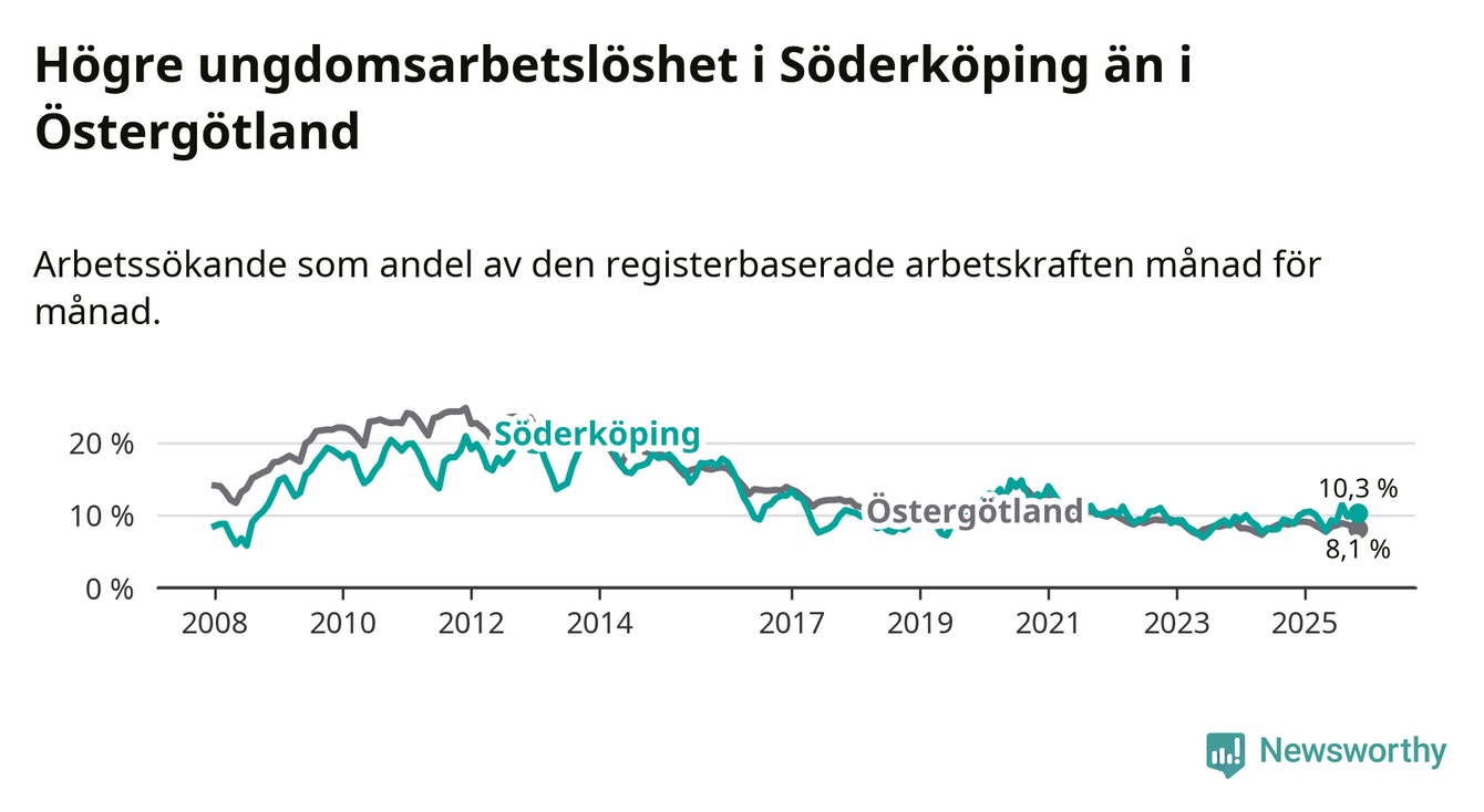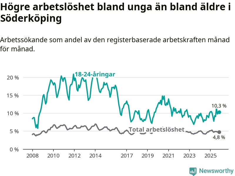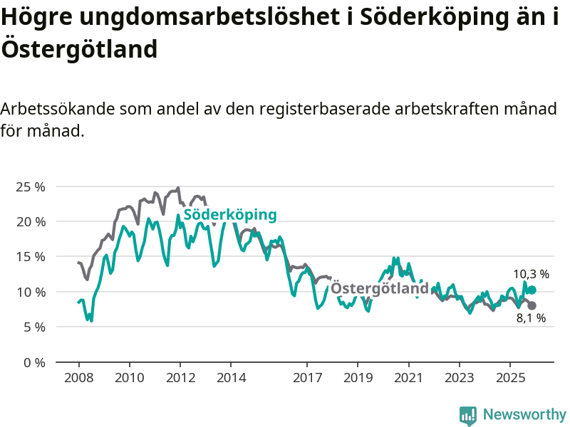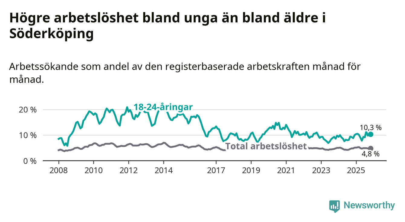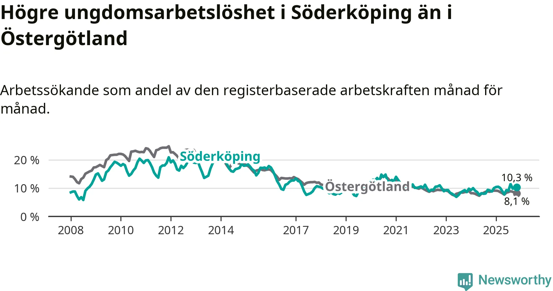 I och med den senaste månadens uppgång har de ungas arbetslöshet i Söderköping stigit 13 månader i följd (upp från 9,2 procent i oktober 2024 till 10,3 procent nu).