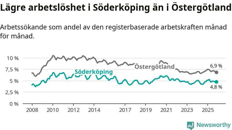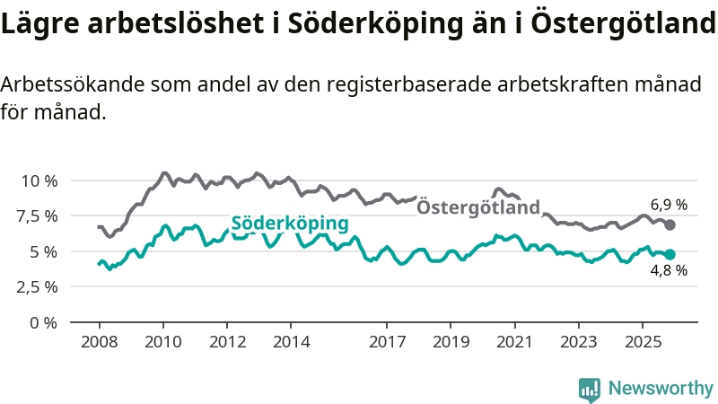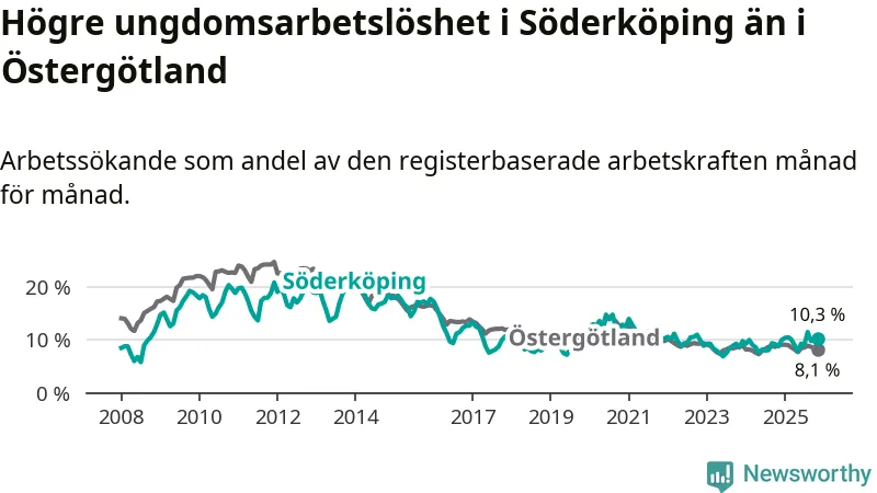 Medan Söderköping har lägre total arbetslöshet än Östergötland, ligger ungdomsarbetslösheten 2,2 procentenheter högre i Söderköping.