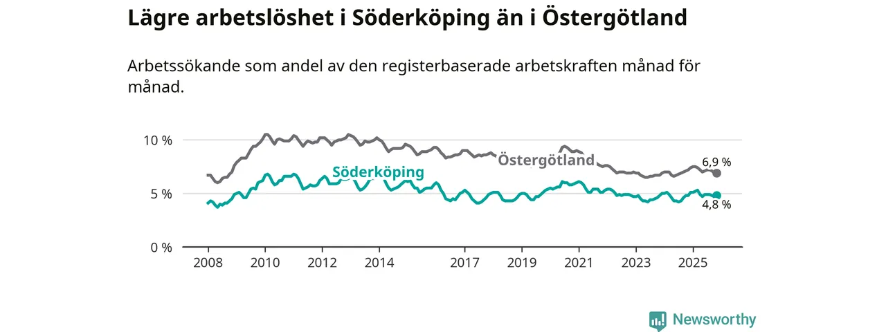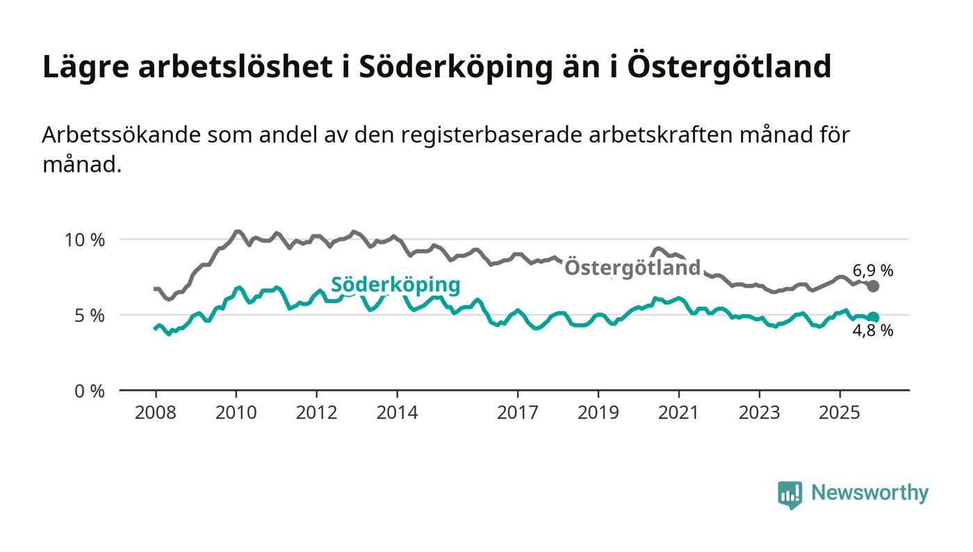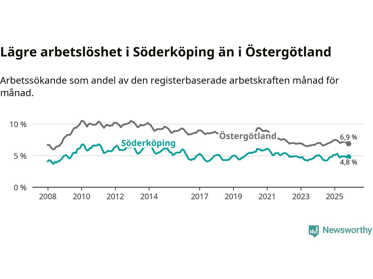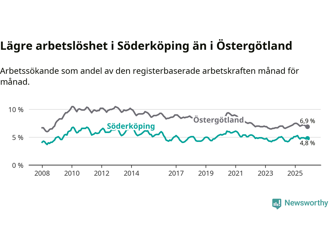 I de flesta andra kommuner i länet går arbetslösheten nedåt. Störst är minskningen i Motala, där arbetslösheten sjunker med 0,9 procentenheter. I tabellen längre ner ser du utvecklingen i samtliga kommuner i länet.