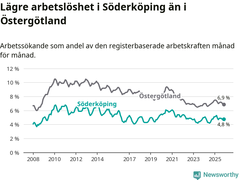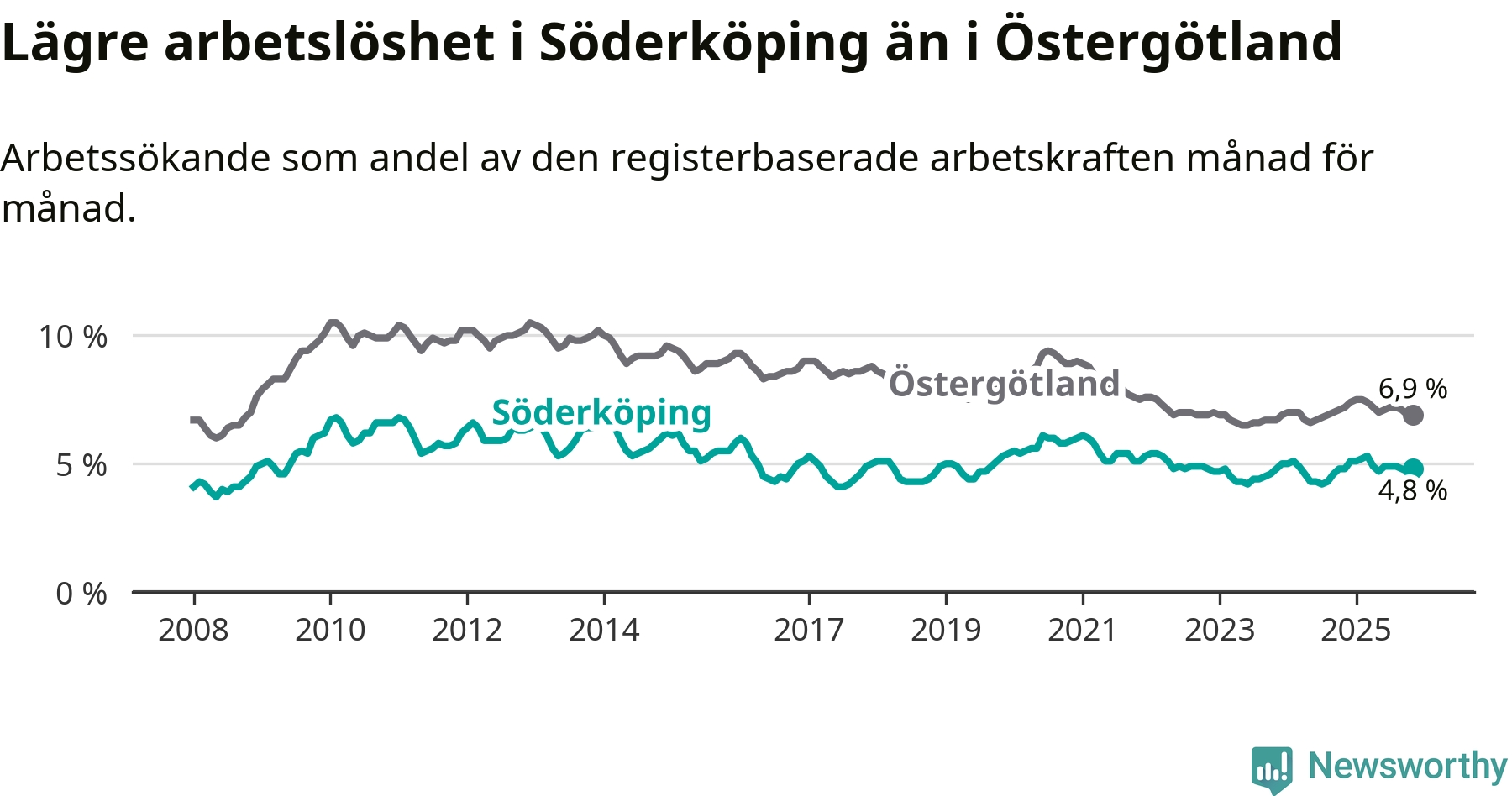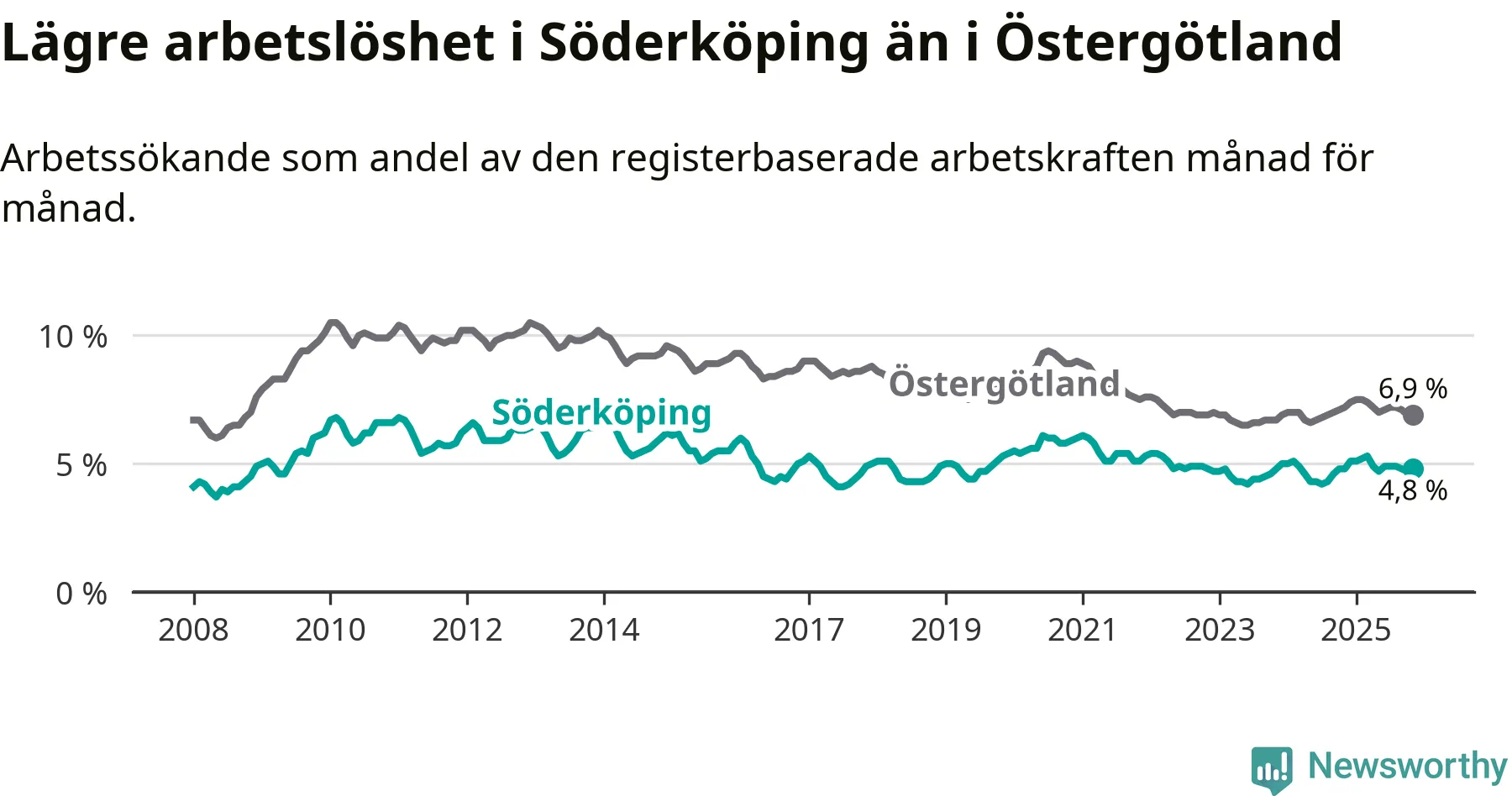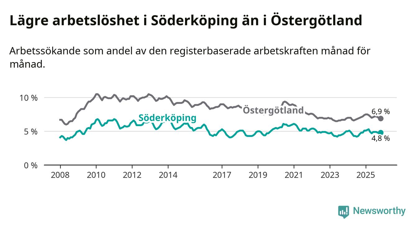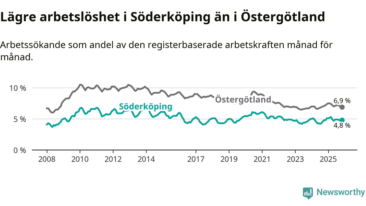 I de flesta andra kommuner i länet går arbetslösheten nedåt. Störst är minskningen i Motala, där arbetslösheten sjunker med 0,9 procentenheter. I tabellen längre ner ser du utvecklingen i samtliga kommuner i länet.