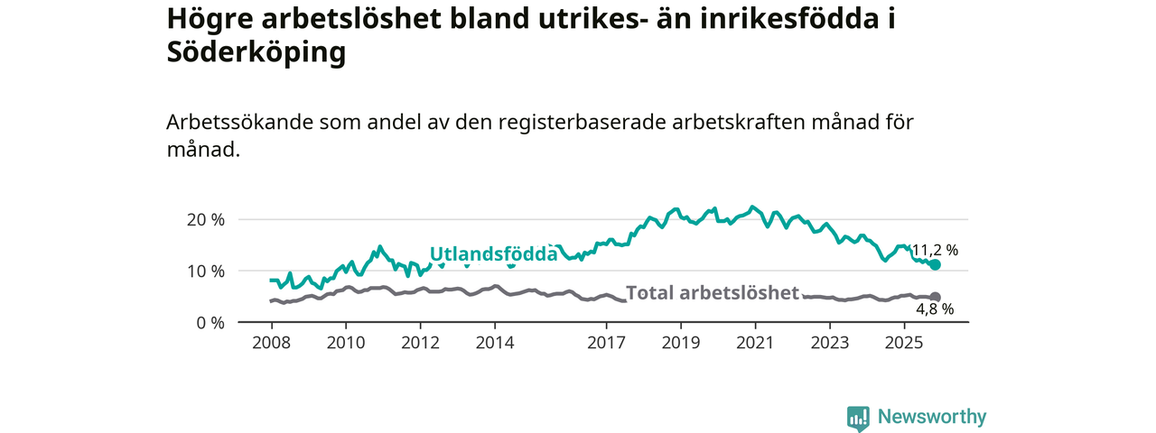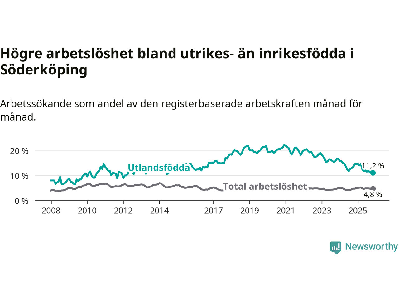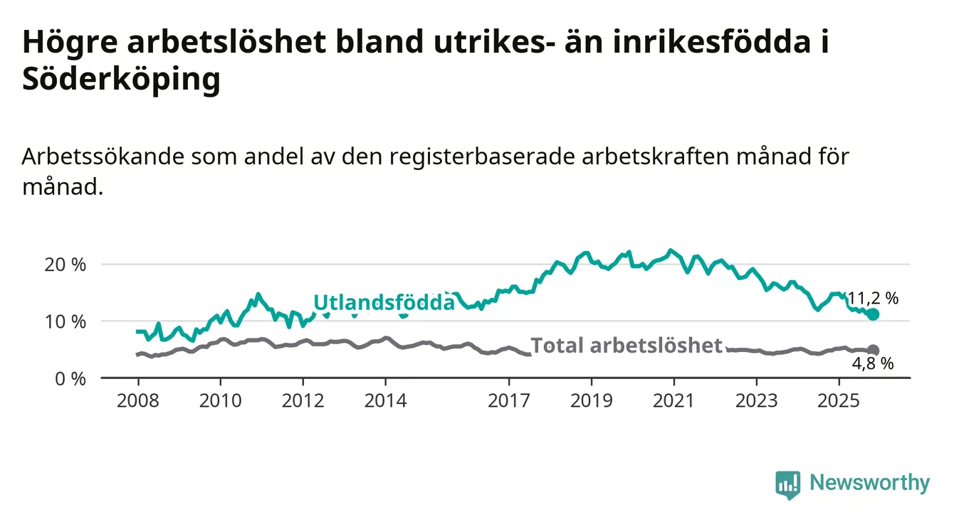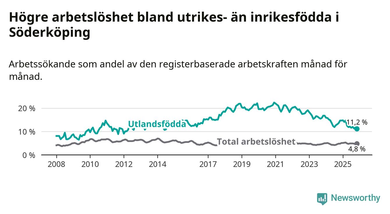 Arbetslösheten bland utlandsfödda var 11,2 procent i Söderköping under november månad, motsvarande 64 av 571 personer. Det är 3,5 procentenheter färre än vid samma tidpunkt i fjol (−23 om man räknar personer). Därmed har de utlandsföddas arbetslöshet varit lägre än vid samma tidpunkt i fjol i över tre år i sträck. Sedan november 2022 har arbetslösheten bland utlandsfödda minskat från 18,6 till 11,2 procent. Den nuvarande arbetslöshetsnivån är den lägsta sedan juli 2014.