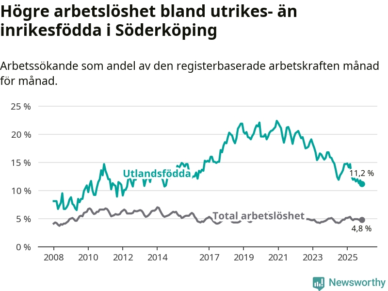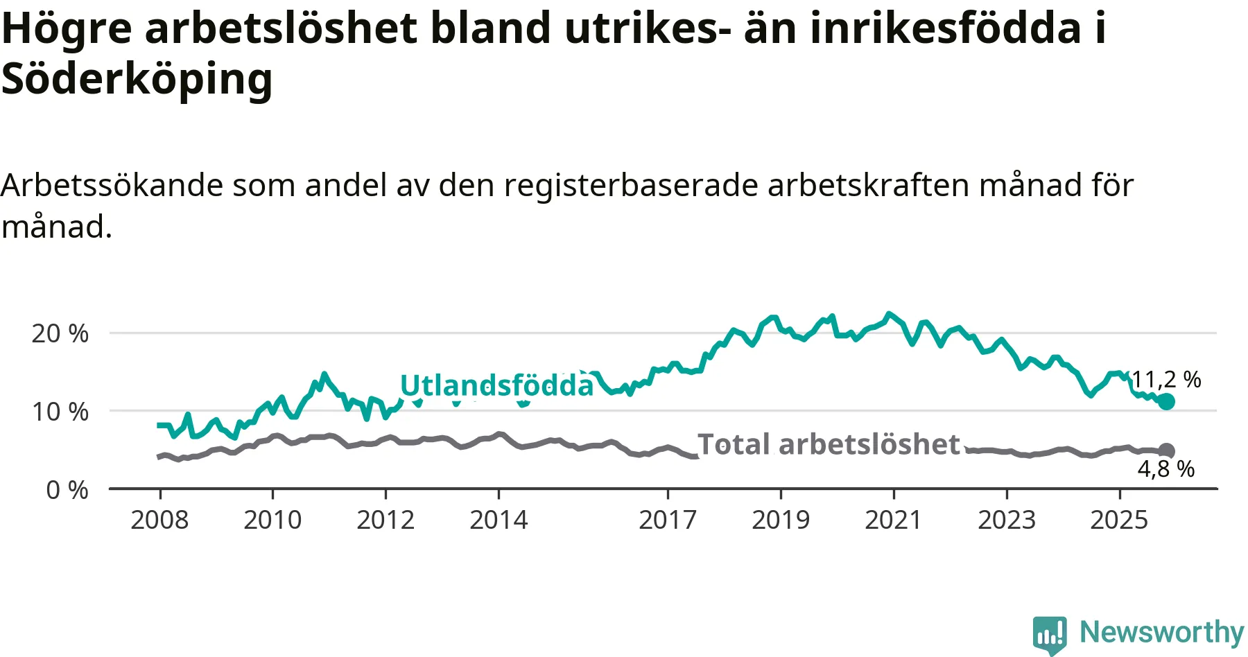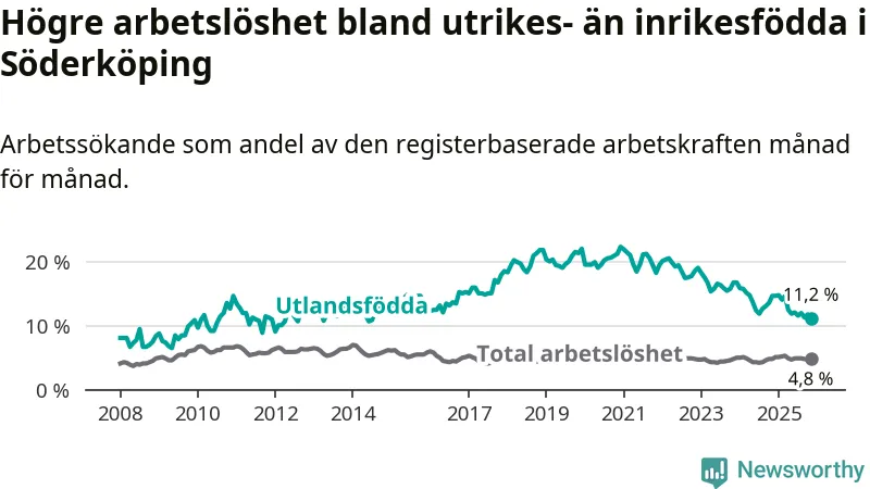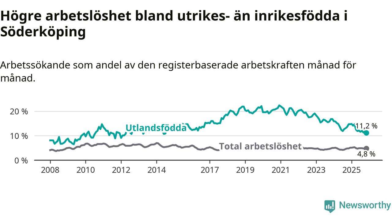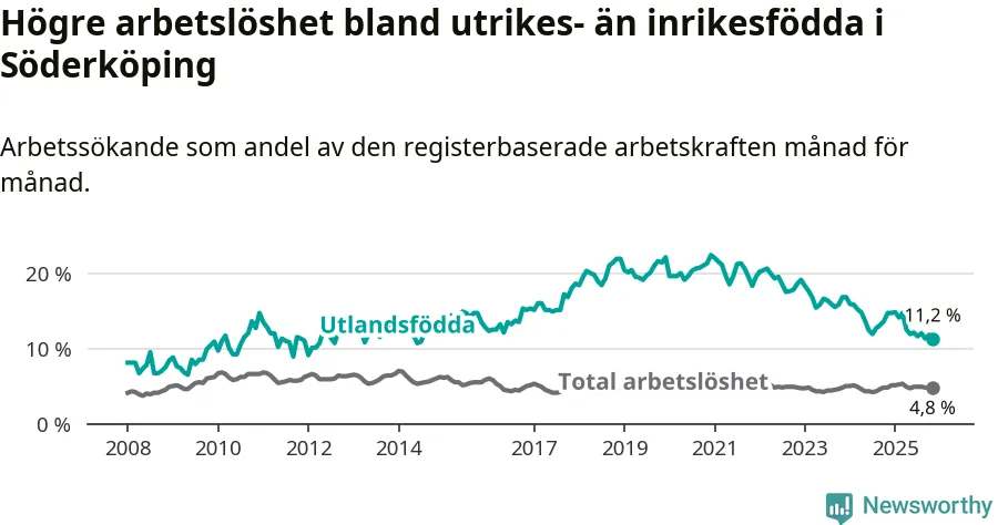 Arbetslösheten bland utlandsfödda var 11,2 procent i Söderköping under november månad, motsvarande 64 av 571 personer. Det är 3,5 procentenheter färre än vid samma tidpunkt i fjol (−23 om man räknar personer). Därmed har de utlandsföddas arbetslöshet varit lägre än vid samma tidpunkt i fjol i över tre år i sträck. Sedan november 2022 har arbetslösheten bland utlandsfödda minskat från 18,6 till 11,2 procent. Den nuvarande arbetslöshetsnivån är den lägsta sedan juli 2014.